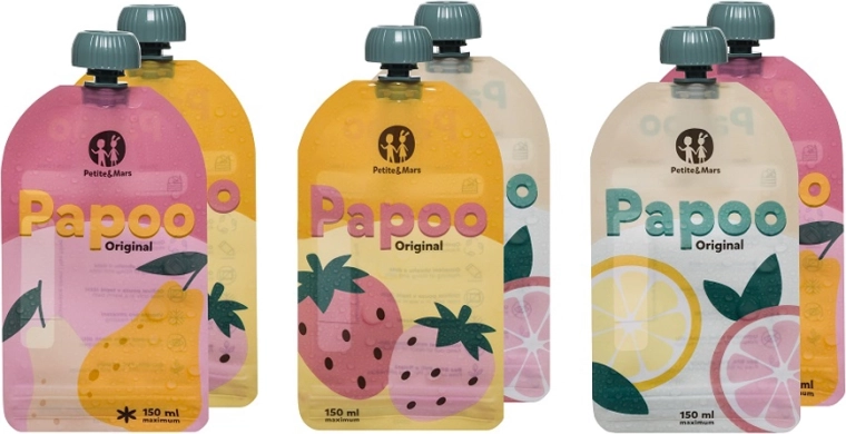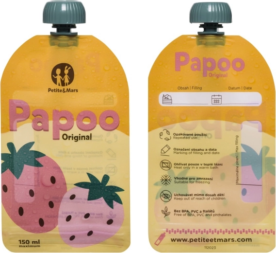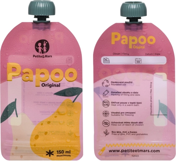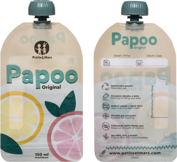 Praktyczne i ekologiczne saszetki PETITE&MARS Papoo Original o pojemności 150 ml są idealne na musy, przeciery i jogurty w podróży. Można je wielokrotnie używać, myć w zmywarce, mrozić i łatwo opisywać. Bez szkodliwych substancji BPA, PVC i ftalanów, zaprojektowane tak, by dzieci mogły samodzielnie i wygodnie jeść bez bałaganu.