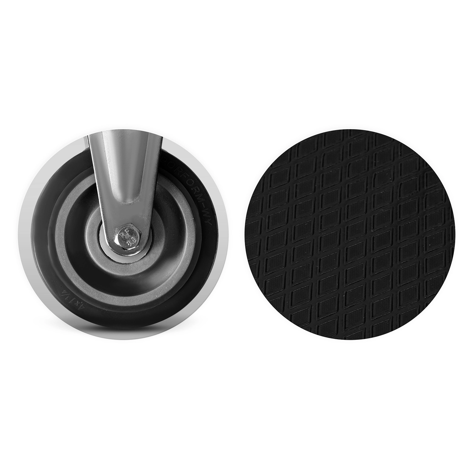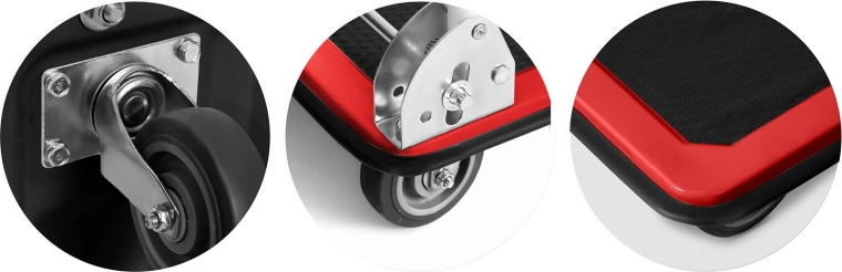 W pełni obrotowe gumowe koła oraz składany uchwyt ułatwiają prowadzenie wózka i jego kompaktowe przechowywanie po pracy.