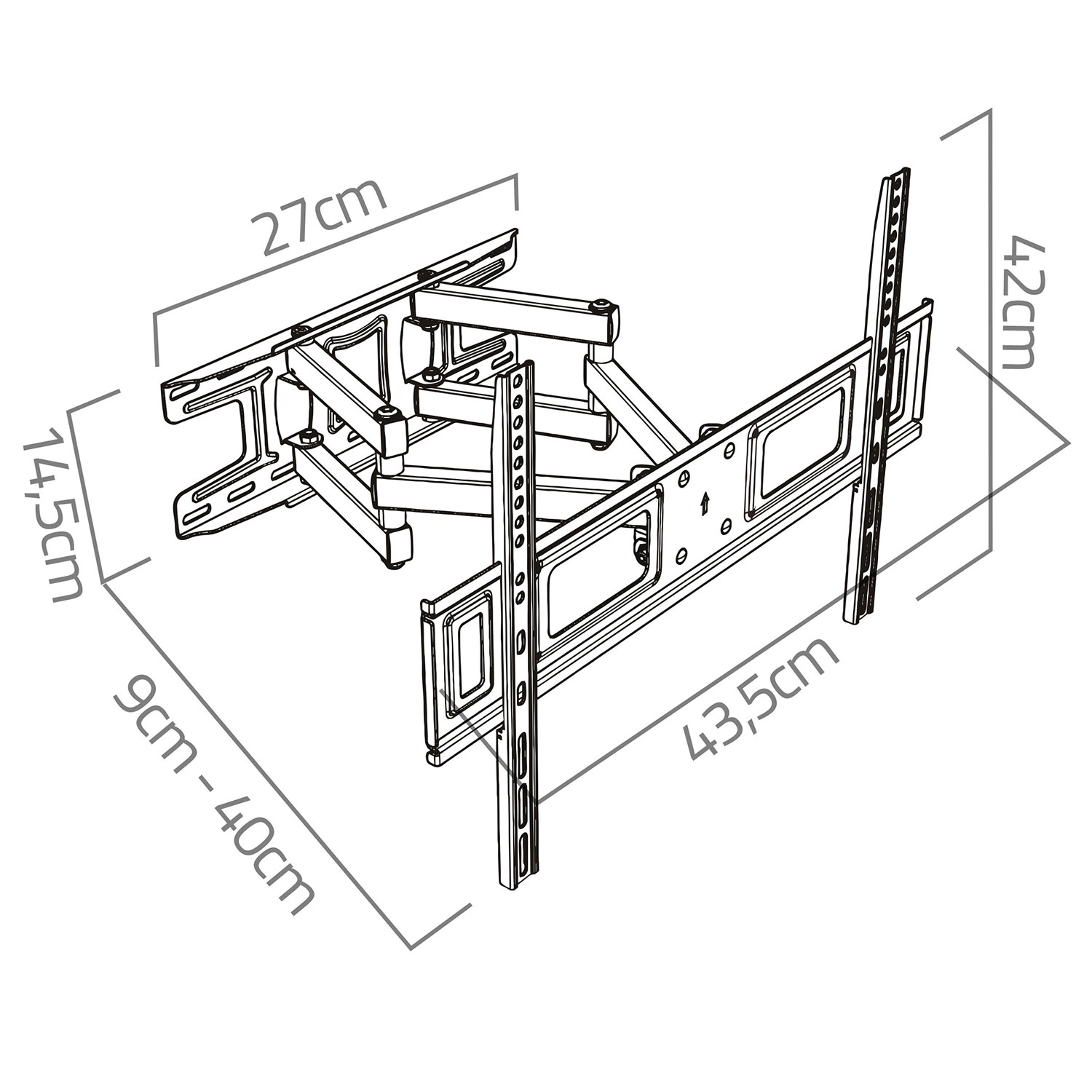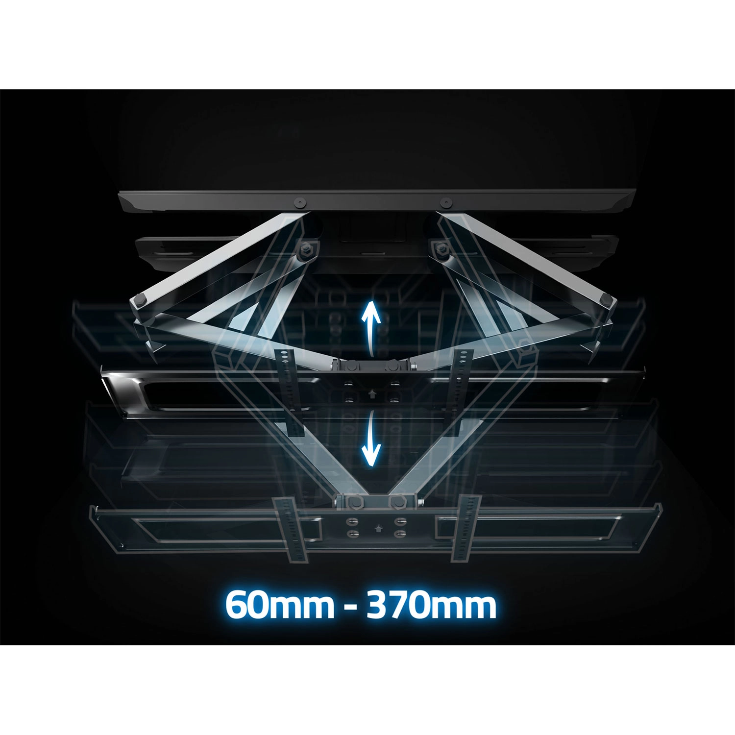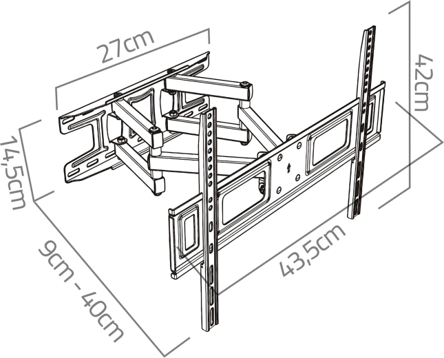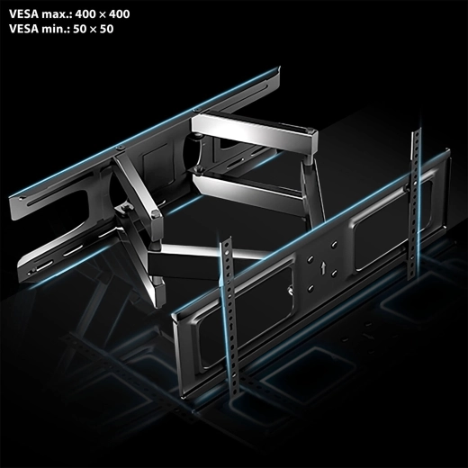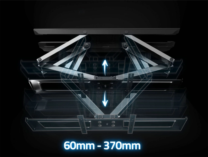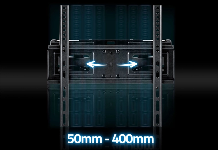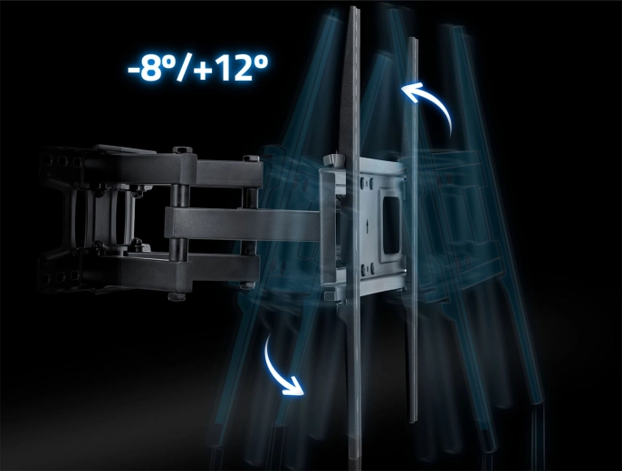 Dzięki rozbudowanym możliwościom regulacji z łatwością dopasujesz pozycję ekranu do przestrzeni i warunków oświetleniowych. Odległość od ściany można zmieniać w zakresie 6–37 cm, poziomy obrót do 120° obejmuje wiele stref widzenia, a pochylenie od -8° do +12° pomaga zminimalizować odblaski. Korekcja poziomu ±3° ułatwia precyzyjne wypoziomowanie po montażu.