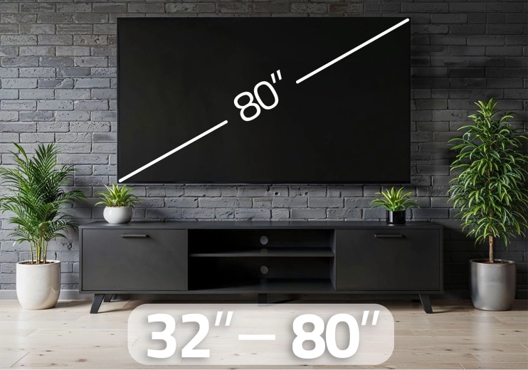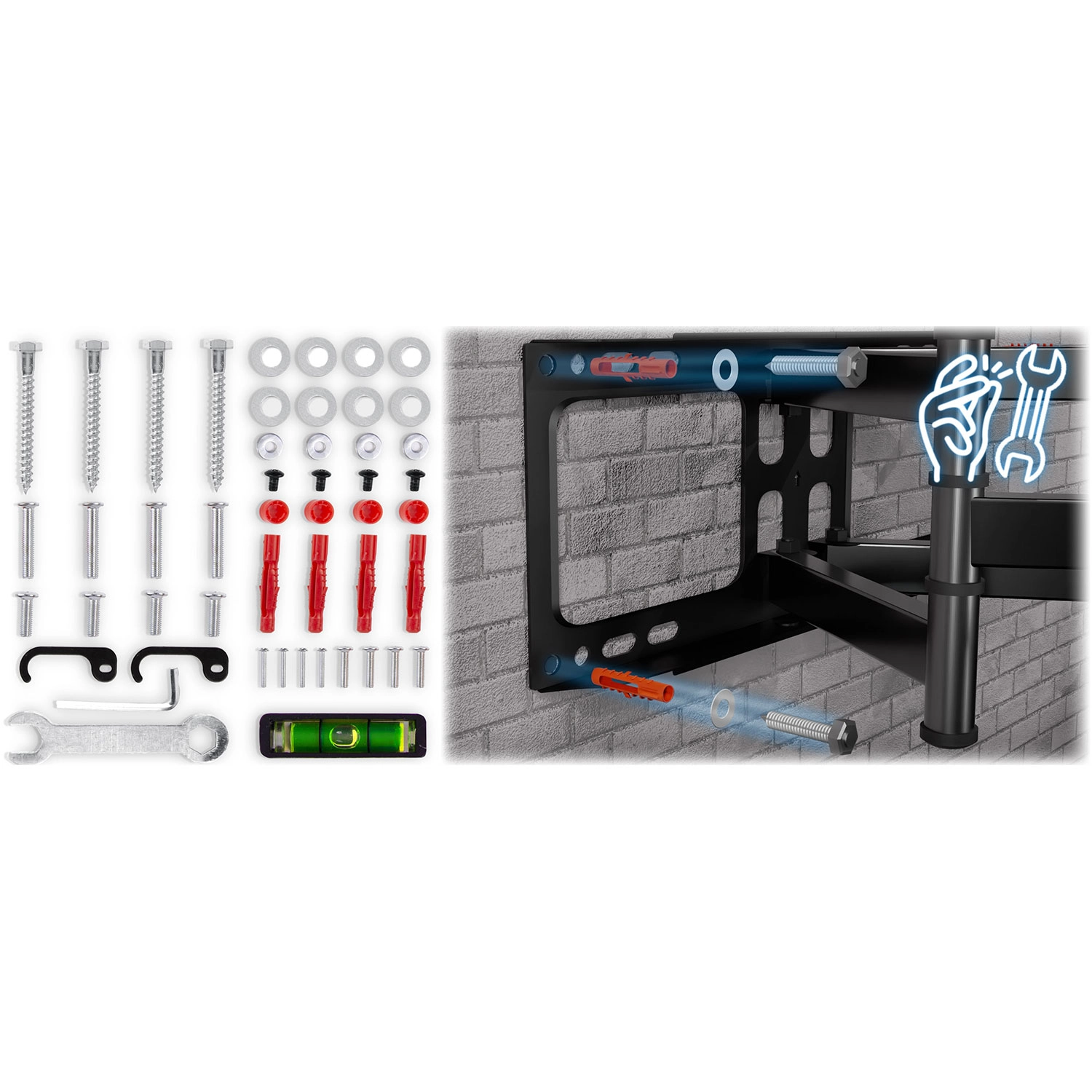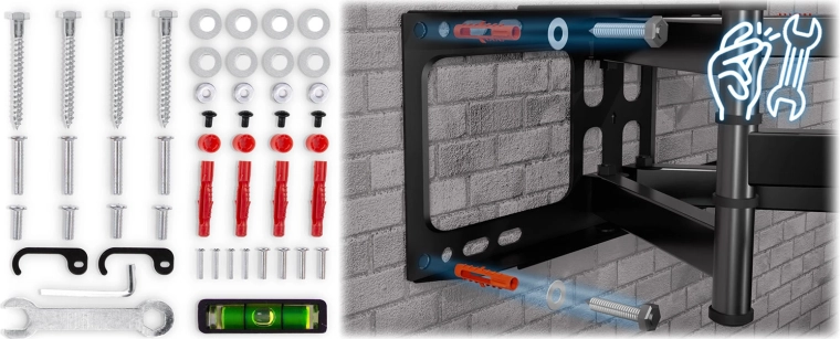 Kompatybilność VESA 200×200 do 600×400 obejmuje większość telewizorów 32–80". W zestawie znajdziesz kompletny osprzęt montażowy, w tym kołki rozporowe, śruby, podkładki, klucz oraz miniaturową poziomicę do precyzyjnej i szybkiej instalacji na ścianach betonowych, z płyt g-k oraz ceglanych.