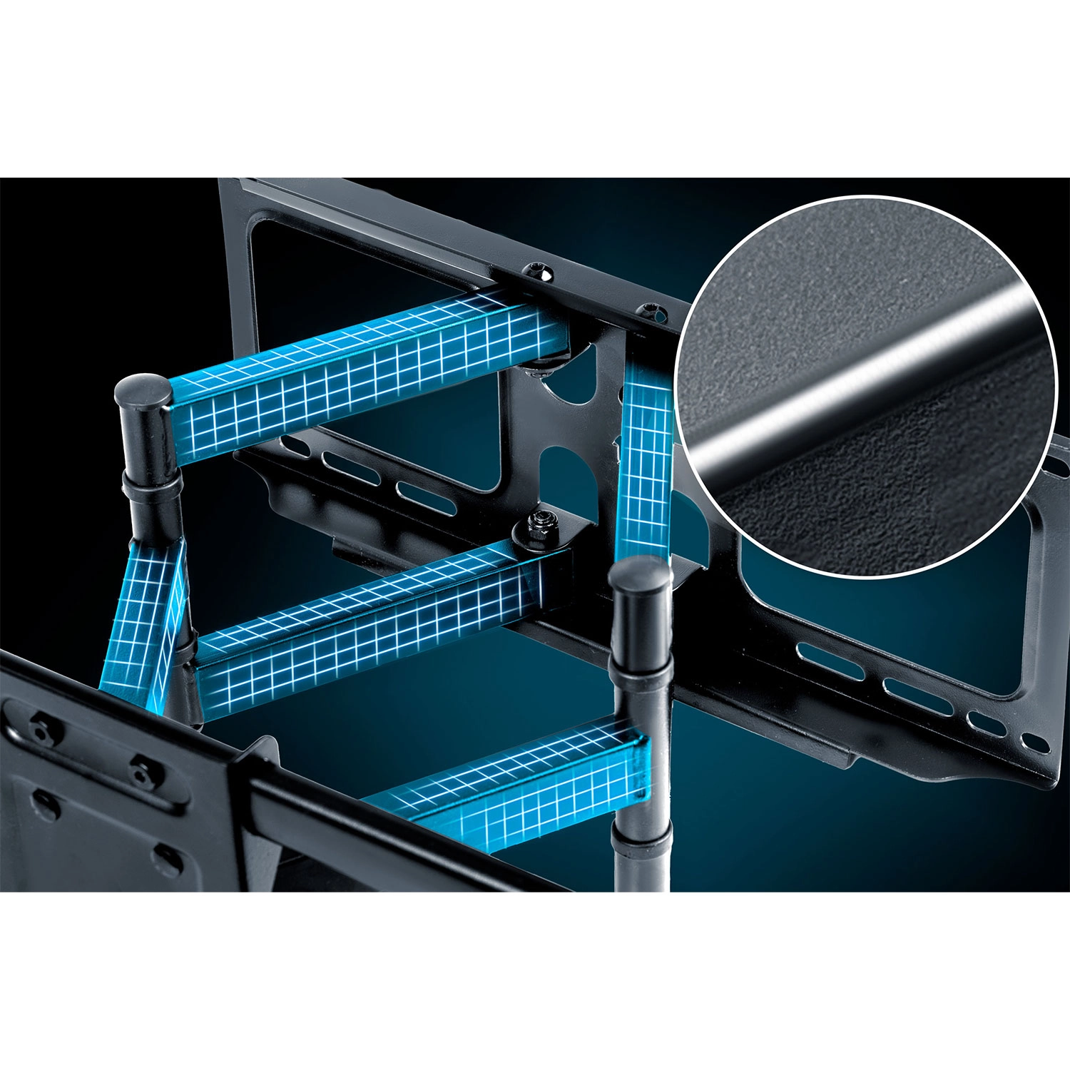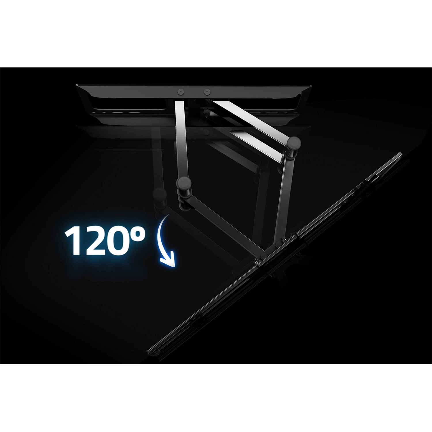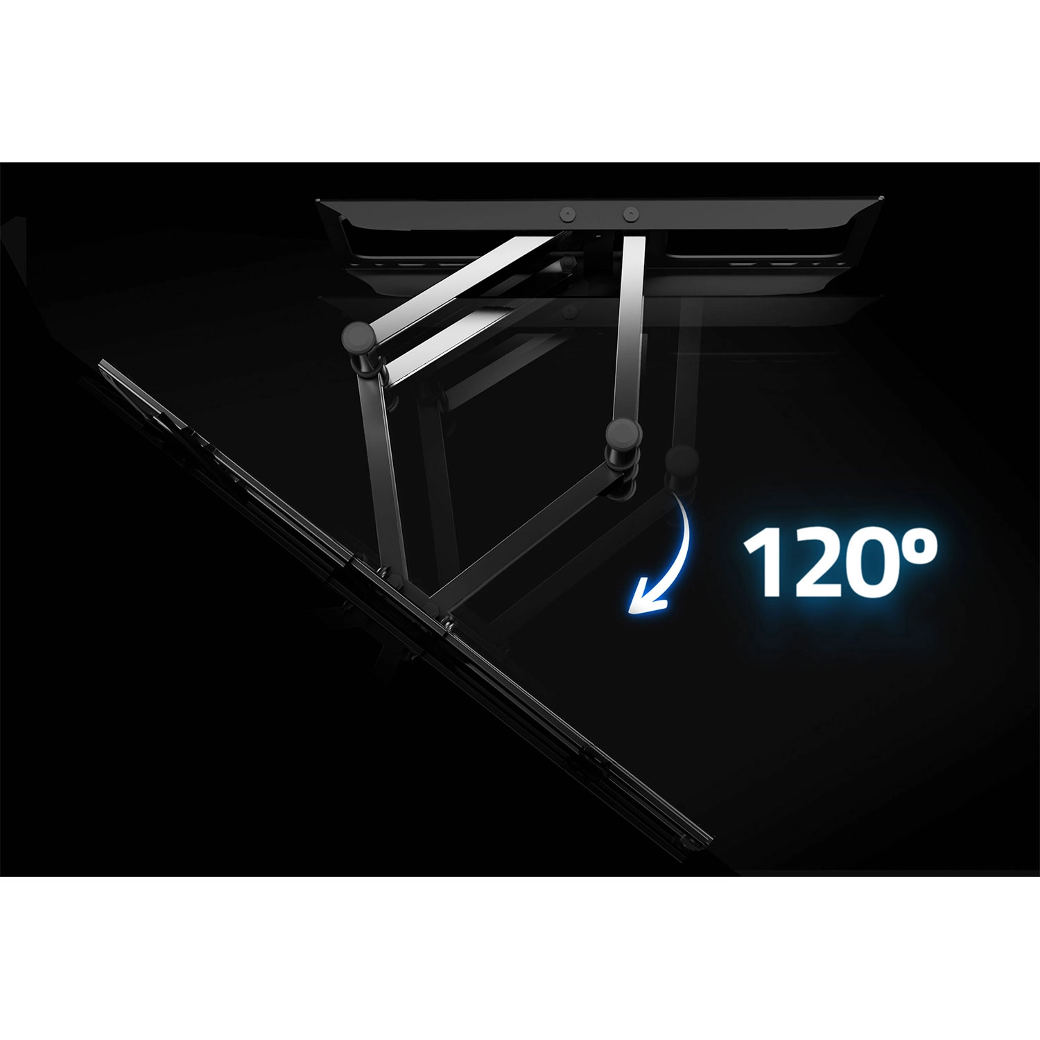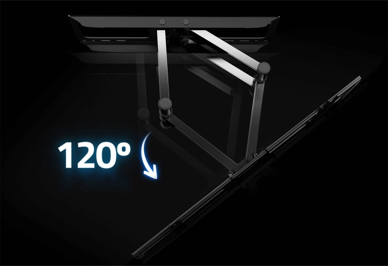 Ergonomiczna regulacja gwarantuje wygodne oglądanie z każdego miejsca: obrót do 120°, nachył -5° do 8° dla redukcji odblasków oraz korekcja ±3° dla perfekcyjnego wypoziomowania po montażu. Konstrukcja z stali malowanej proszkowo jest odporna na uszkodzenia i korozję, zapewniając długą żywotność.