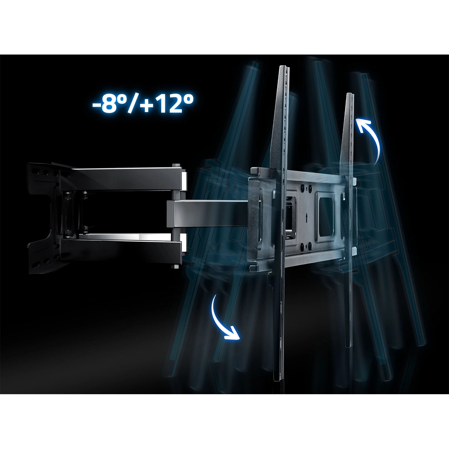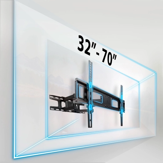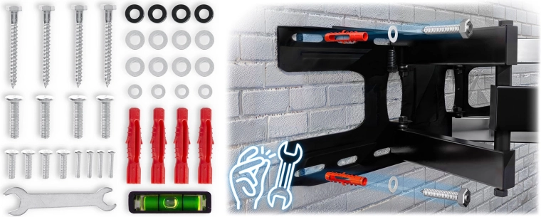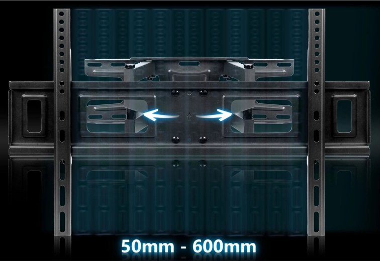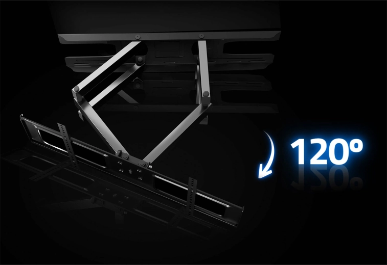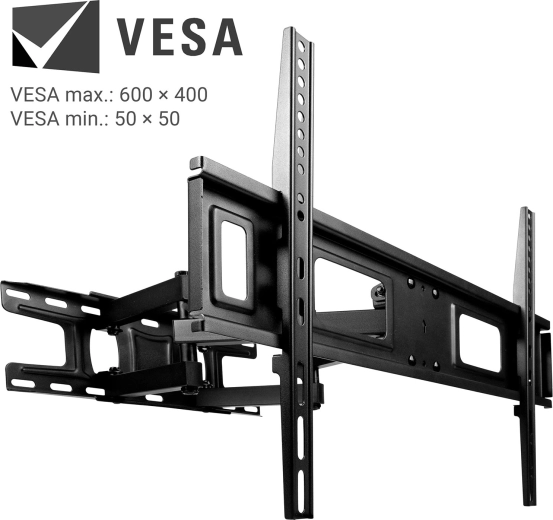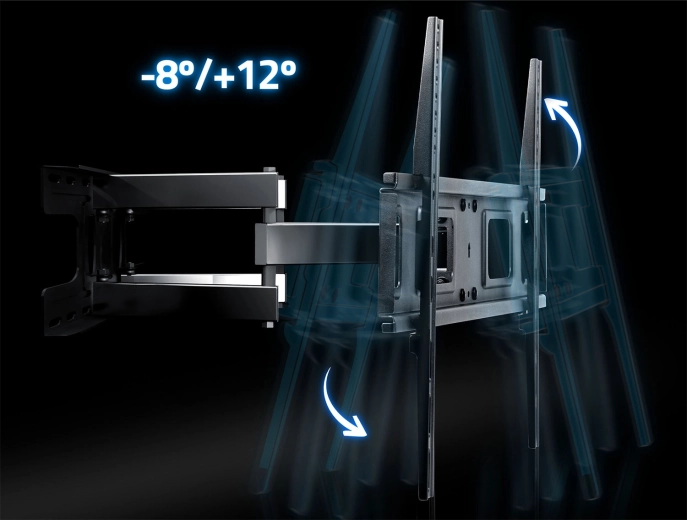 Dzięki szerokiemu zakresowi ruchu możesz wygodnie oglądać z dowolnego miejsca w pomieszczeniu. Pochylenie od -8° do 12° pomaga eliminować odblaski, obrót do 120° umożliwia precyzyjne ustawienie ekranu, a system korekty poziomu ±3° ułatwia idealne wypoziomowanie nawet po zawieszeniu. Uchwyt jest kompatybilny ze standardem VESA od 50×50 do 600×400 mm, więc bez problemu pasuje do większości nowoczesnych telewizorów.