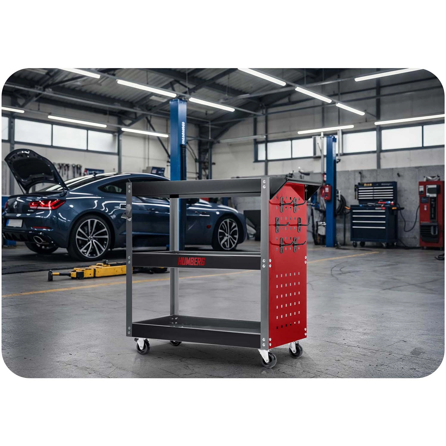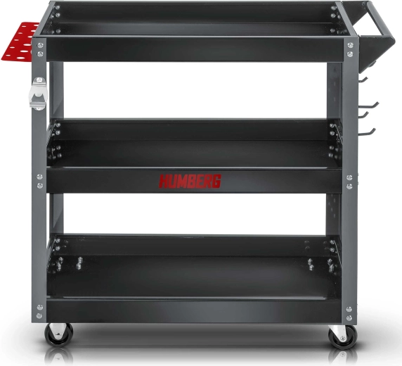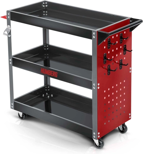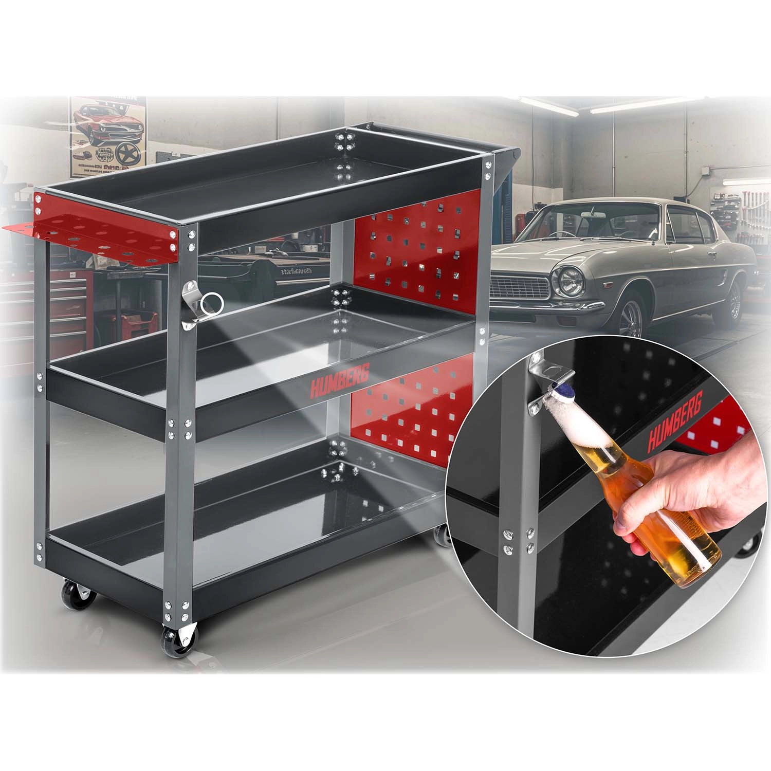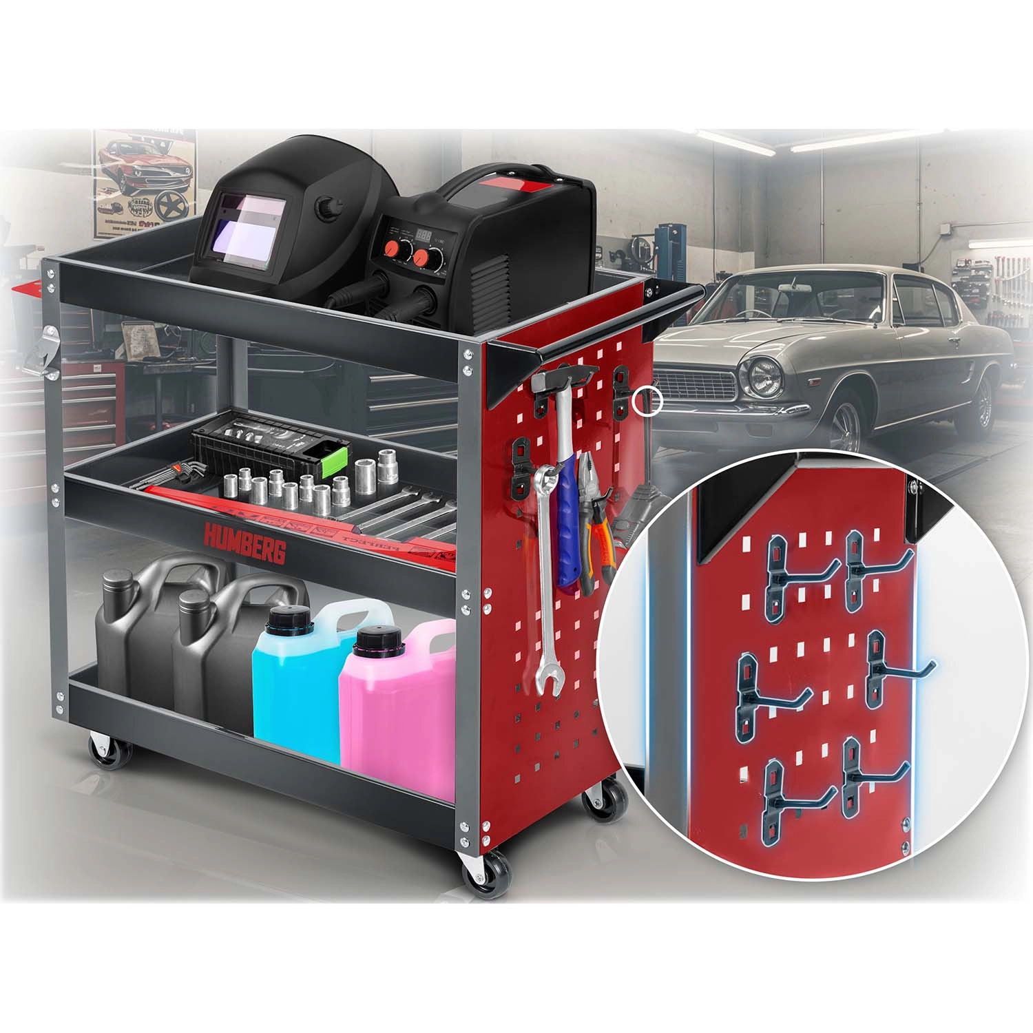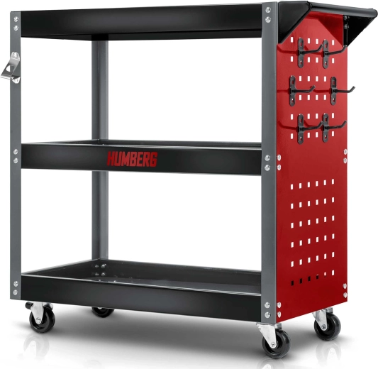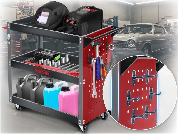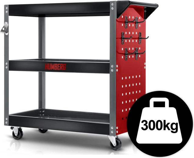Wózek HUMBERG został zaprojektowany do wymagających warunków warsztatowych. Łączy stal nierdzewną i aluminium, zapewniając wysoką odporność i długą żywotność. Trzy głębokie półki oferują wystarczająco dużo miejsca na narzędzia, części i akcesoria, a perforowane panele boczne z haczykami utrzymują często używane narzędzia zawsze pod ręką.