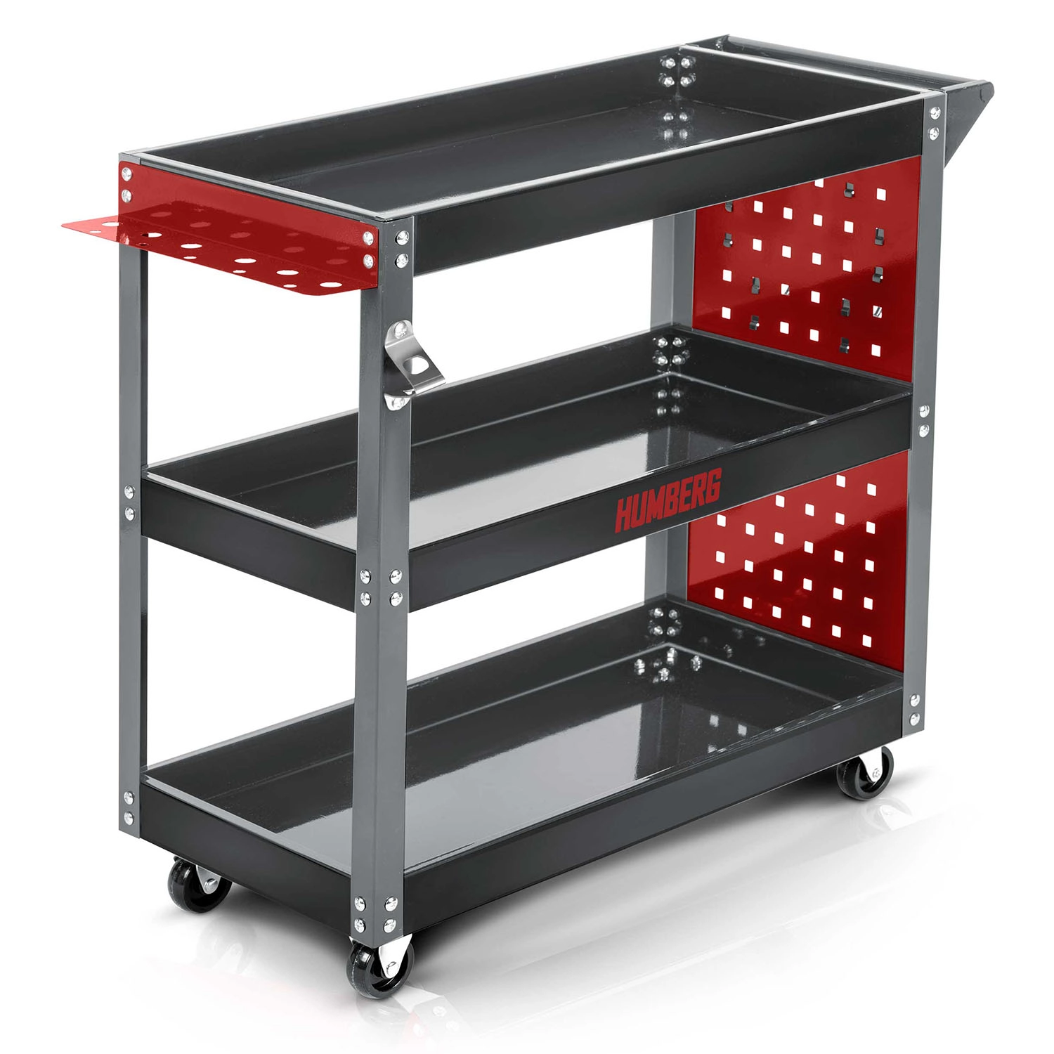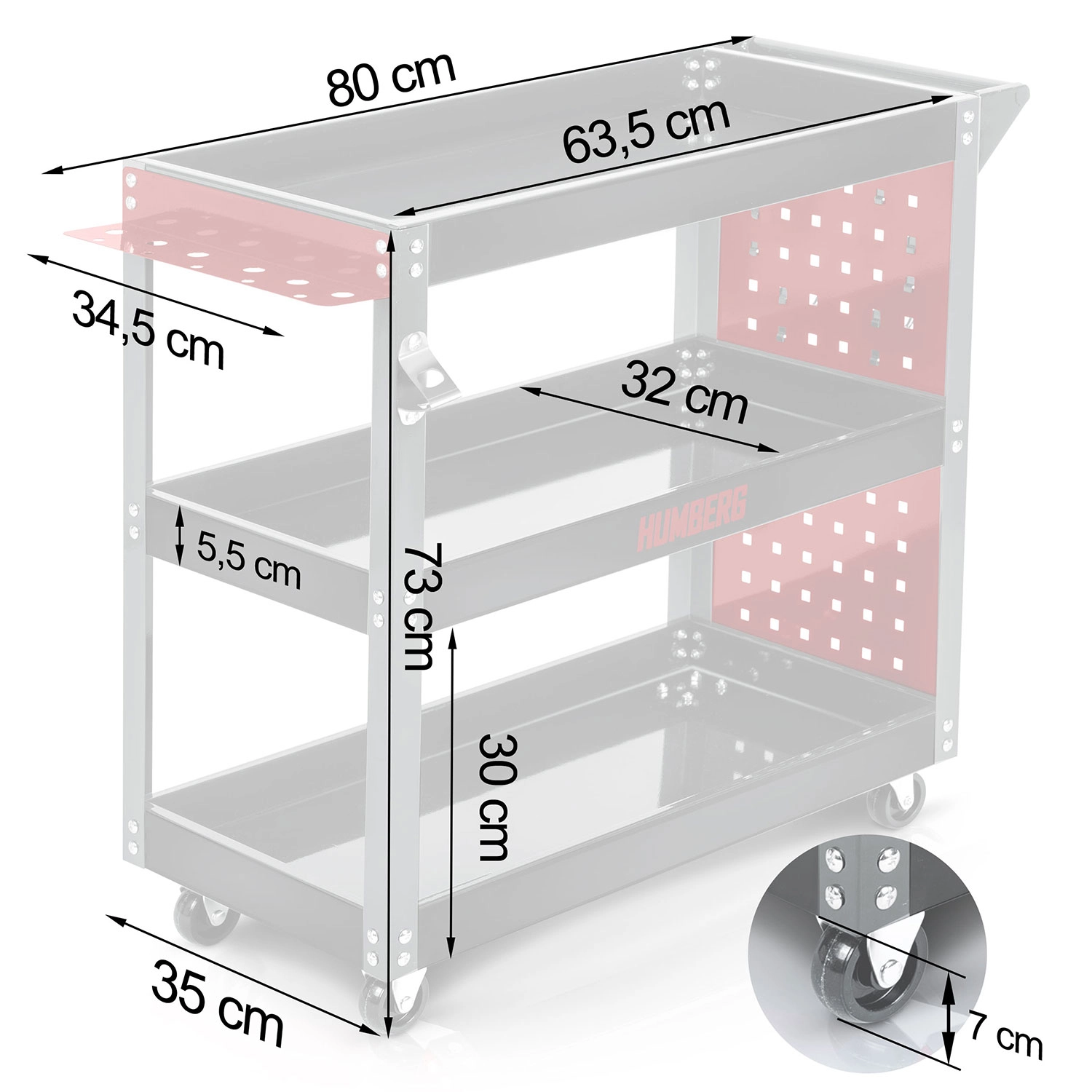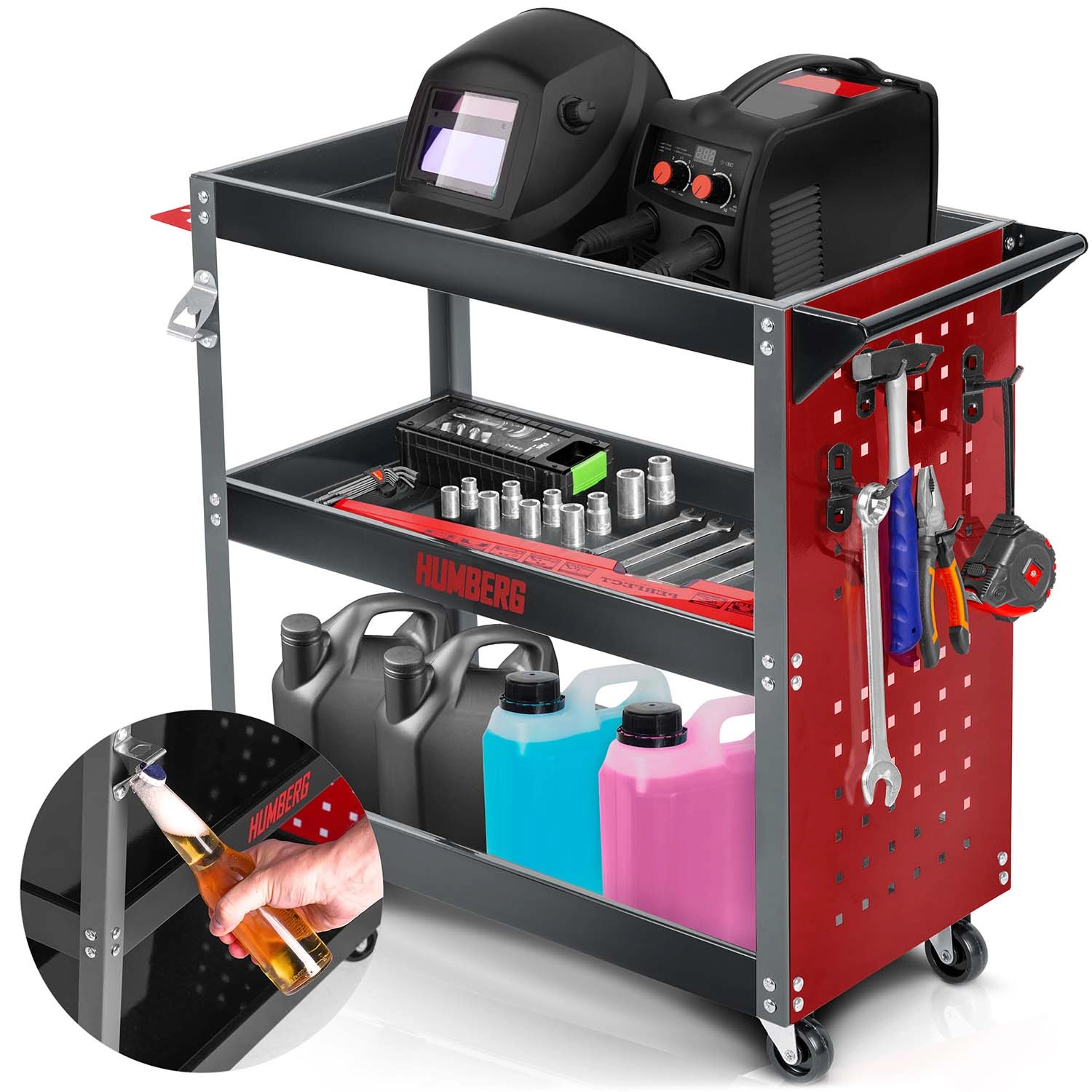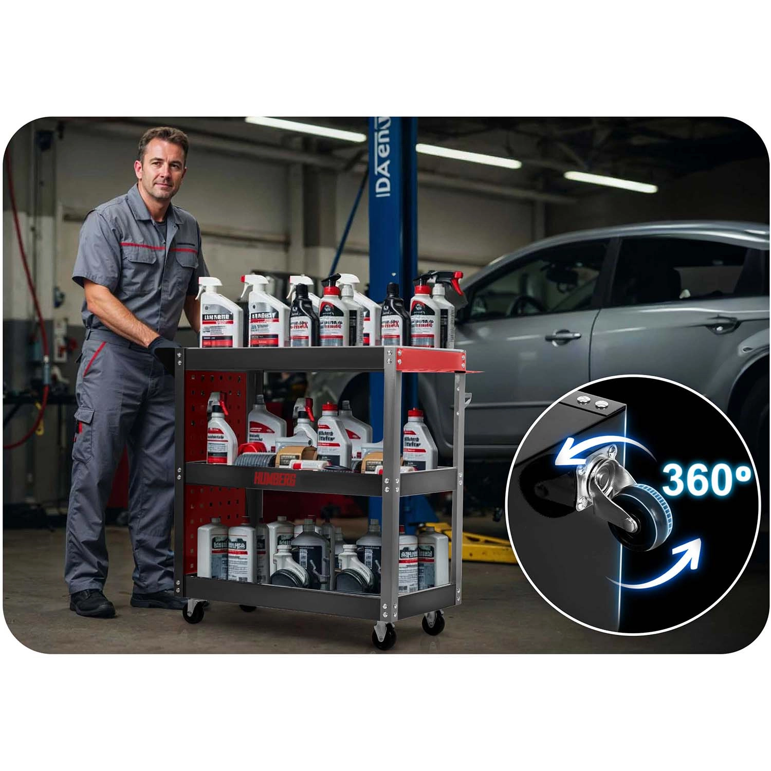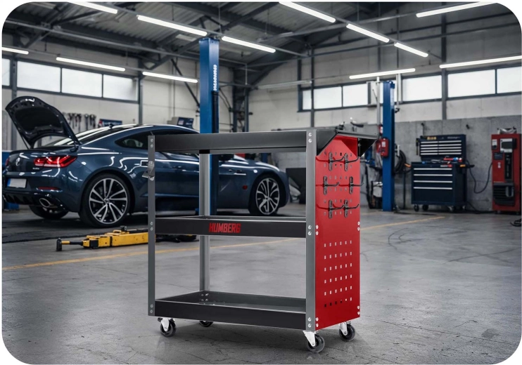 Wózek HUMBERG został zaprojektowany do wymagających warunków warsztatowych. Łączy stal nierdzewną i aluminium, zapewniając wysoką odporność i długą żywotność. Trzy głębokie półki oferują wystarczająco dużo miejsca na narzędzia, części i akcesoria, a perforowane panele boczne z haczykami utrzymują często używane narzędzia zawsze pod ręką.