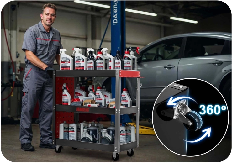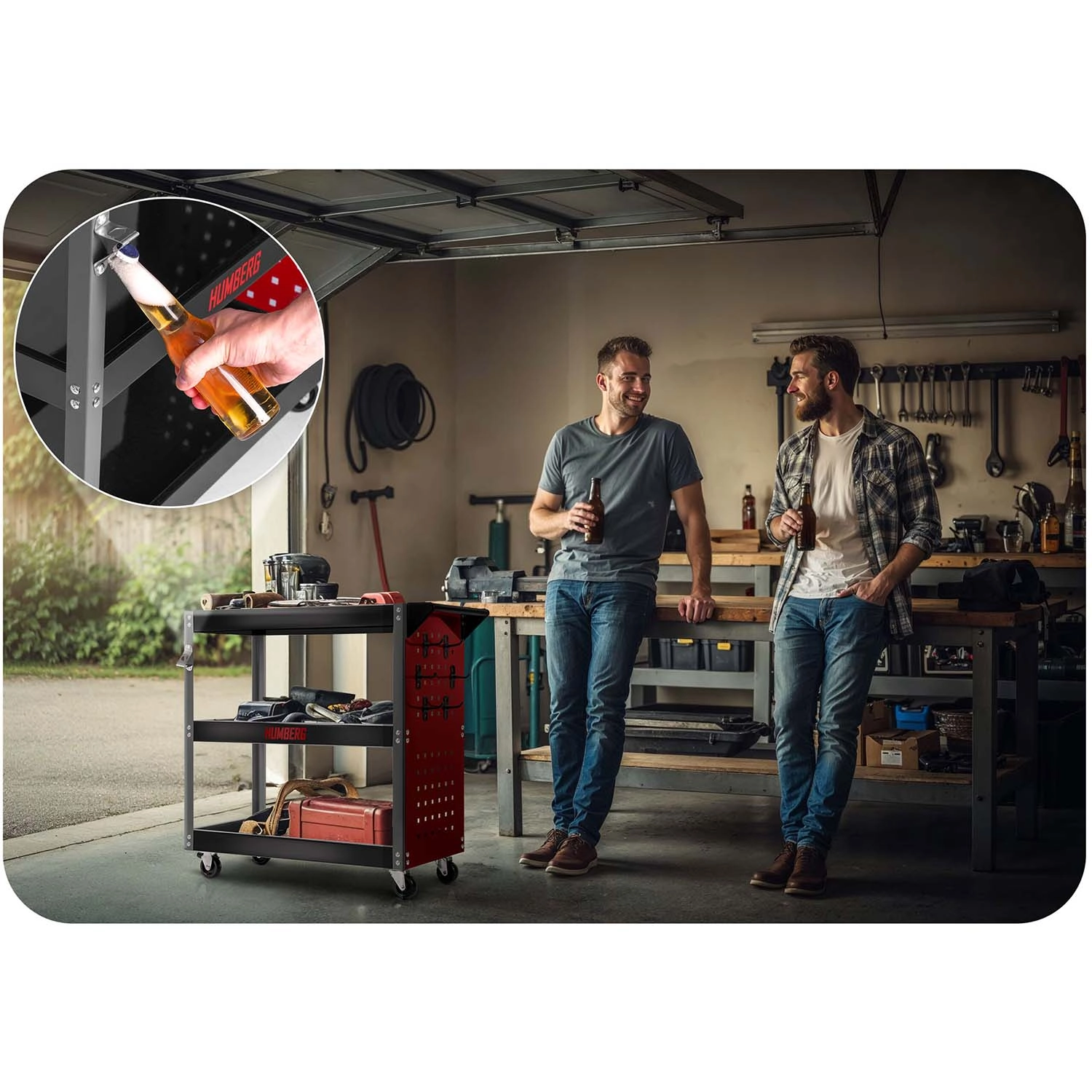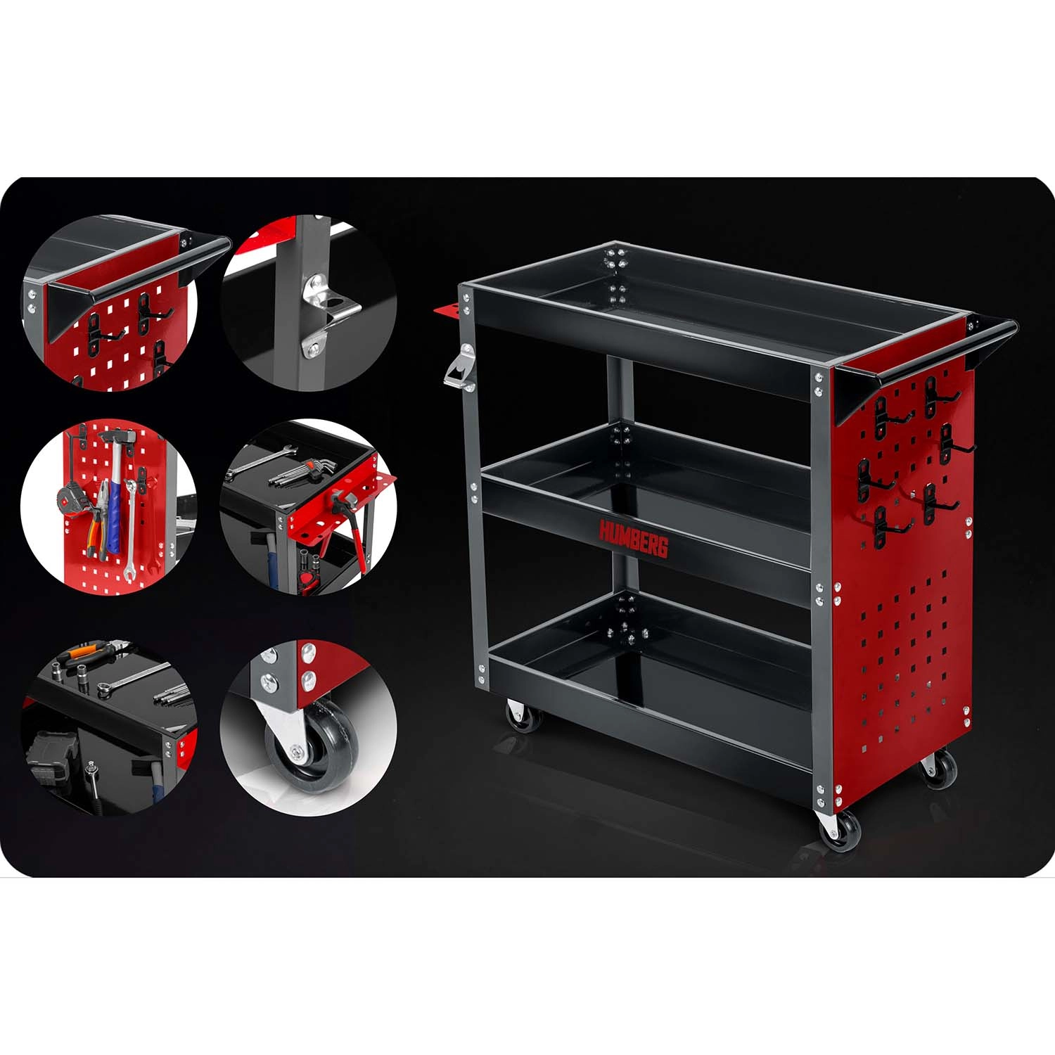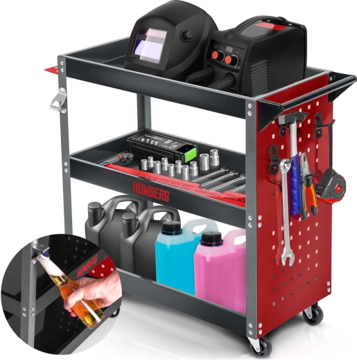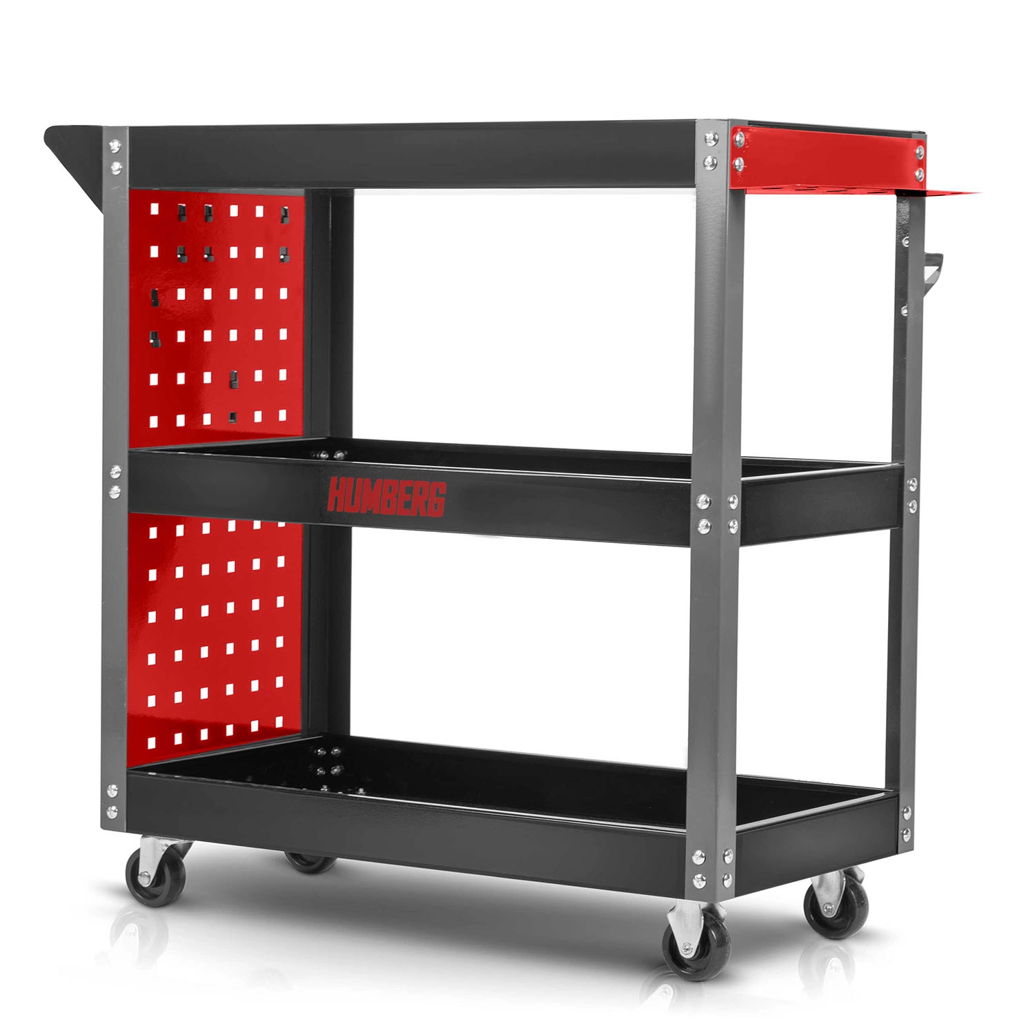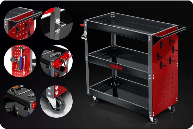 Wózek HUMBERG został zaprojektowany do wymagających warunków warsztatowych. Łączy stal nierdzewną i aluminium, zapewniając wysoką odporność i długą żywotność. Trzy głębokie półki oferują wystarczająco dużo miejsca na narzędzia, części i akcesoria, a perforowane panele boczne z haczykami utrzymują często używane narzędzia zawsze pod ręką.