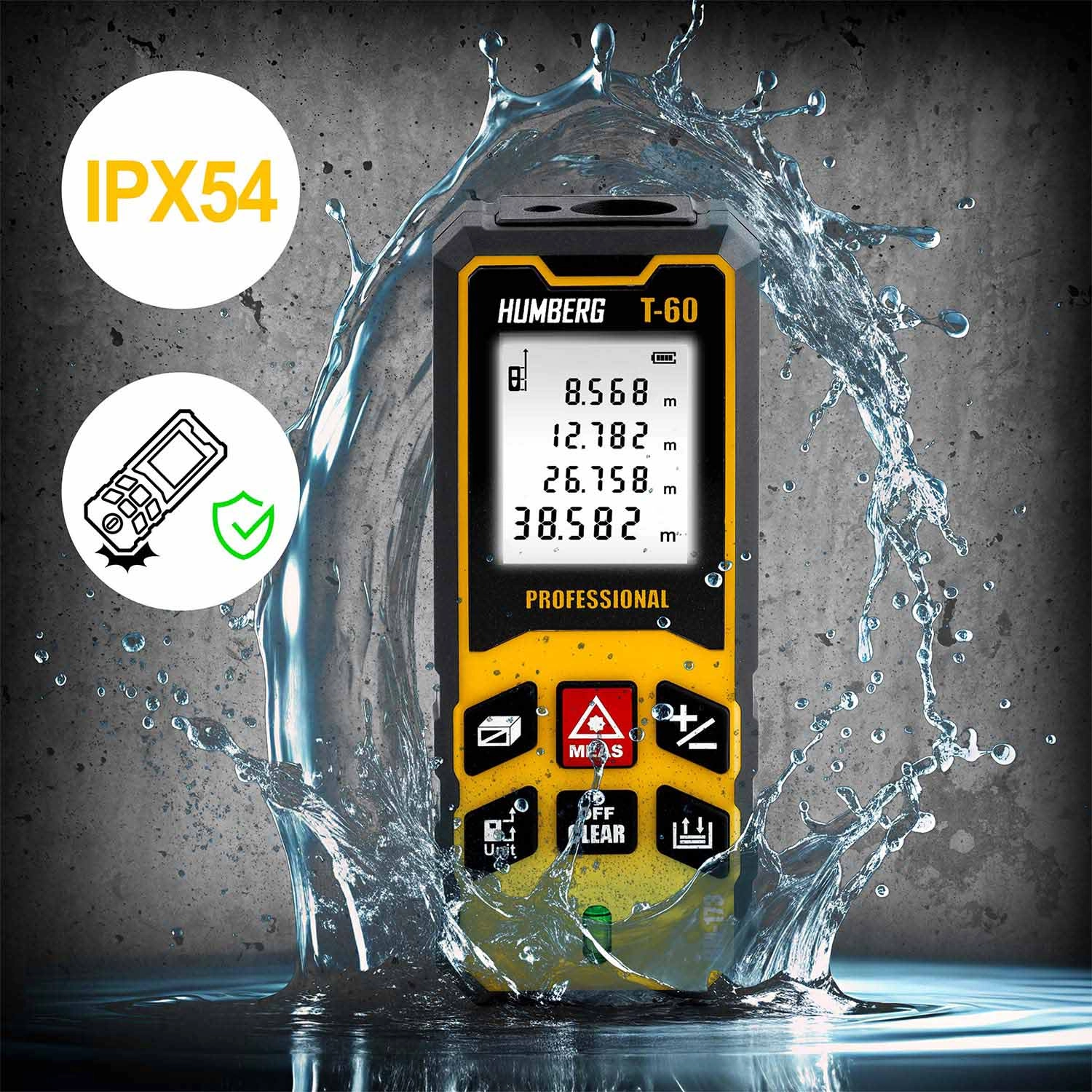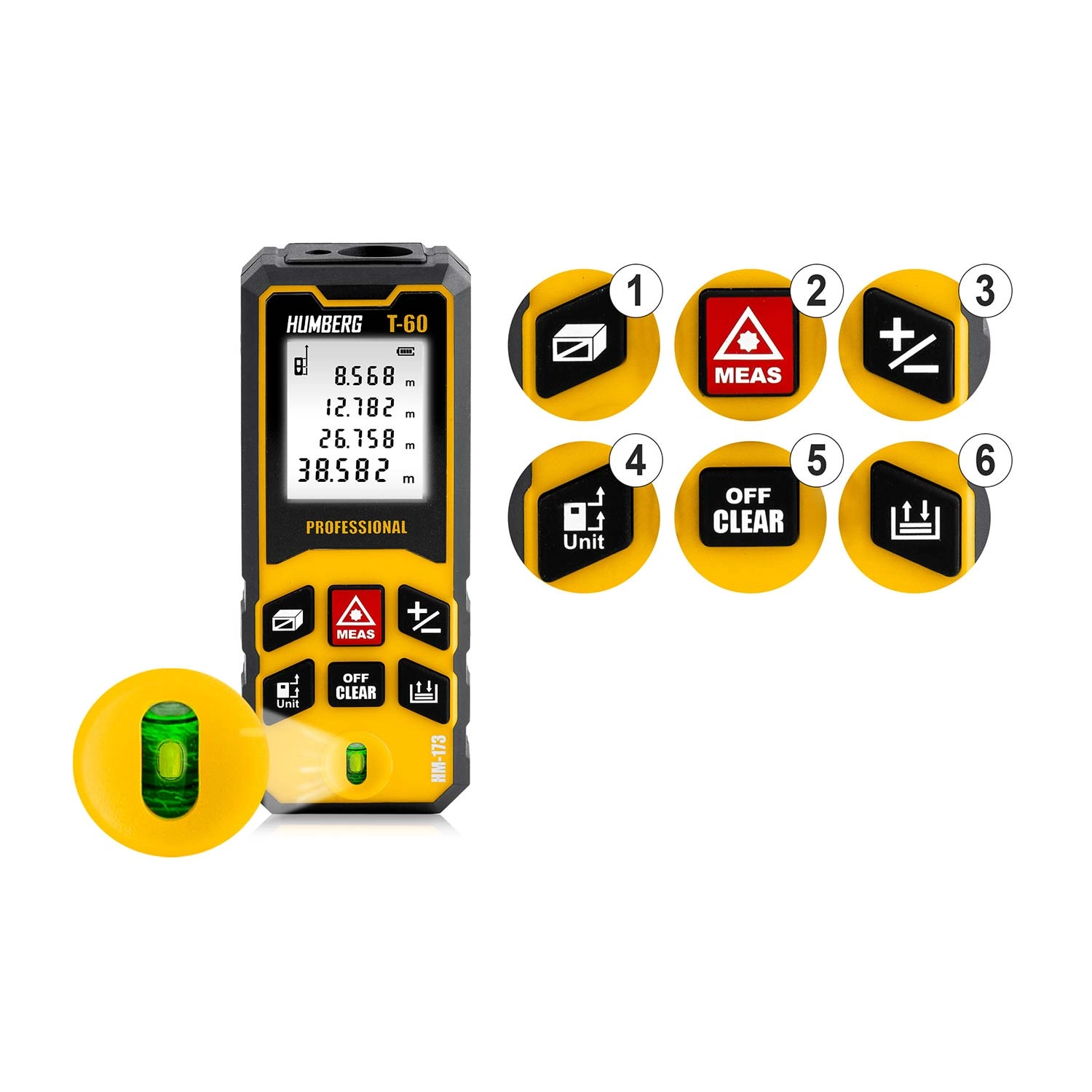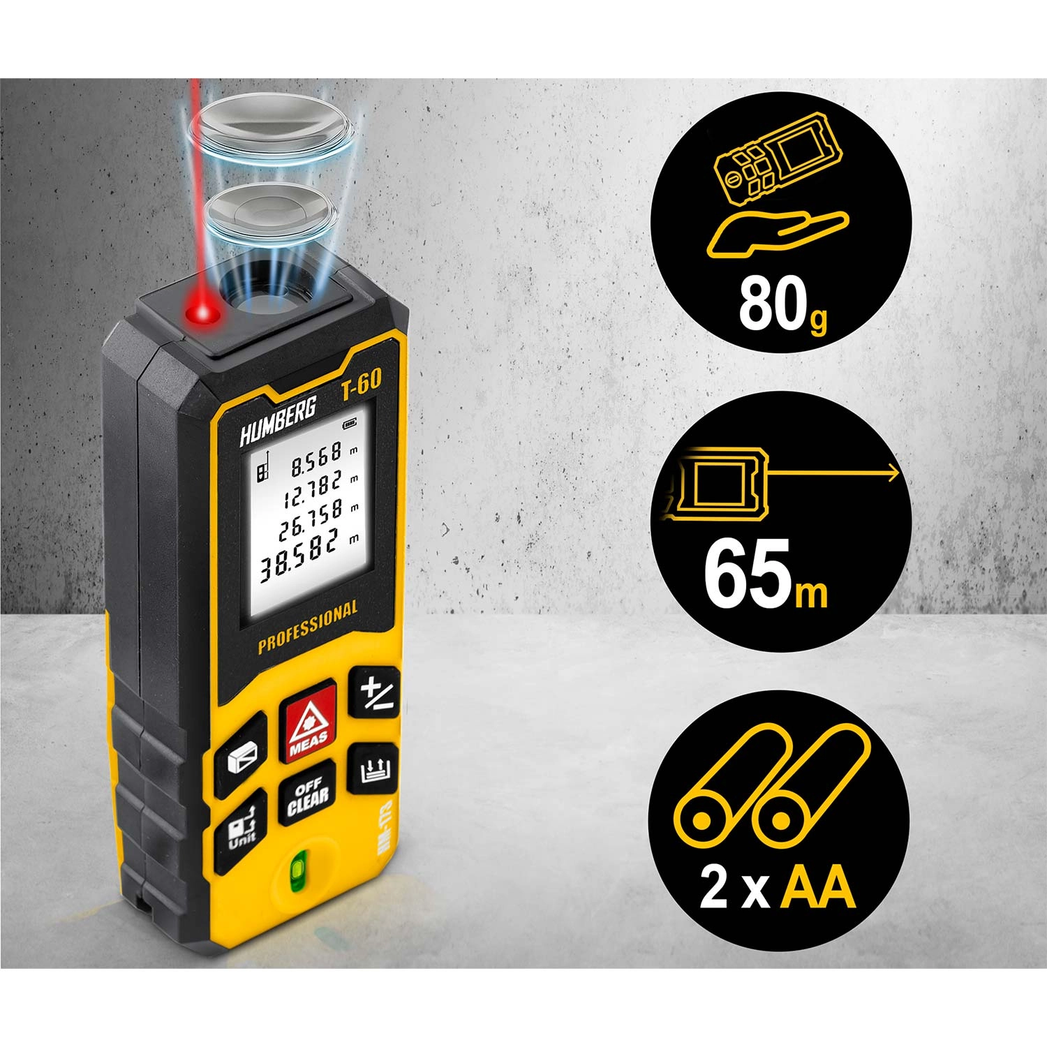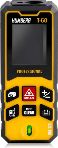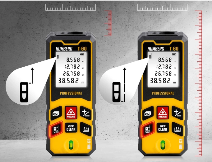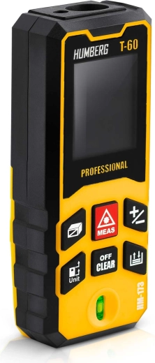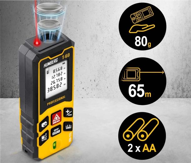 HUMBERG T-60 mierzy z dokładnością ±1,5 mm do 60 m (maks. 65 m). Natychmiast oblicza powierzchnię i objętość oraz zapisuje wartości w pamięci dla łatwego zarządzania projektami.