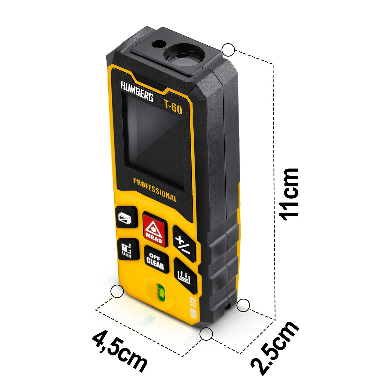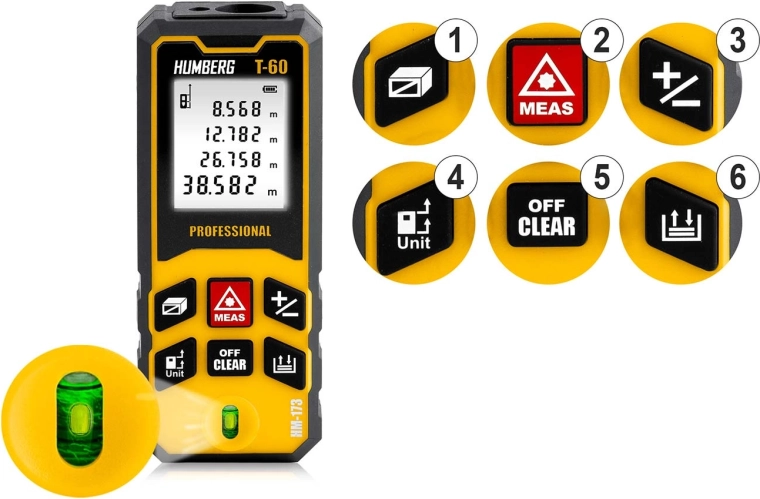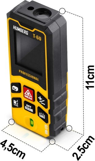 Kompaktowy i precyzyjny laserowy dalmierz HUMBERG T-60 o zasięgu do 60 m (maks. 65 m) do zastosowań profesjonalnych i domowych. Oferuje dokładność ±1,5 mm, pomiar powierzchni i objętości, funkcję Pitagorasa, pomiar ciągły oraz pamięć wyników. Dzięki IPX54, wbudowanej libelli i automatycznemu wyłączaniu idealnie sprawdzi się na budowie, przy remontach i w terenie.