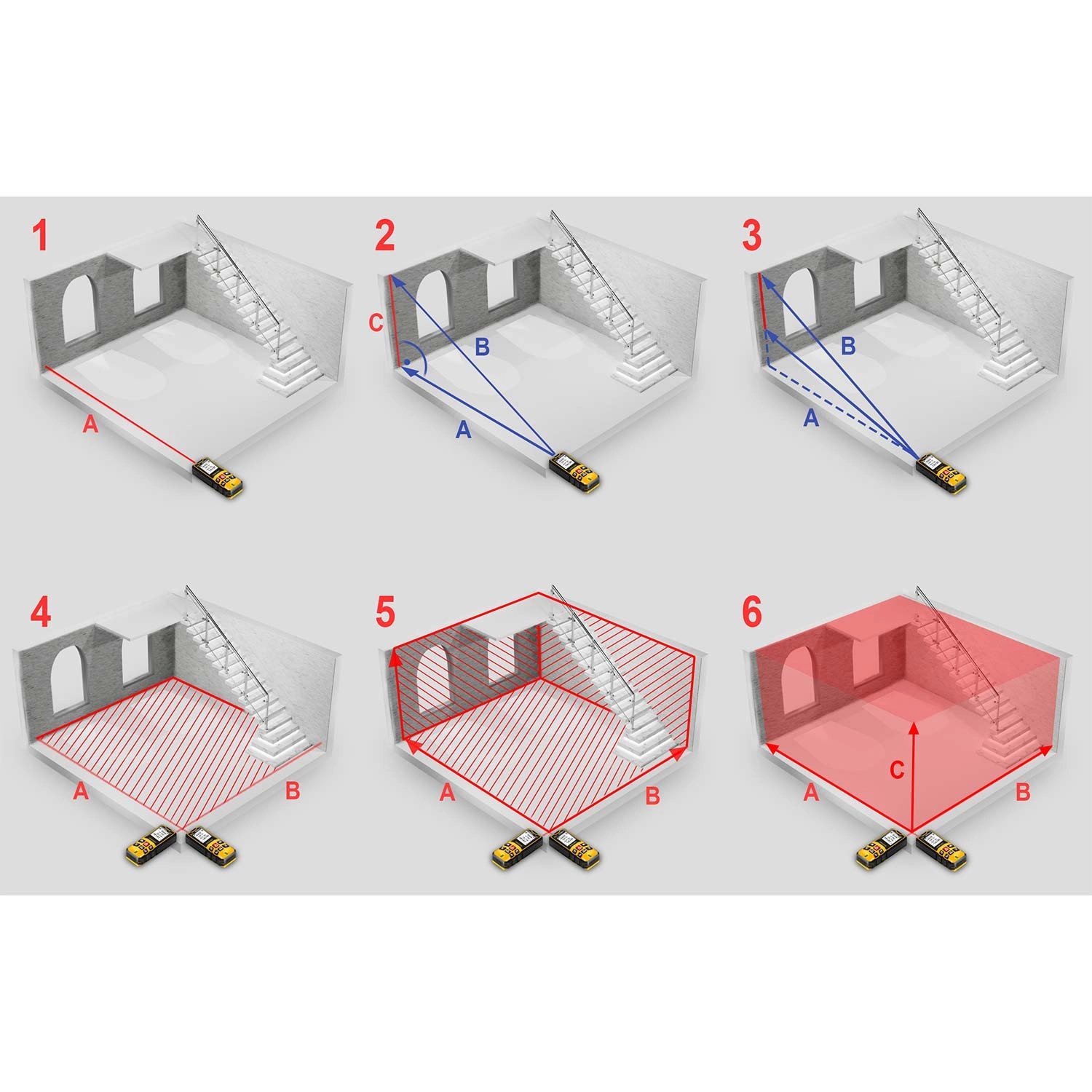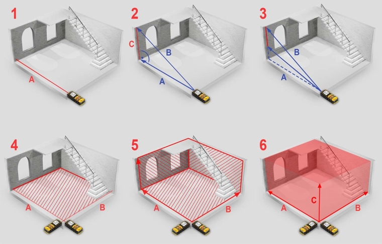 Urządzenie umożliwia pomiar odległości, powierzchni i objętości w kilku krokach z natychmiastowym obliczaniem. Funkcja Pitagorasa pozwala na pośredni pomiar wysokości tam, gdzie nie da się mierzyć bezpośrednio. Wybieralny punkt odniesienia pomiaru (od podstawy lub czubka urządzenia) zapewnia elastyczność w pomieszczeniach i na zewnątrz.