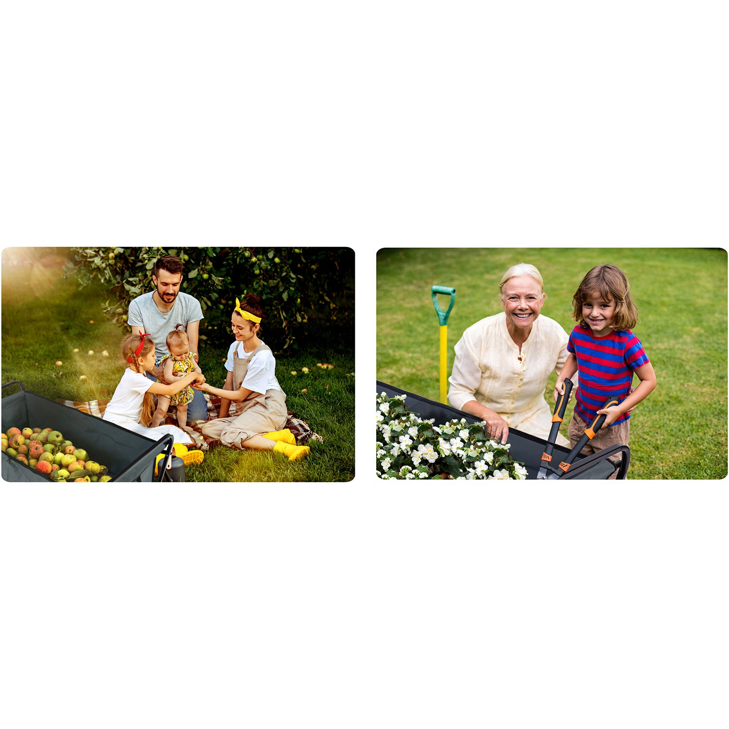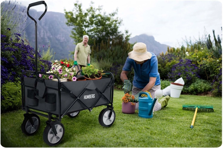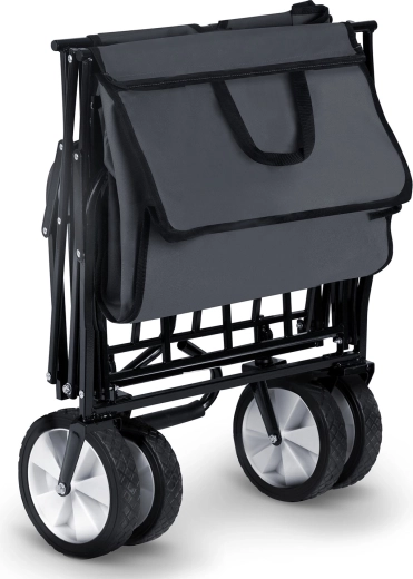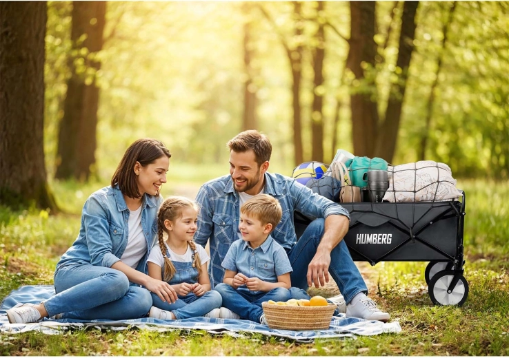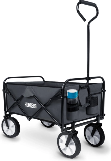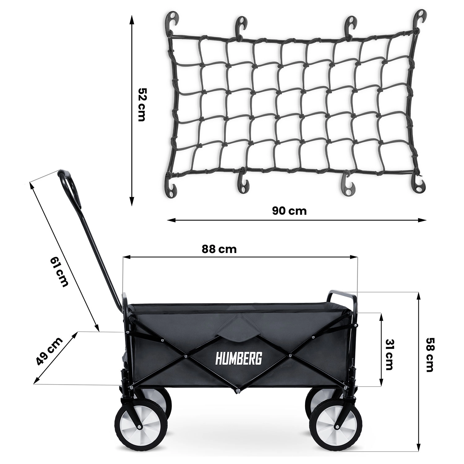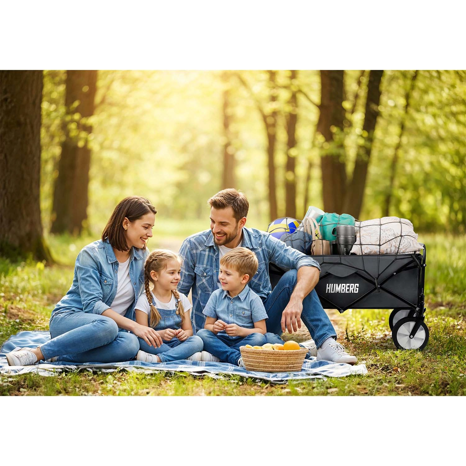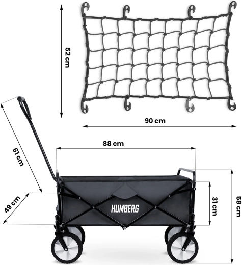 Praktyczny składany wózek transportowy HUMBERG o pojemności 80 l poradzi sobie ze wszystkim – od zakupów, przez piknik, po prace w ogrodzie. Dzięki solidnej stalowej konstrukcji, udźwigowi do 90 kg i dużym kołom manewrowanie jest łatwe także w terenie. W zestawie znajduje się bezpieczna elastyczna siatka do zabezpieczenia ładunku, a miękki, antypoślizgowy uchwyt i szybkie składanie zwiększają komfort i praktyczność.