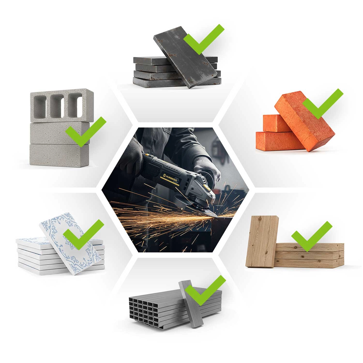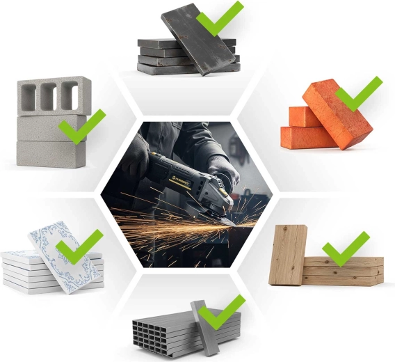 - Szerokie zastosowanie: metal, beton, kamień, ceramika, cegła, tworzywa sztuczne, drewno (z odpowiednią tarczą)
