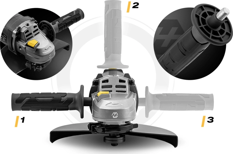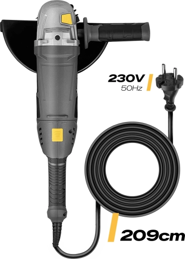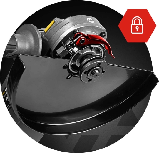 Ergonomiczna, antypoślizgowa i obrotowa rękojeść 180° wraz z bocznym uchwytem z 3 pozycjami (lewo/prawo/góra) zapewnia wygodną obsługę dla prawo- i leworęcznych. Metalowa osłona tarczy z szybką regulacją kąta bez użycia narzędzi zwiększa bezpieczeństwo i oszczędza czas. Długi, wytrzymały przewód zasilający 209 cm daje swobodę ruchu również na większych stanowiskach pracy.