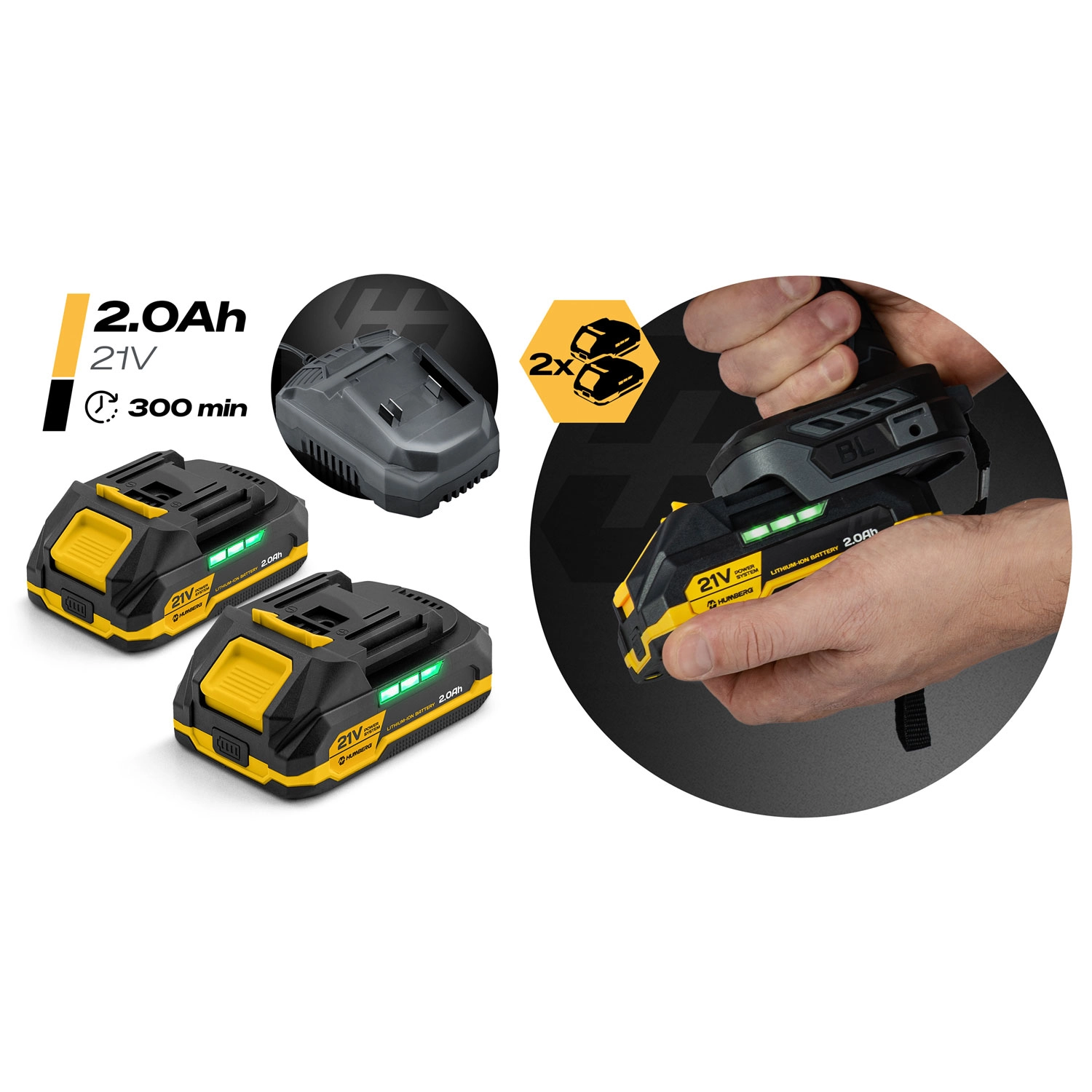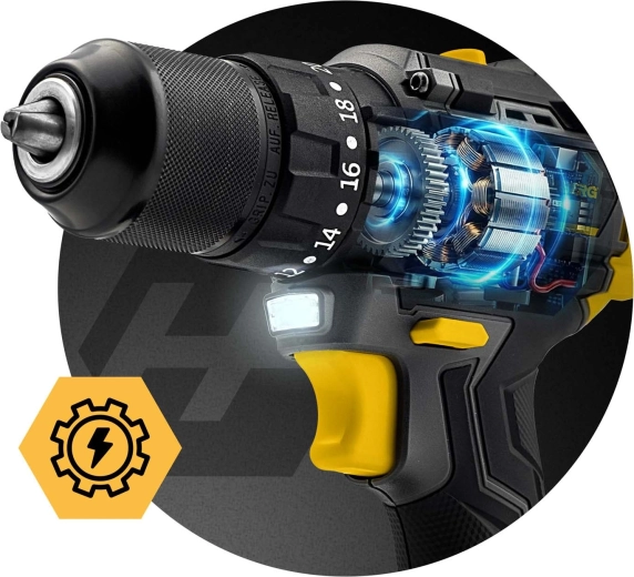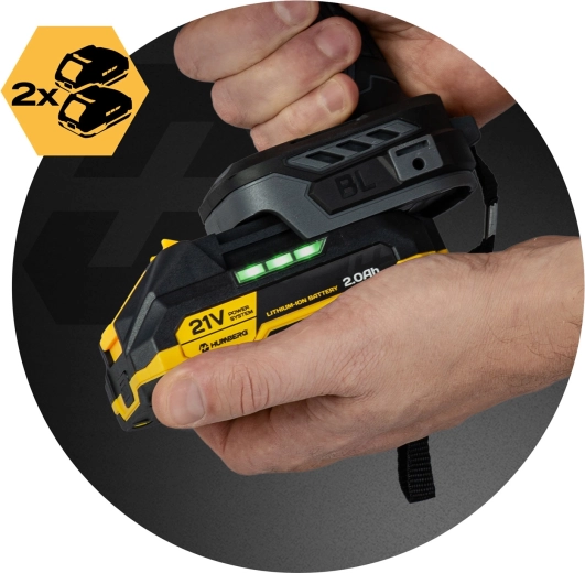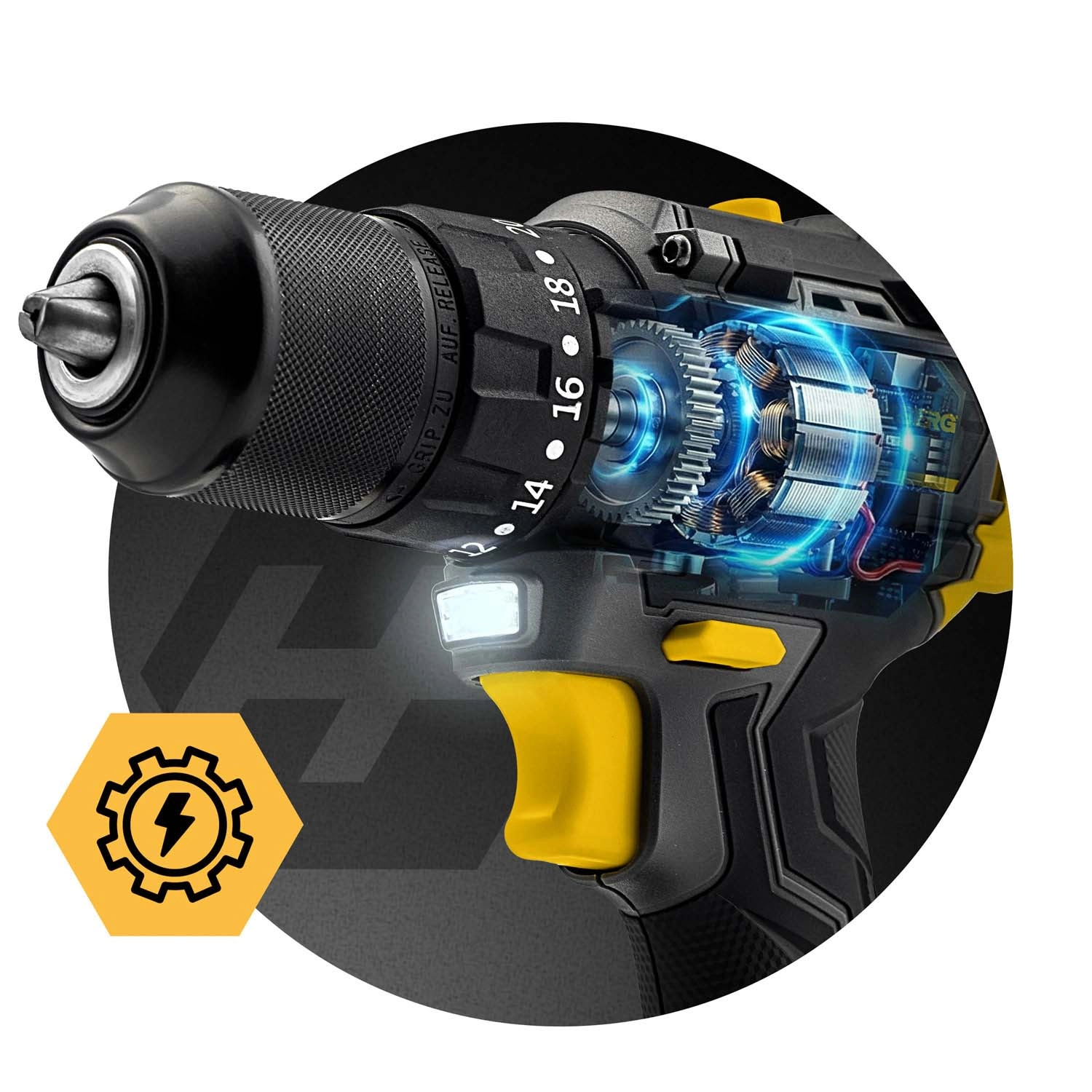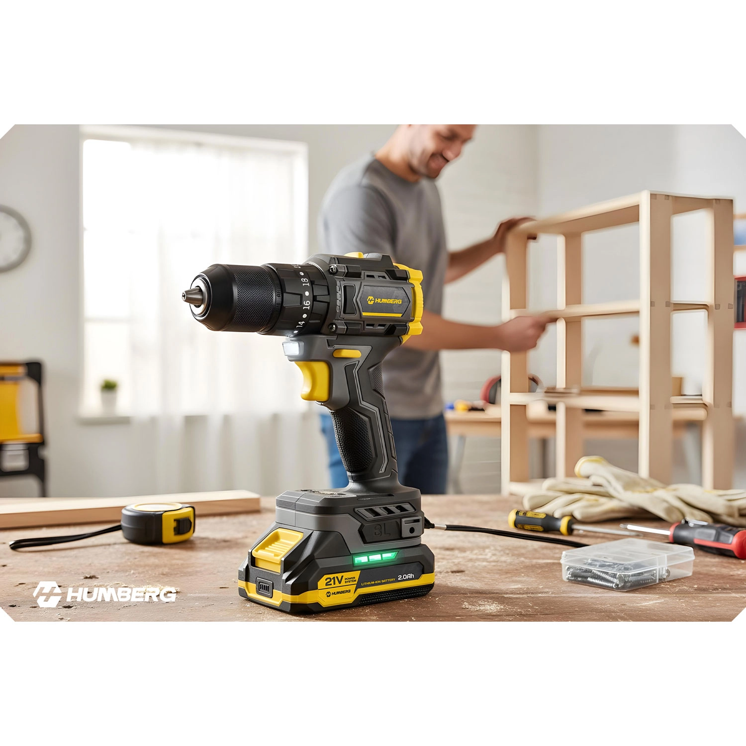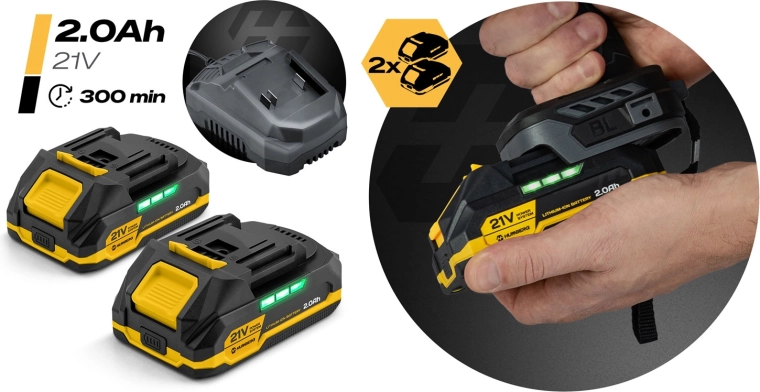 Ta akumulatorowa wiertarko-wkrętarka udarowa poradzi sobie z precyzyjnym wkręcaniem, szybkim wierceniem oraz wierceniem z udarem w twardszych materiałach. Silnik bezszczotkowy zapewnia wyższą wydajność, dłuższą żywotność i płynną pracę bez szarpania. Dzięki dwóm akumulatorom 21 V 2 Ah możesz pracować bez przerw – gdy jeden się ładuje, drugi jest w użyciu.