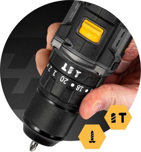 Ergonomiczna konstrukcja z miękkim, antypoślizgowym uchwytem gwarantuje pewność i wygodę nawet podczas dłuższej pracy. 20-stopniowa regulacja sprzęgła chroni materiał i wkręty, a dwa biegi pozwalają przełączać się między precyzyjnym wkręcaniem (0–400 obr./min) a szybkim wierceniem (0–1400 obr./min). Światło LED oświetla miejsce pracy w ciemnych zakamarkach, szafkach czy sufitach podwieszanych.