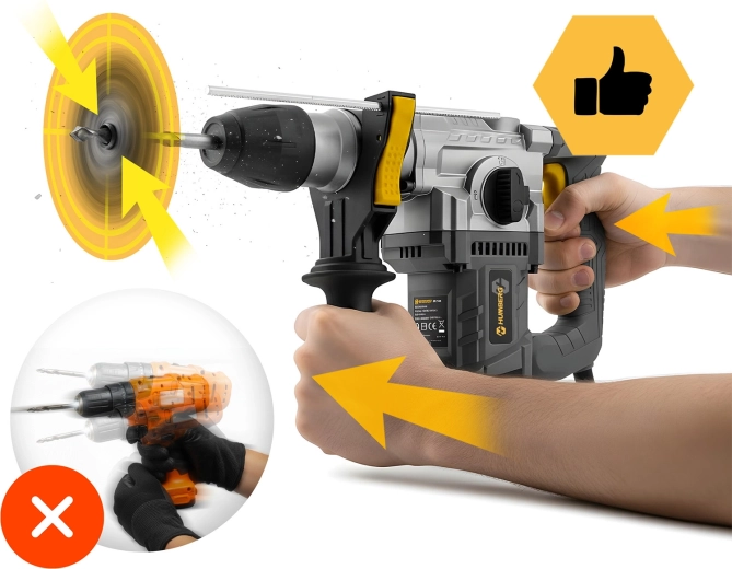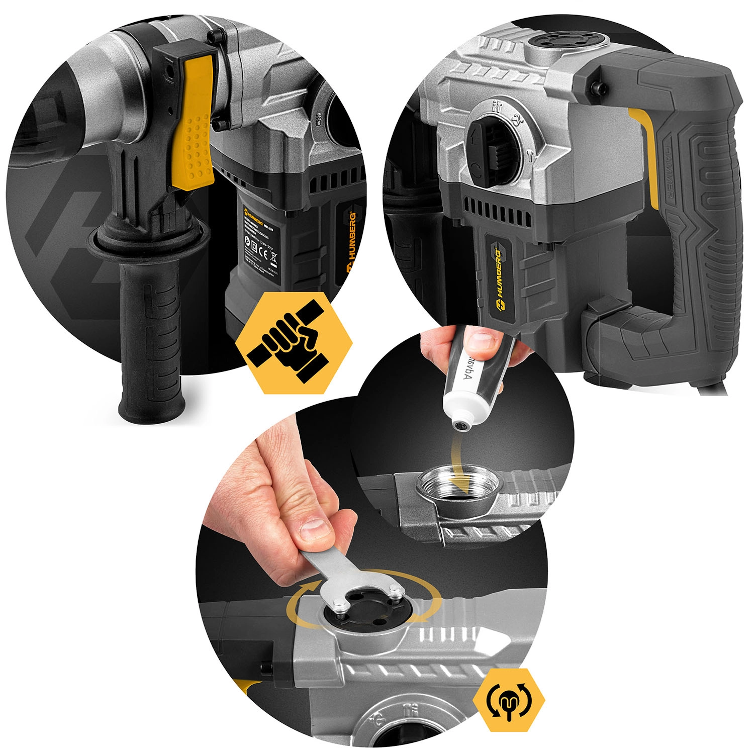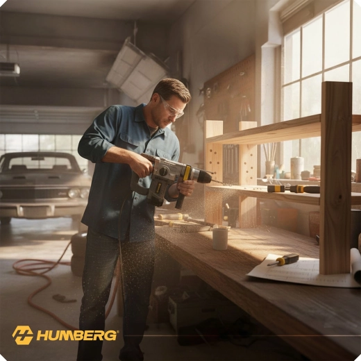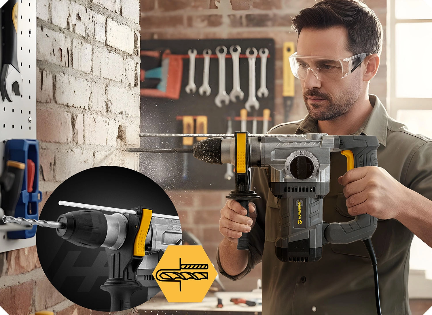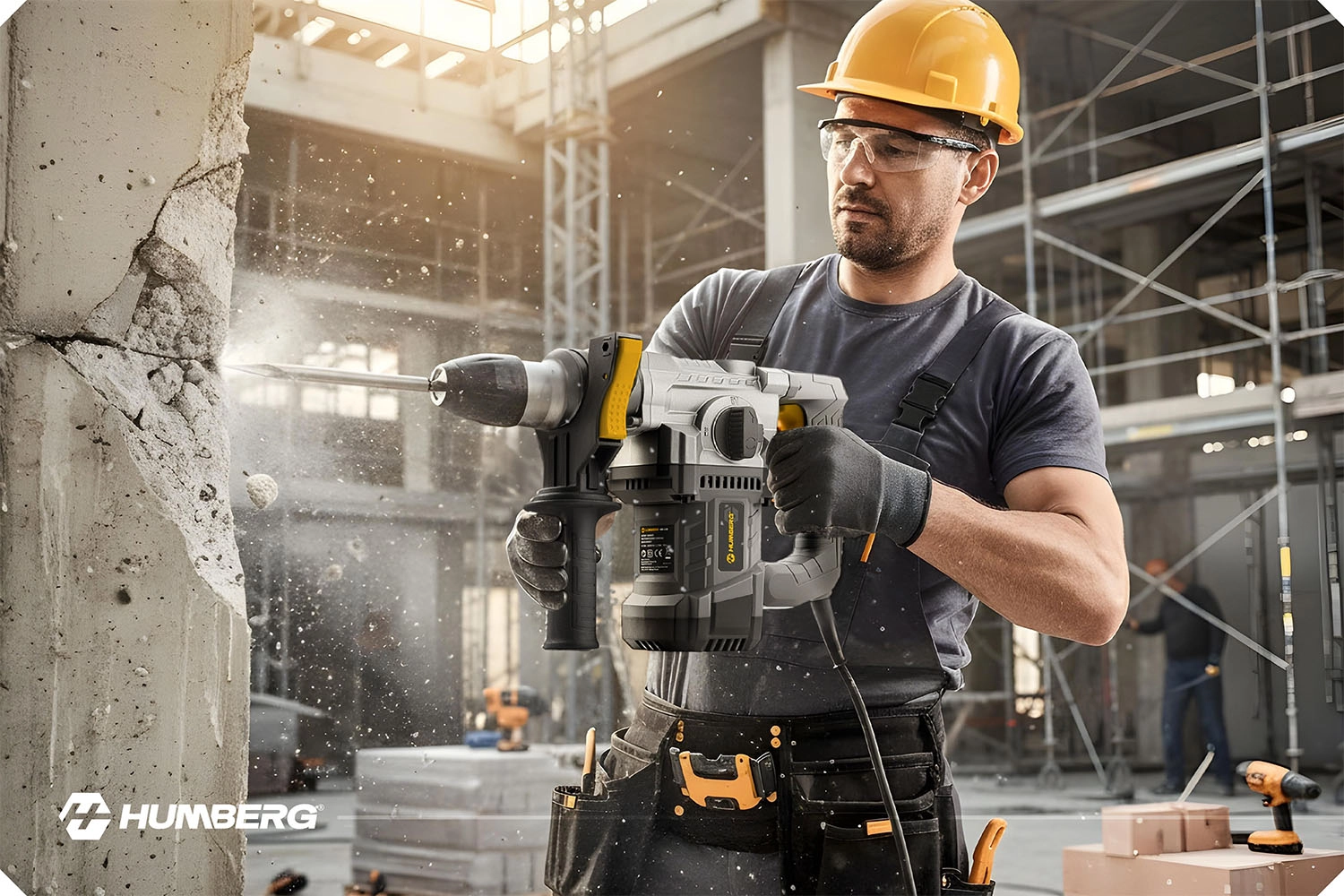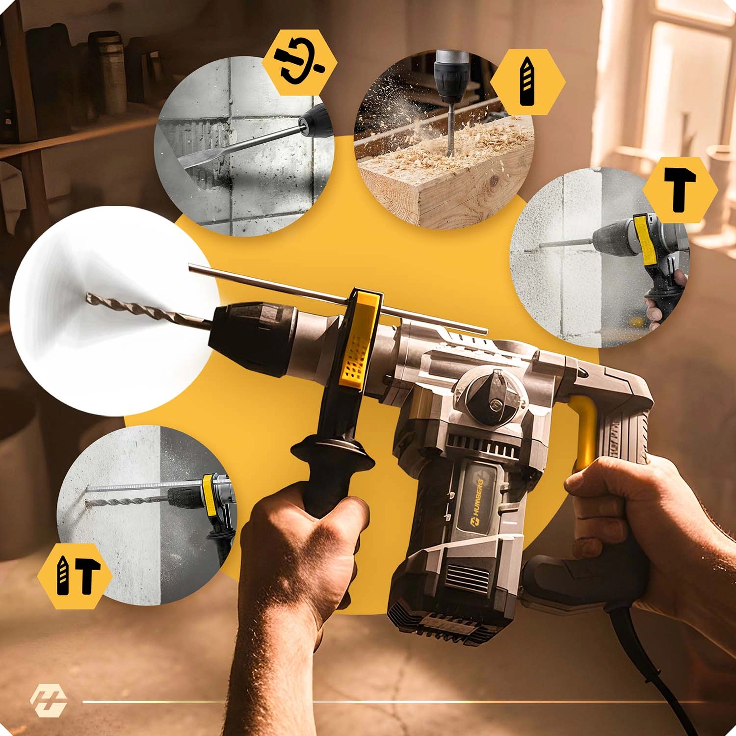 Wydajna młotowiertarka udarowa HUMBERG z silnikiem 1010 W i energią udaru 4 J radzi sobie z wierceniem i kuciem w betonie, murze, drewnie i metalu. Szybka wymiana narzędzi dzięki uchwytowi SDS Plus, 4 tryby pracy oraz regulacja obrotów dla maksymalnej kontroli. W zestawie bogate wyposażenie w wytrzymałym kufrze oraz przewód zasilający 2 m dla wygodnej pracy.