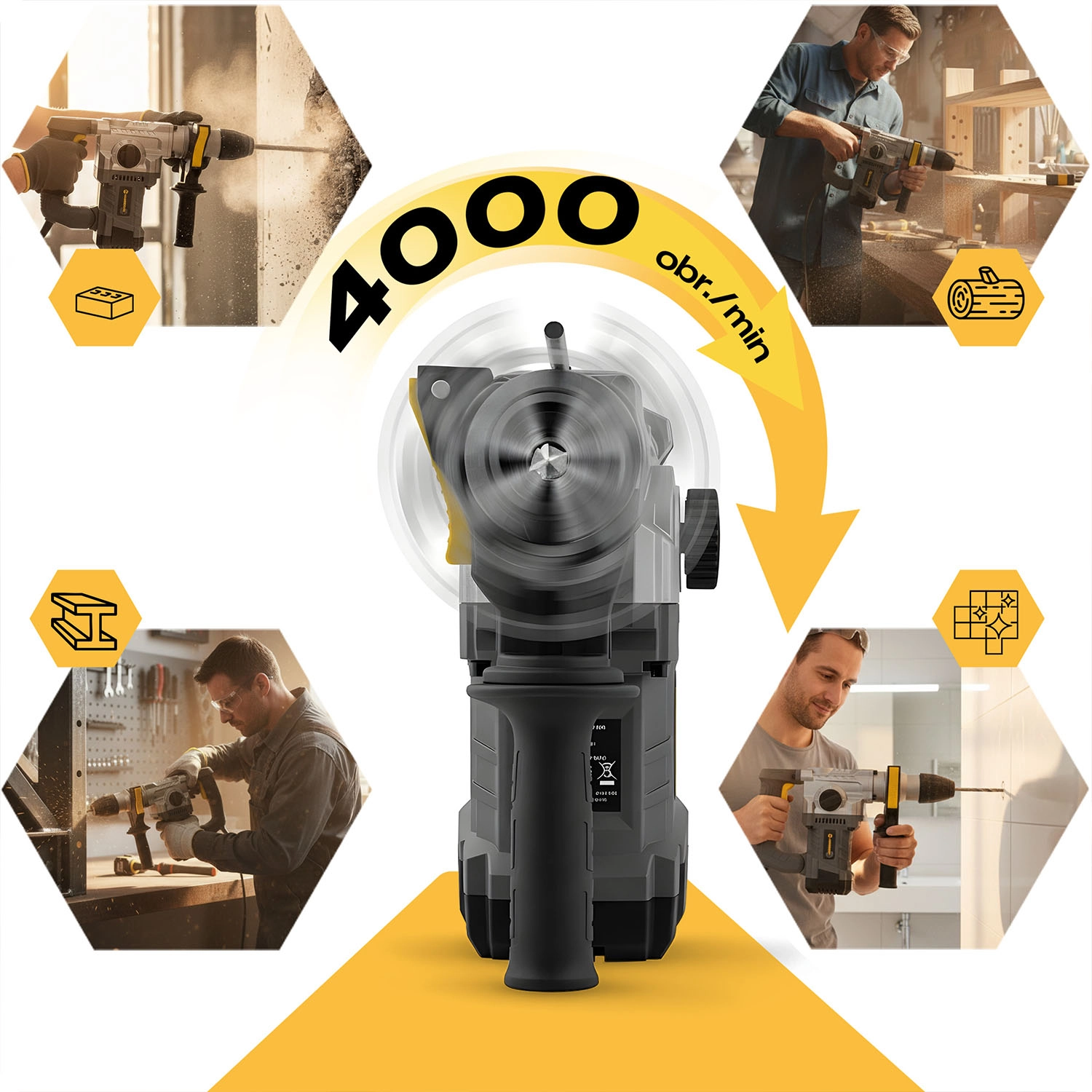 Moc i precyzja w jednym – trwały silnik szczotkowy o mocy 1010 W i energii udaru 4 J zapewnia wysoką efektywność przy wierceniu z udarem i kuciu. Regulacja obrotów do wysokich wartości pozwala dopasować narzędzie do materiału, smarowanie przekładni wydłuża żywotność, a miękki, antywibracyjny uchwyt zwiększa komfort nawet podczas dłuższej pracy.