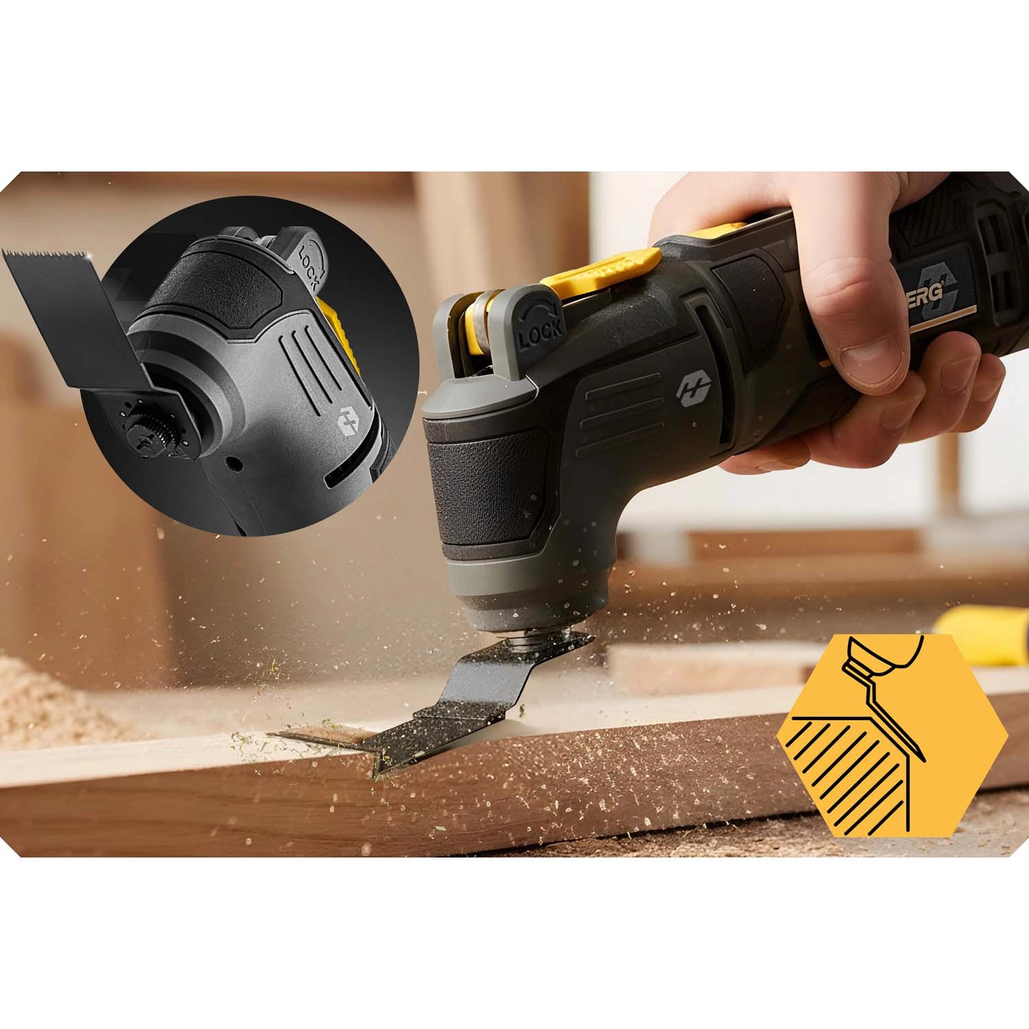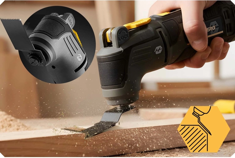 Szybkozaciskowy (bezkluczowy) system umożliwia wymianę akcesoriów w kilka sekund – więcej pracy, mniej przestojów. Kąt oscylacji 3° pomaga w precyzyjnym cięciu i delikatnym zbieraniu materiału także w trudno dostępnych miejscach, przy krawędziach i w narożnikach. Antypoślizgowy, ergonomiczny uchwyt zwiększa kontrolę nad narzędziem i ogranicza zmęczenie podczas dłuższego użytkowania.