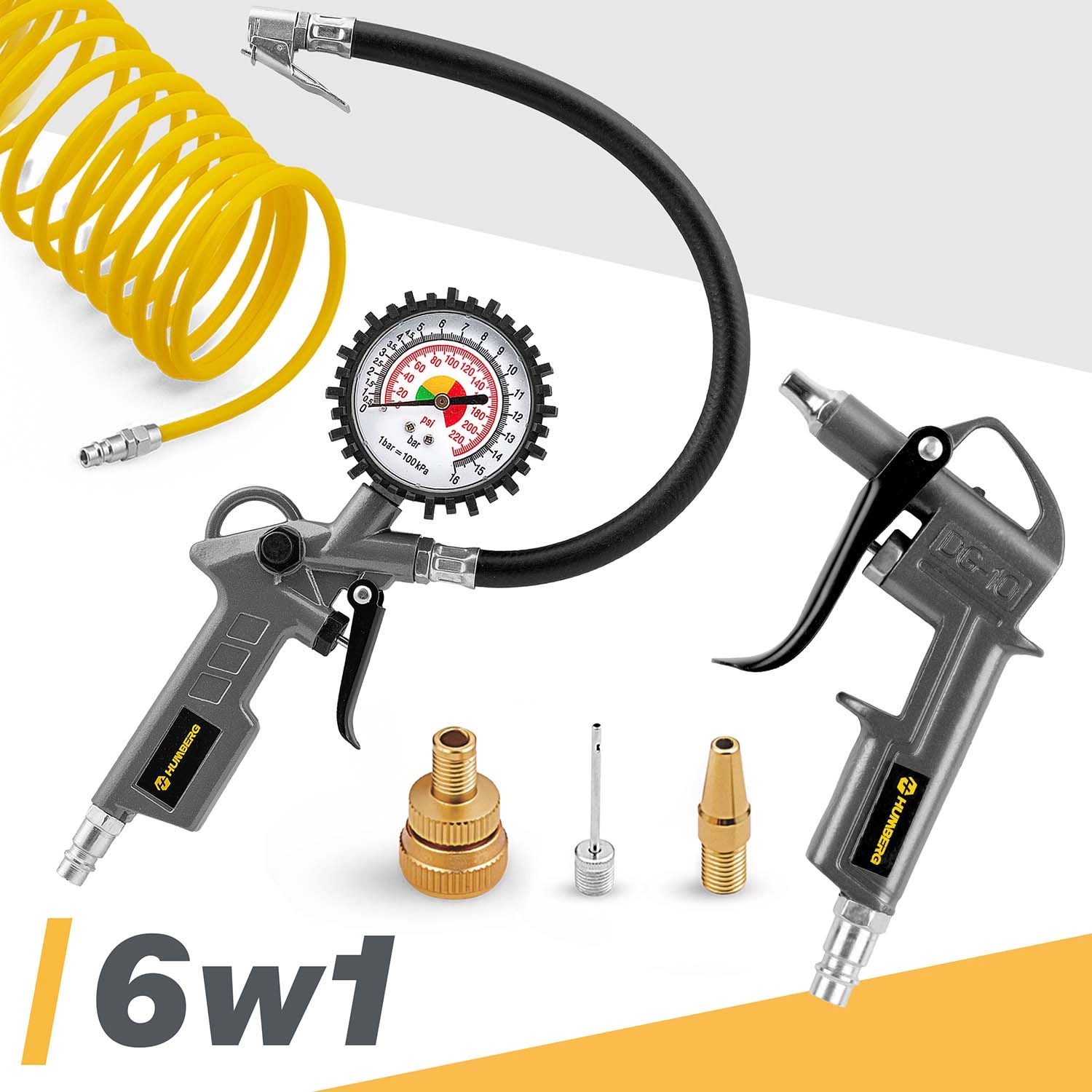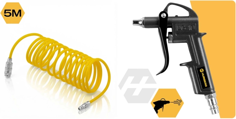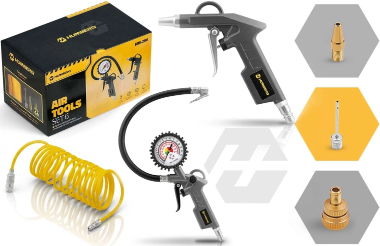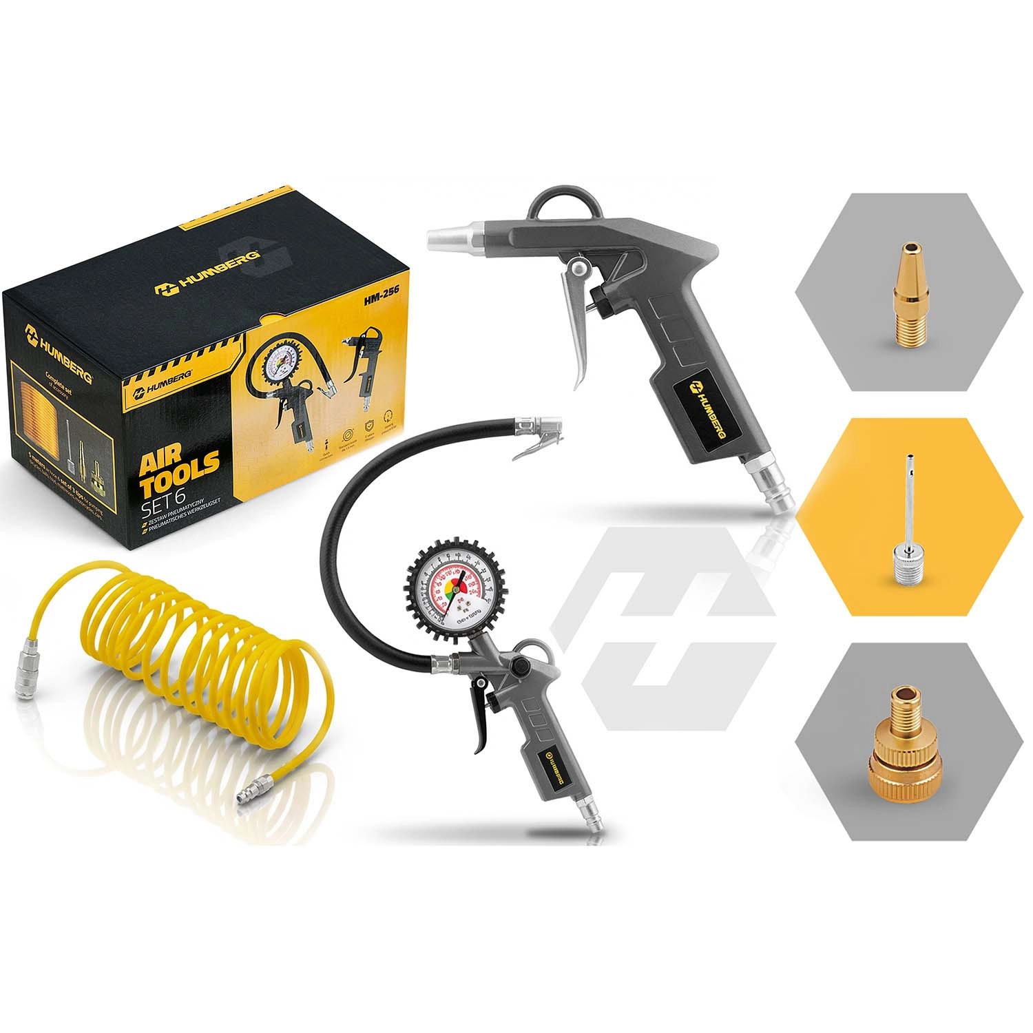 Uniwersalny zestaw narzędzi pneumatycznych 6 w 1 do kompresora HUMBERG umożliwia wygodne pompowanie opon, odmuch i czyszczenie, mycie pod ciśnieniem oraz inne prace w warsztacie lub garażu. Zawiera pistolet z manometrem, pistolet do przedmuchiwania, spiralny wąż 5 m, zestaw końcówek oraz szybkozłączkę do szybkiego podłączania. Oszczędzasz czas i pieniądze, pracując jak w profesjonalnym serwisie.