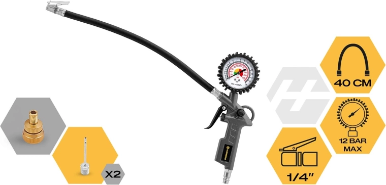 Pistolet z okrągłym analogowym manometrem umożliwia wygodne pompowanie opon z natychmiastową kontrolą ciśnienia. Elastyczny wąż i niezawodna końcówka zapewniają bezpieczne podłączenie do zaworu.