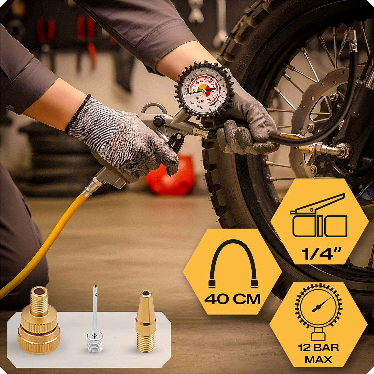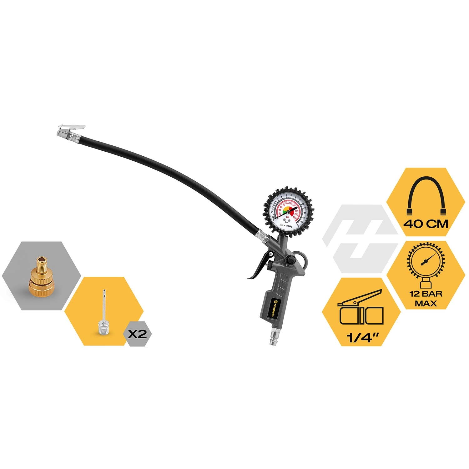 Dzięki temu praktycznemu zestawowi otrzymasz wszystko, czego potrzebujesz do pracy ze sprężonym powietrzem w jednym opakowaniu. Precyzyjne pompowanie dzięki analogowemu manometrowi, celowany przedmuch wąską dyszą oraz łatwa obsługa dzięki lekkiej spiralnej rurze zapewniają czyste i efektywne rezultaty w domu i w garażu.