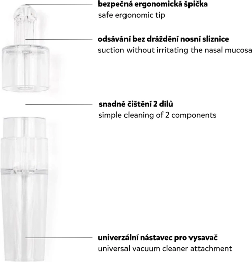 Dzięki specjalnemu kształtowi końcówki i bezpiecznemu materiałowi bez bisfenolu odsysanie jest komfortowe i łagodne dla śluzówki. Odsysacz można łatwo rozłożyć i wygotować dla pełnej higieny, a trwały, niełamliwy materiał gwarantuje długą żywotność. Idealny pomocnik przy przeziębieniu i katarze już od pierwszych dni życia.