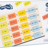 Dzieci łatwo poćwiczą podstawową arytmetykę dzięki przejrzyście ułożonej tablicy i czytelnym przykładom na drewnianych elementach.