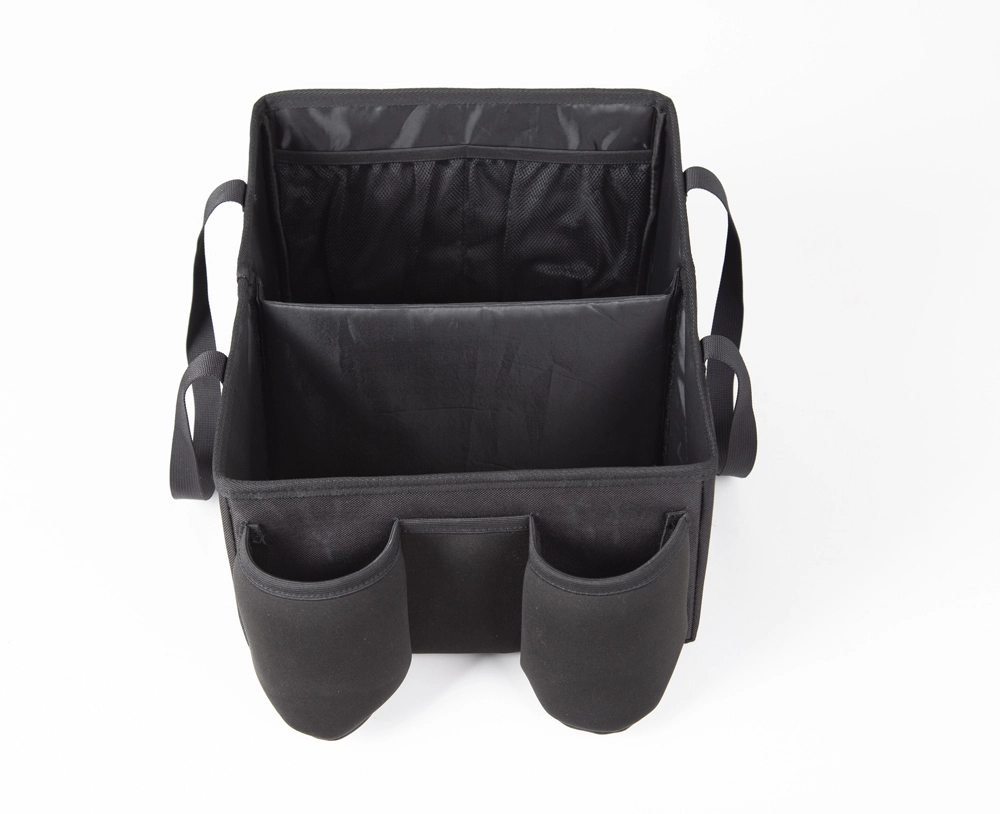Pudełko oferuje dużą przestrzeń wewnętrzną podzieloną na 2 przegródki, uzupełnioną o 2 kieszenie z siatki na akcesoria. Z przodu znajdziesz 2 uchwyty na butelki lub termosy, więc napoje zawsze będą pod ręką. Konstrukcja jest składana – w kilka sekund złożysz ją na płasko, przeniesiesz za wytrzymałe uchwyty i ponownie rozłożysz.