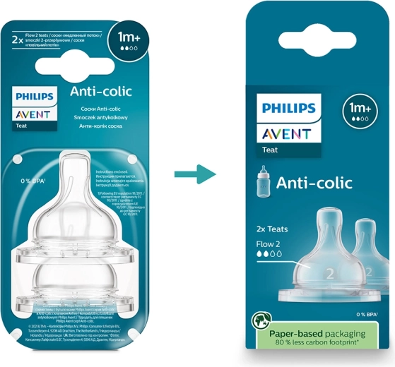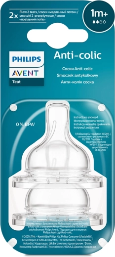 Wysokiej jakości silikonowe smoczki Philips AVENT z technologią Anti-colic zapewniają wolny przepływ dla dzieci od 1 miesiąca. Opatentowany jednokierunkowy zaworek pomaga zmniejszać ryzyko kolki i wzdęć, wpuszczając powietrze do butelki i zapobiegając powstawaniu podciśnienia. Miękki i cienki silikon z wydłużonym żebrowaniem utrzymuje stabilność kształtu, a szeroki kształt wspiera naturalne przysysanie i ułatwia łączenie karmienia piersią i butelką.