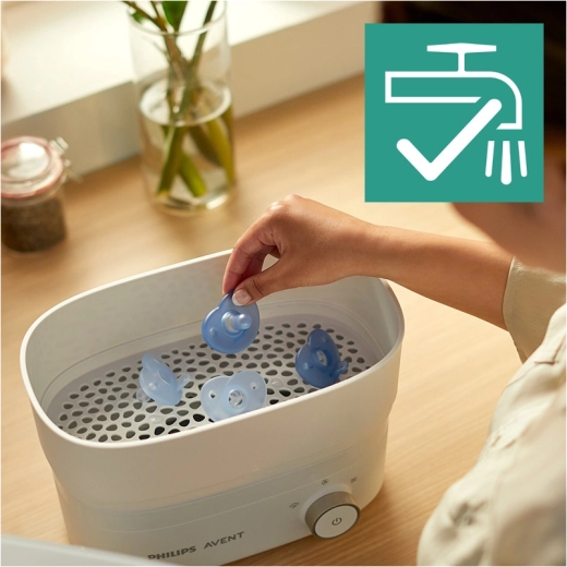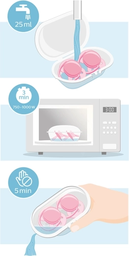 • Higiena bez kompromisów: etui do sterylizacji w kuchence mikrofalowej działa szybko i wygodnie; smoczek można także wygotować lub sterylizować w sterylizatorze parowym.