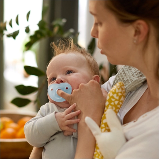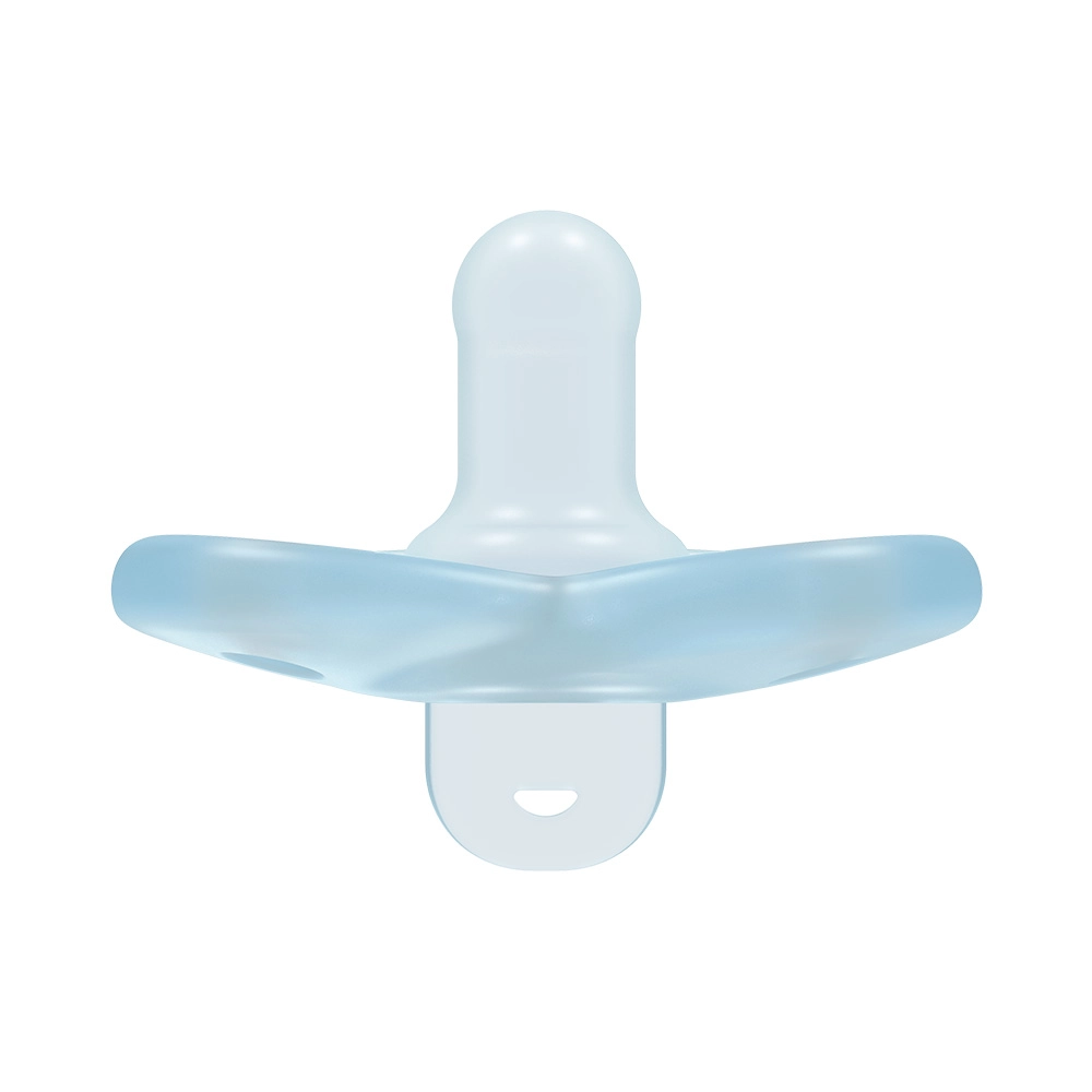 Ergonomiczna tarczka w kształcie serca respektuje naturalne krzywizny twarzy dziecka i zapewnia swobodne oddychanie. Symetryczny, okrągły smoczek jest miękki, wytrzymały i zaprojektowany tak, aby naturalnie układał się w ustach dziecka oraz pomagał równomiernie rozkładać nacisk języka.