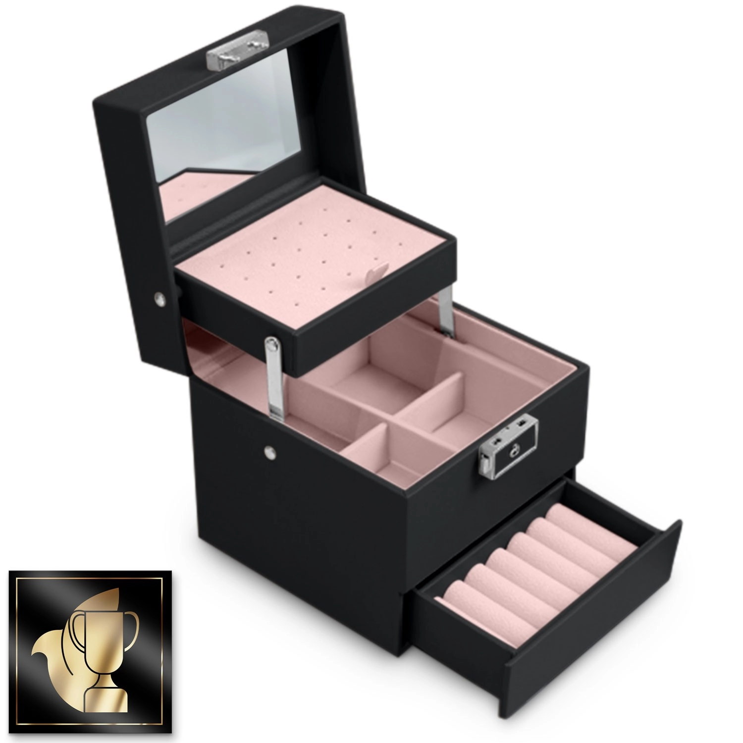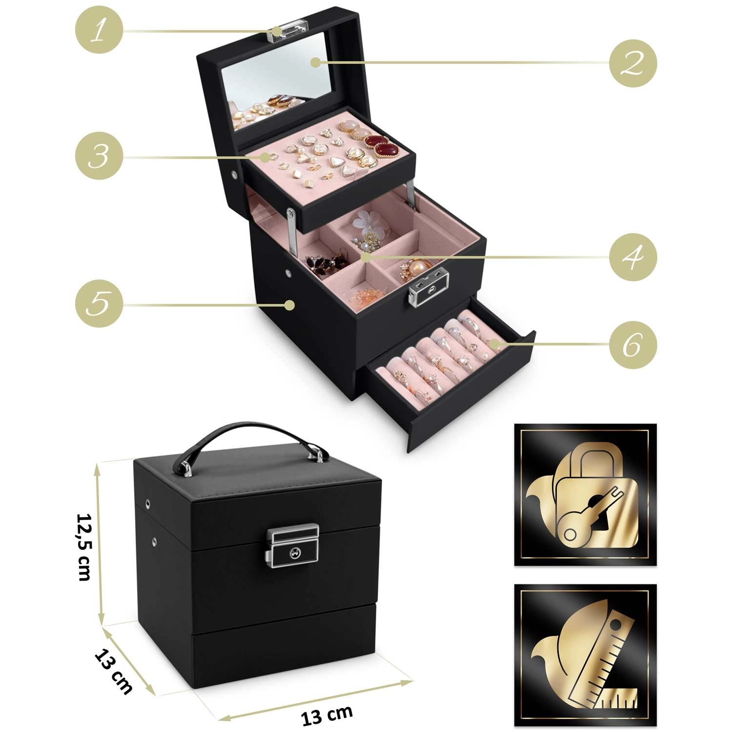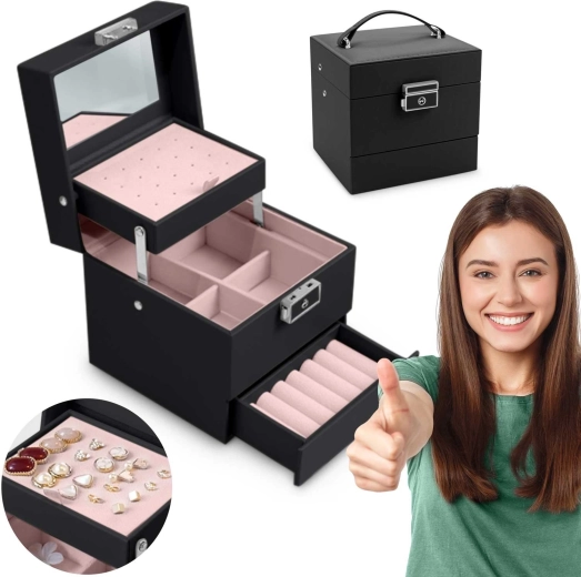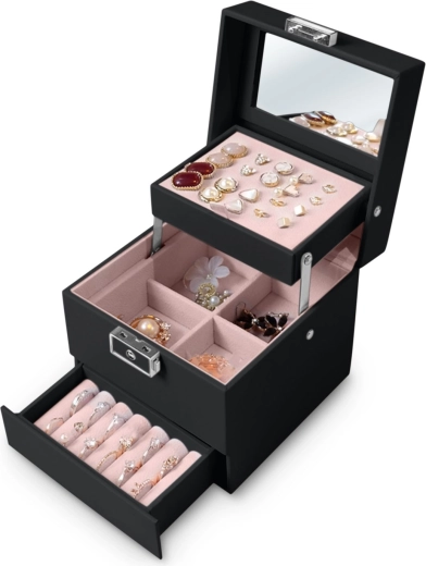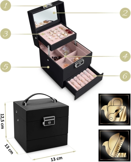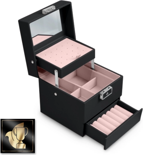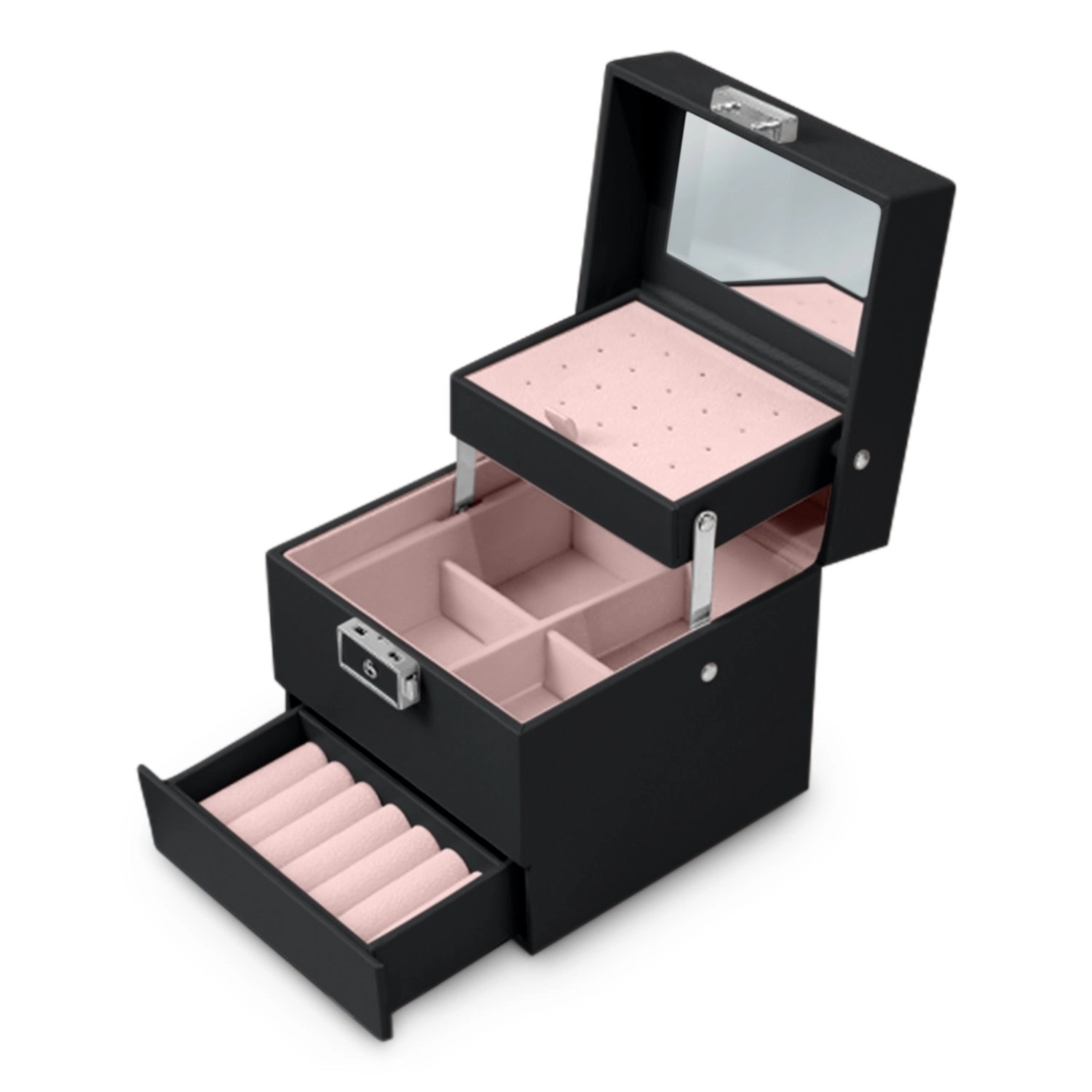 Szkatułka jest lekka, kompaktowa i dzięki rączce idealna także w podróży. Nowoczesny wygląd i precyzyjne detale czynią z niej świetny prezent dla dziewczyn i dorosłych kobiet – uniwersalnego pomocnika do perfekcyjnej organizacji biżuterii.
