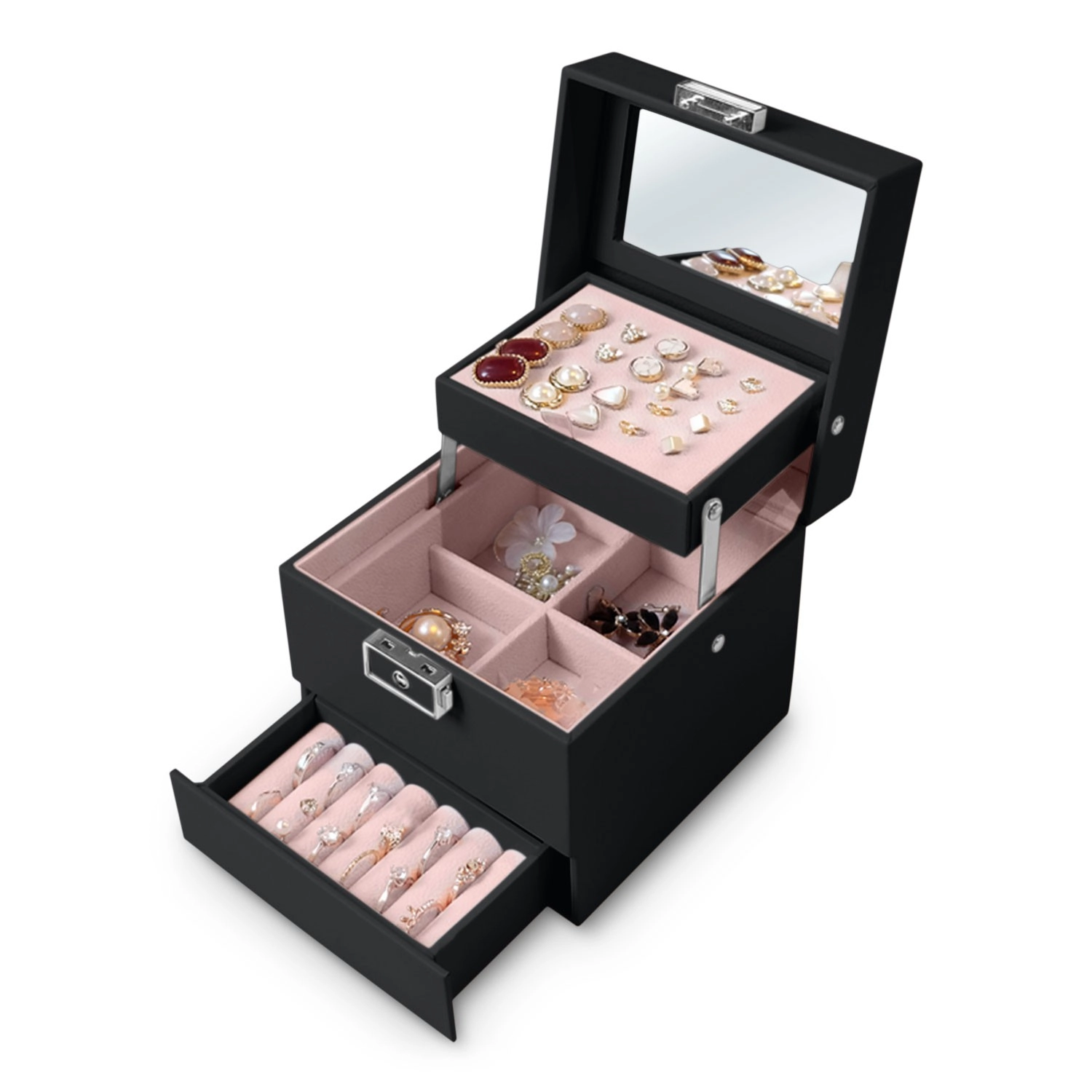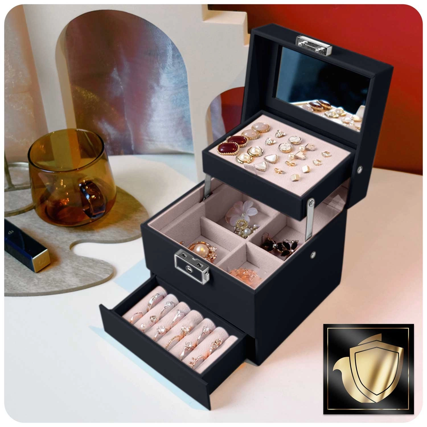 Wyściełane rzędy na pierścionki, perforowana wkładka na kolczyki oraz dzielone przegródki utrzymują biżuterię przejrzyście rozdzieloną i chronioną.