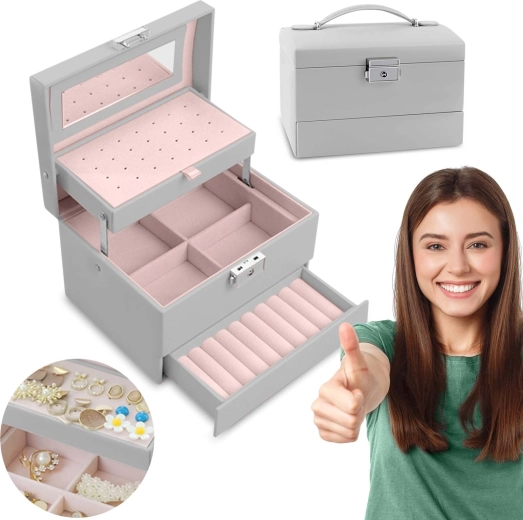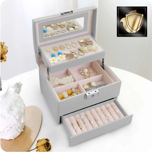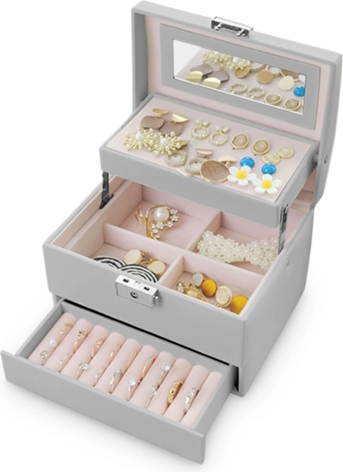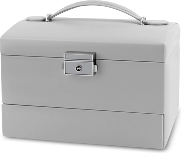 Elegancka szara szkatułka MASSIDO MS-704 łączy stylowy design, przemyślaną organizację i bezpieczne przechowywanie biżuterii. Dzięki zamkowi na kluczyk, praktycznej rączce i lekkiej konstrukcji jest idealna w domu i w podróży. Wewnątrz znajdziesz lusterko, przejrzyste przegródki, miejsce na kolczyki i pierścionki oraz wyjmowane elementy do łatwego powiększenia przestrzeni.
