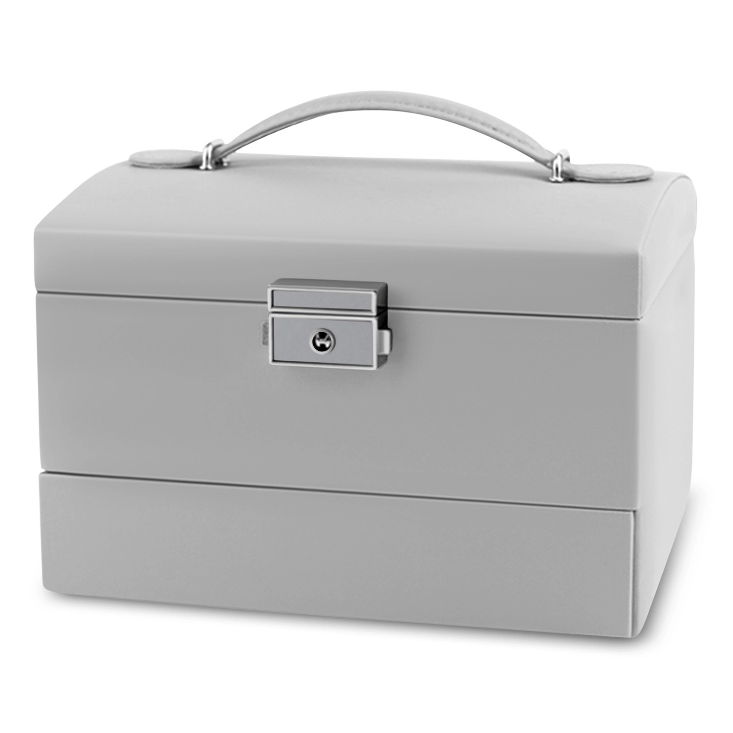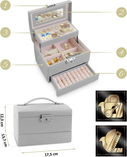 Dzięki zamkowi na kluczyk szkatułka nie otworzy się przypadkowo podczas przenoszenia, a biżuteria pozostanie bezpieczna. Ergonomiczna rączka i lekka konstrukcja czynią z niej świetną towarzyszkę podróży i elegancki dodatek do toaletki.