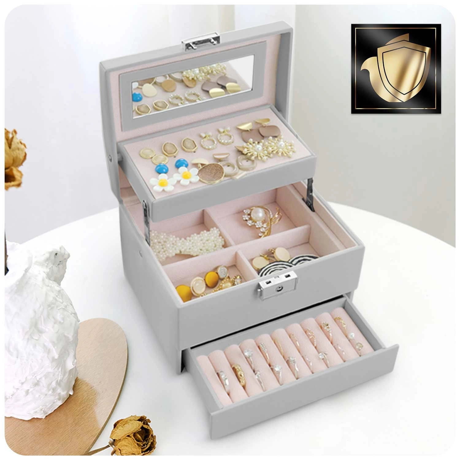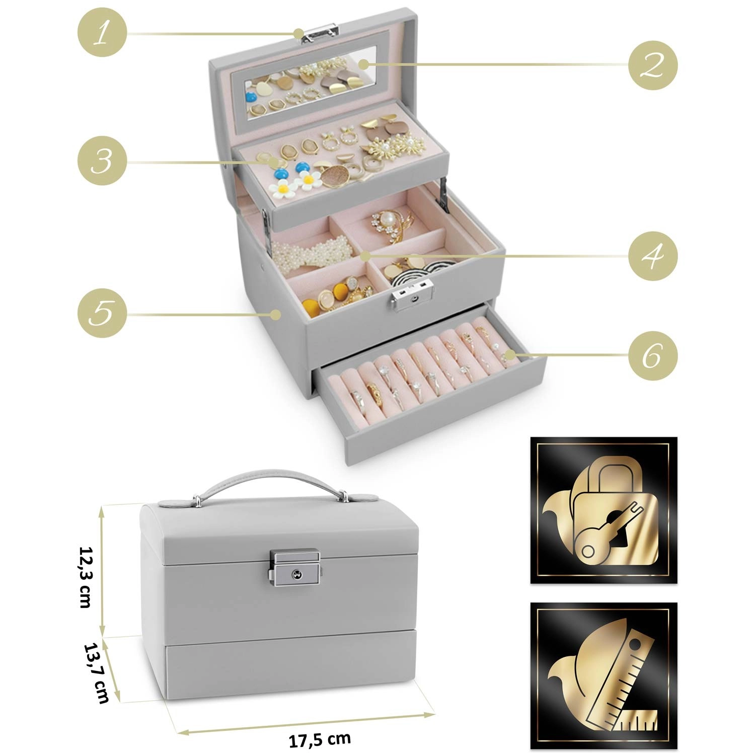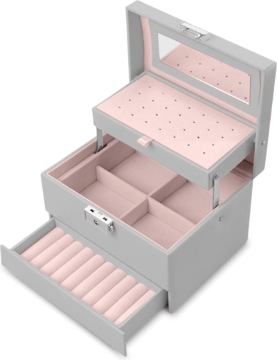 Lusterko pod wiekiem, perforowana płyta na kolczyki, oddzielne sekcje oraz wałeczki na pierścionki utrzymują wszystko w porządku i pod ręką.