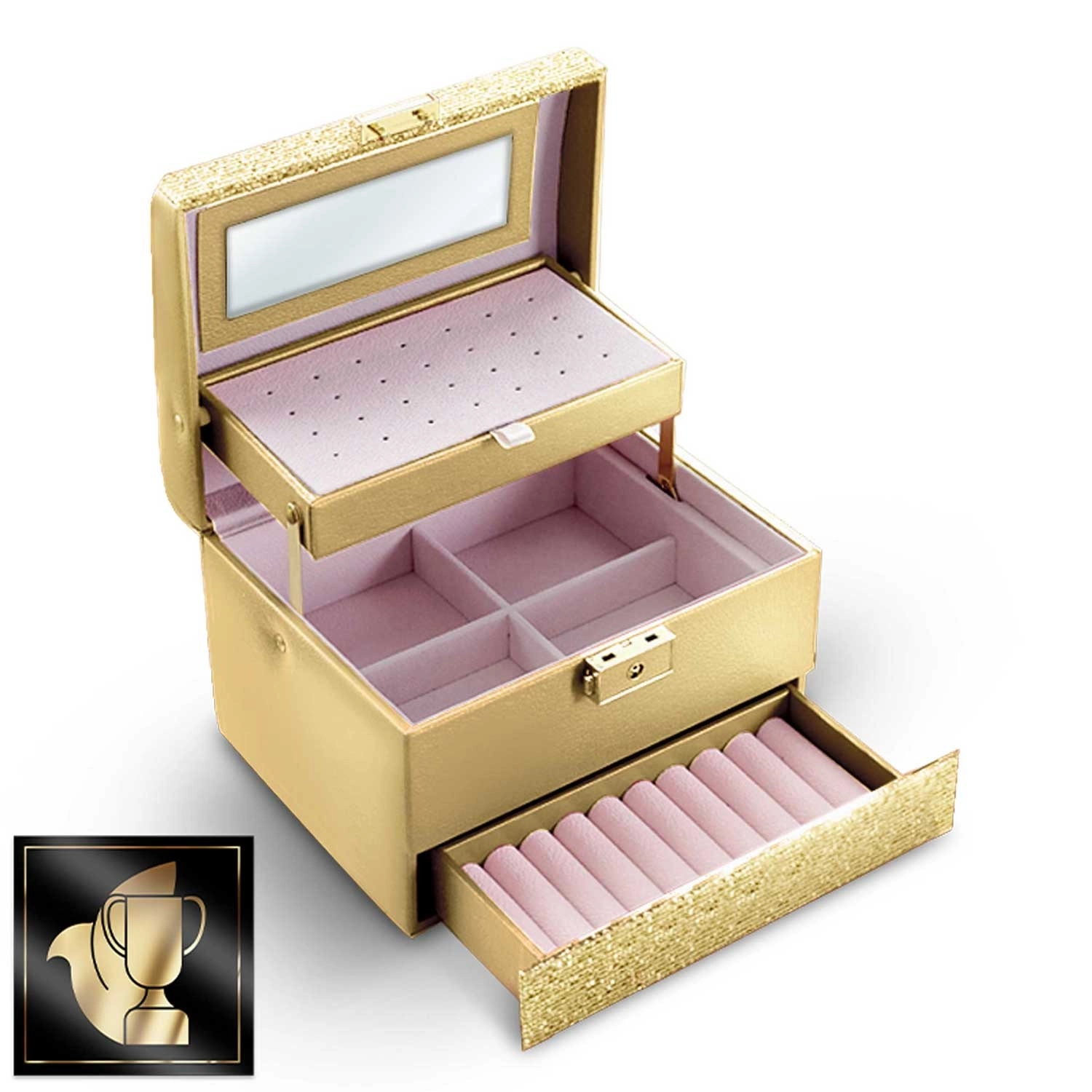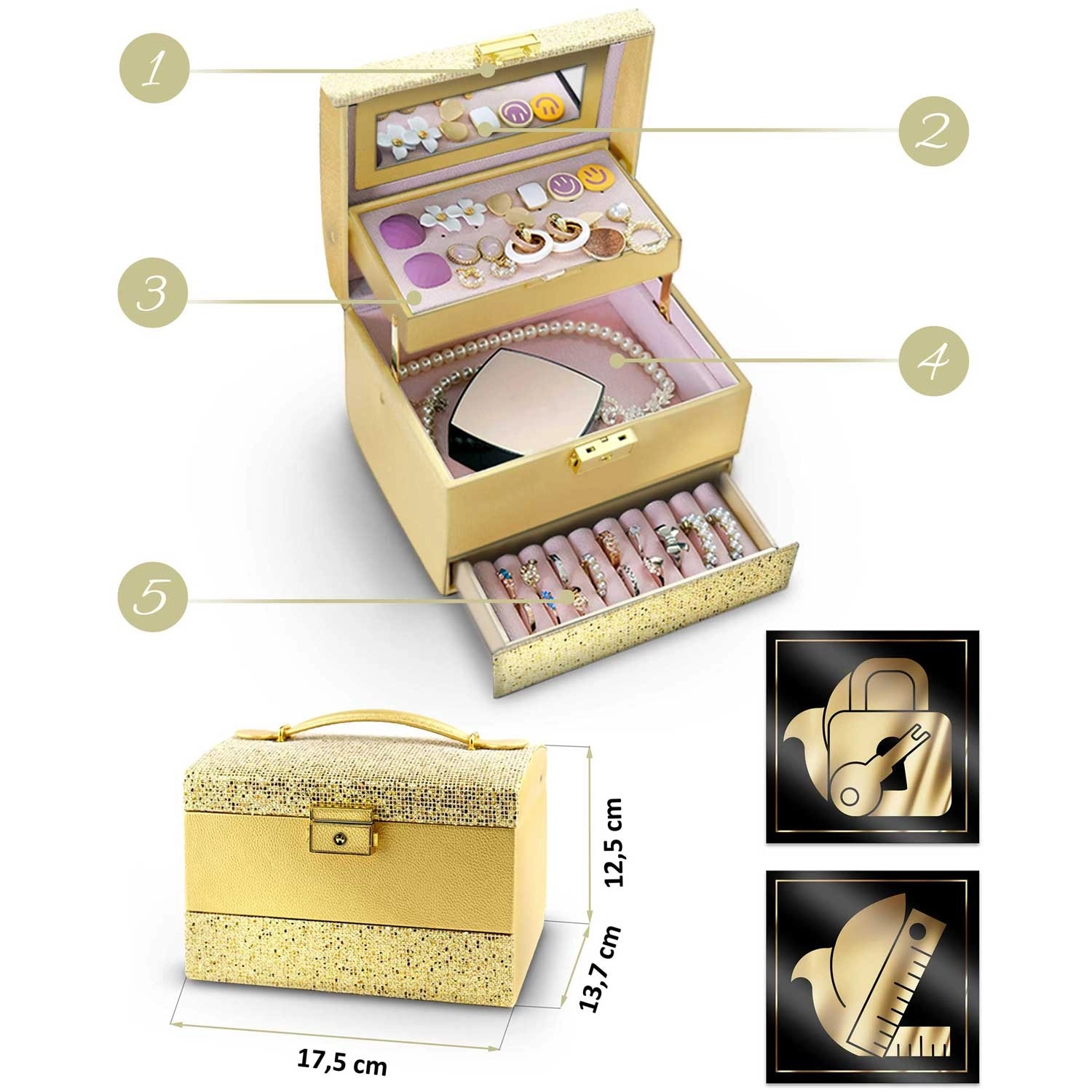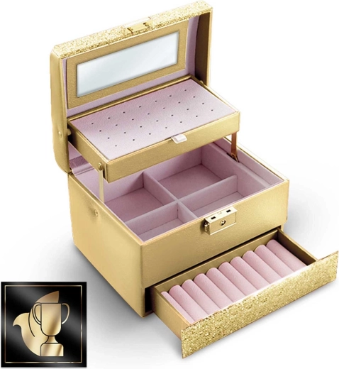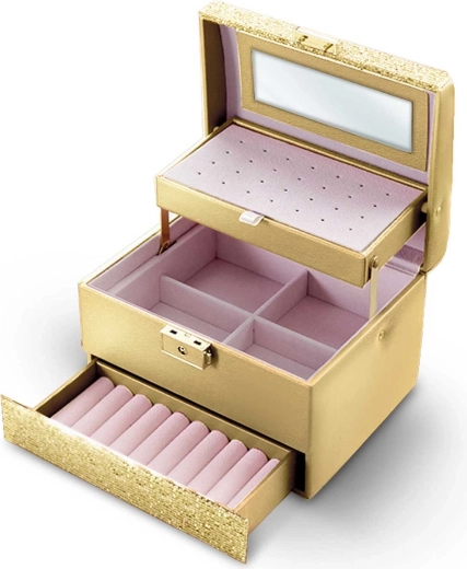 Górna półka z perforacją na kolczyki, podzielone przegródki oraz osobna szuflada z wałeczkami na pierścionki utrzymają Twoją kolekcję idealnie uporządkowaną i chronioną przed zarysowaniami.