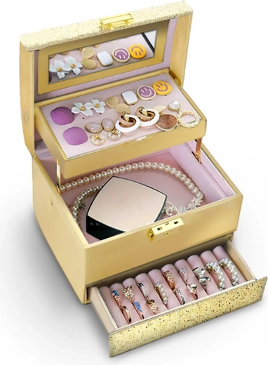 Dzięki wyjmowanej górnej półce z otworami na kolczyki, miękkim wałeczkom na pierścionki oraz podzielonym przegródkom na łańcuszki czy bransoletki, biżuterię będziesz mieć zawsze pod ręką. Zintegrowane lusterko ułatwia szybkie przymierzanie i łączenie dodatków.