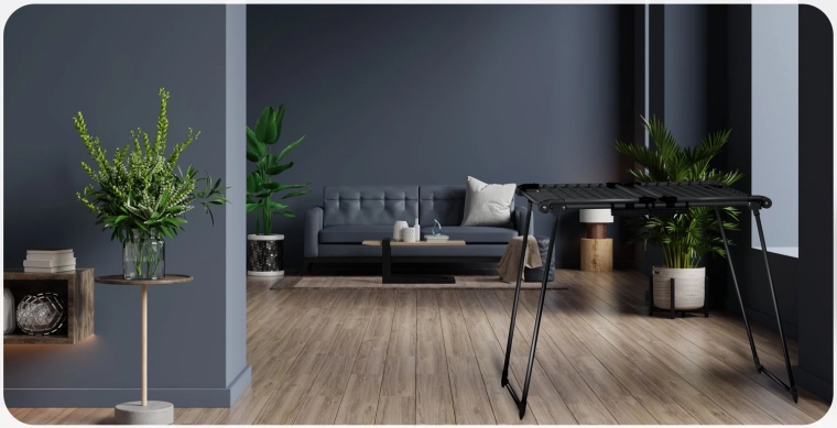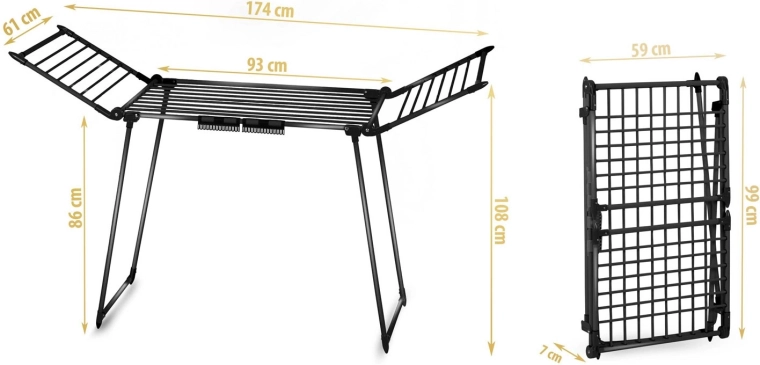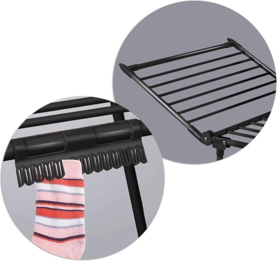 Grubsze pręty pomagają ograniczać powstawanie zagnieceń, dzięki czemu pranie po wysuszeniu często nie wymaga prasowania. Praktyczne uchwyty na bieliznę i skarpety oszczędzają miejsce na głównych prętach, a antypoślizgowe nóżki zapewniają stabilność na różnych powierzchniach. Suszak szybko się składa i rozkłada, a po złożeniu zajmuje minimum miejsca.