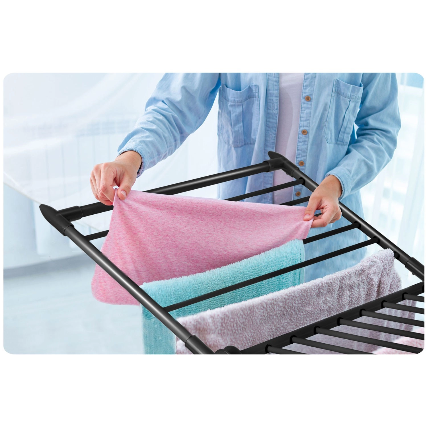 Duża pojemność pozwala rozwiesić jednocześnie zarówno większe pranie, jak i drobiazgi, aby wszystko schło szybko i równomiernie.