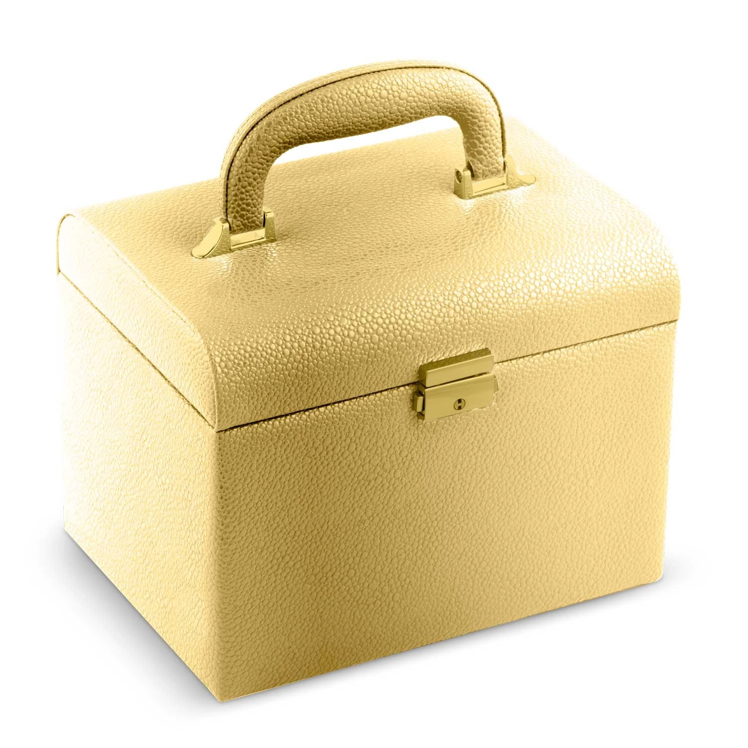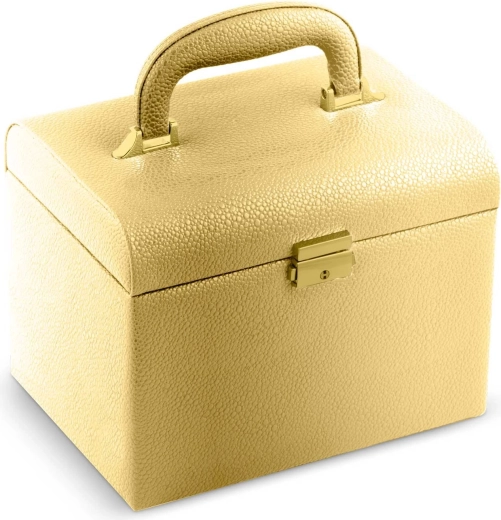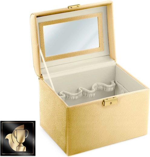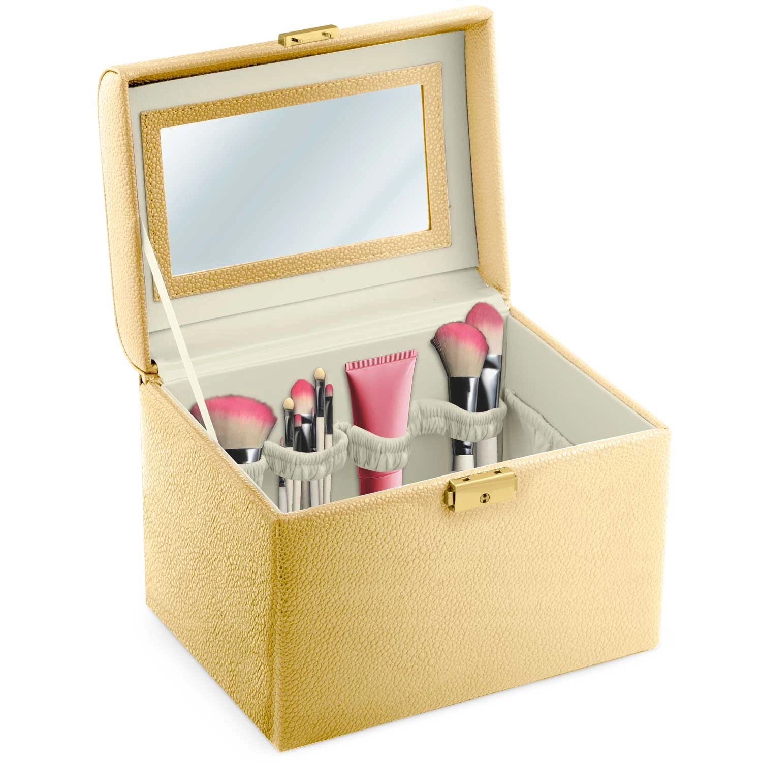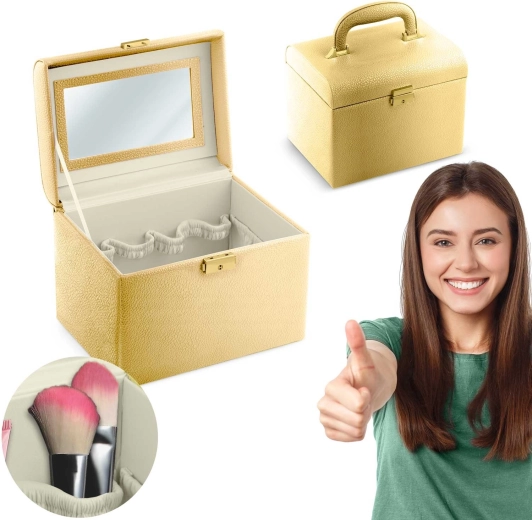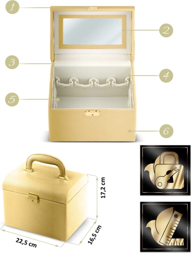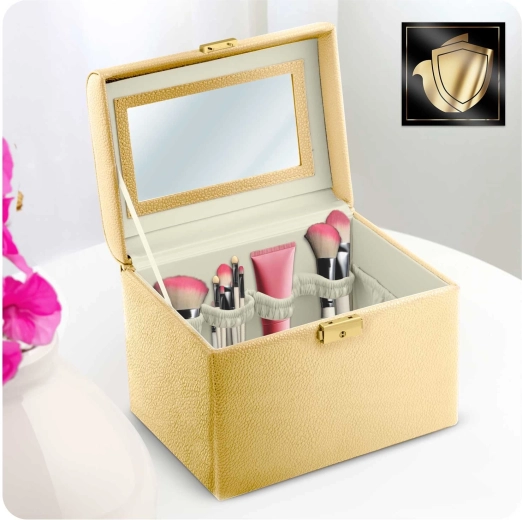 Złoty kosmetyczny kuferek MASSIDO MS-706 łączy styl, trwałość i maksymalną praktyczność. Kompaktowe wymiary 22,5 × 16,5 × 17,2 cm wygodnie mieszczą się na toaletce i w torbie podróżnej, a jednocześnie oferują zaskakująco dużo miejsca na kosmetyki, biżuterię i akcesoria. Zintegrowane lusterko i uporządkowane wnętrze umożliwiają szybkie makijażowe poprawki i idealny porządek zawsze i wszędzie.