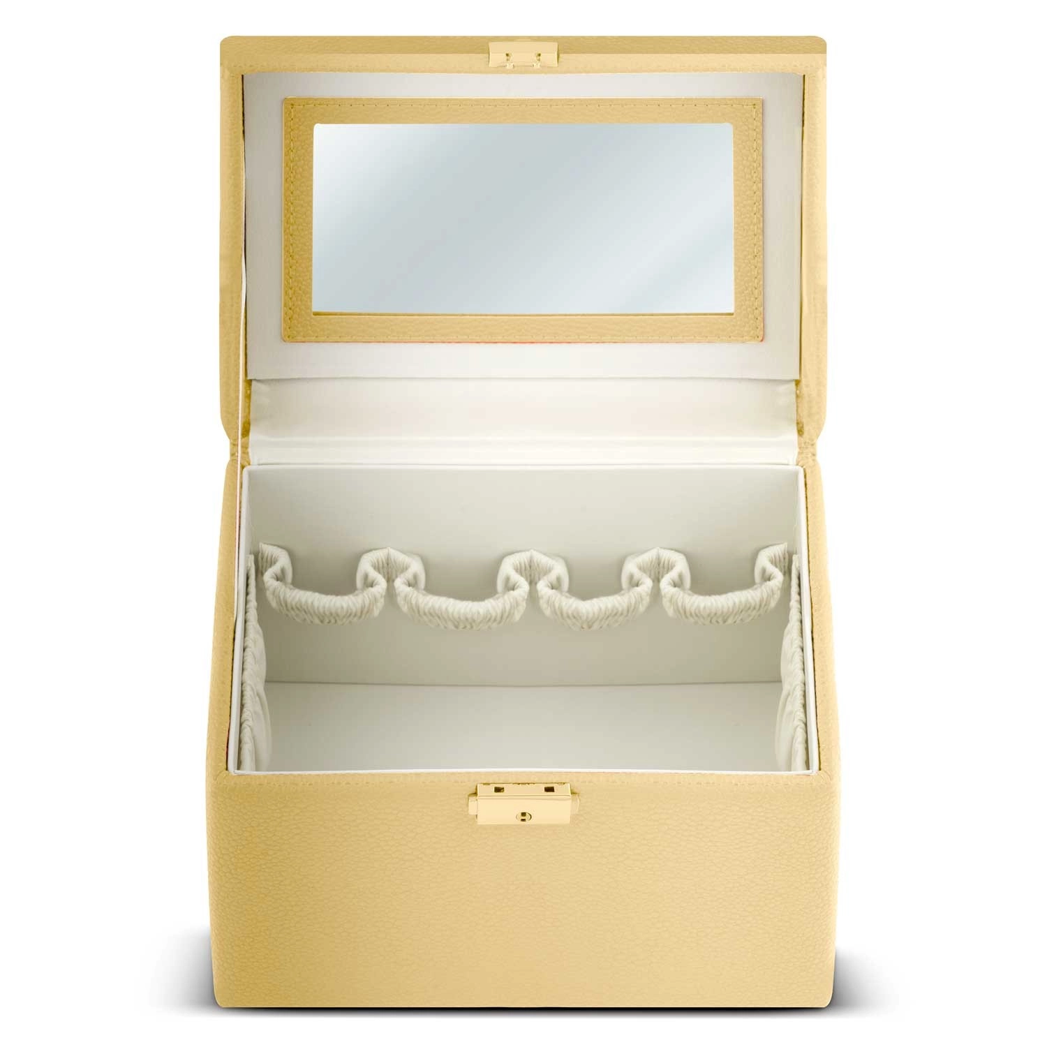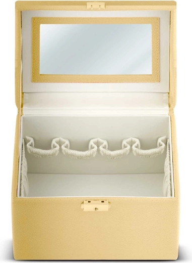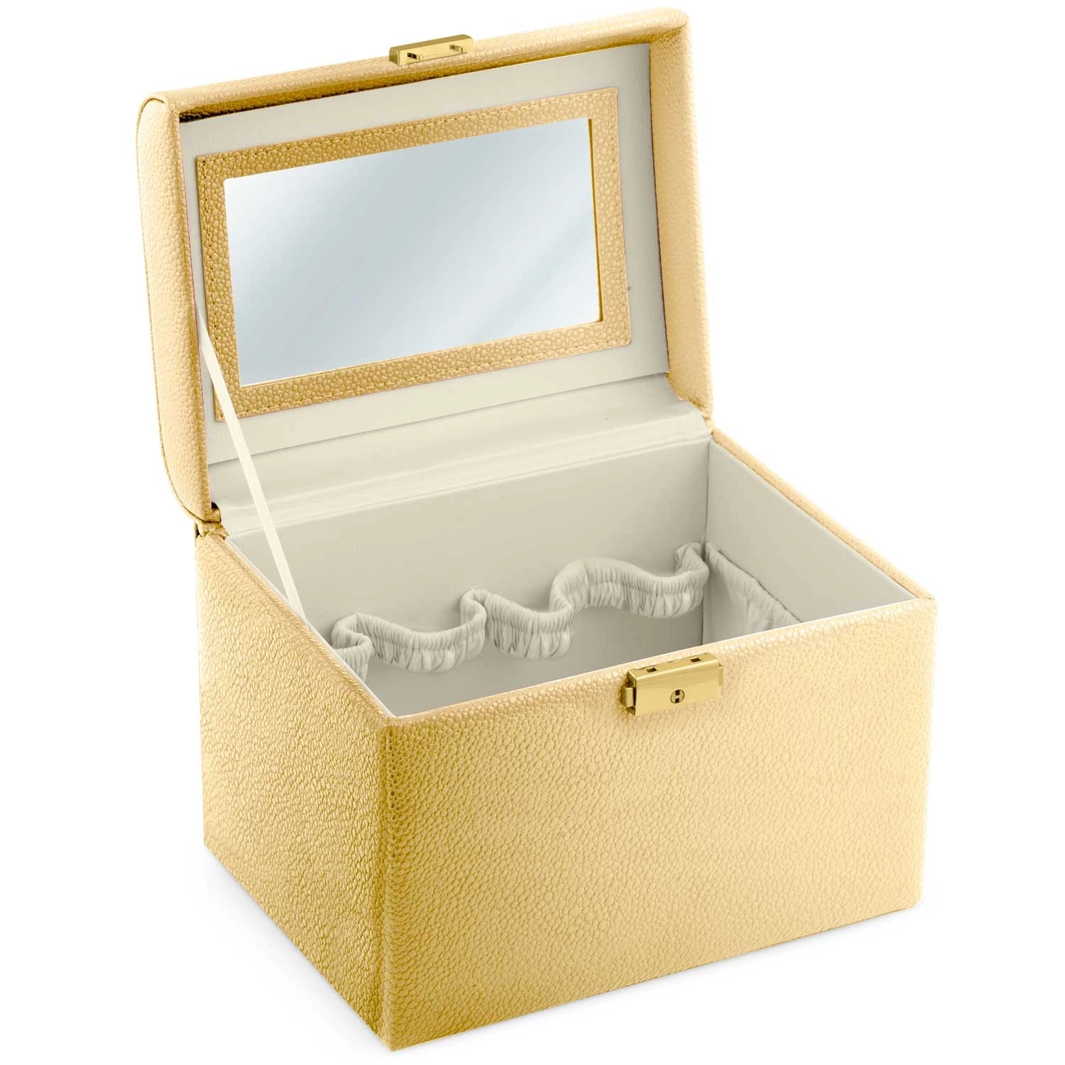 Kuferek jest zamykany na kluczyk, a wewnątrz pokrywy ma praktyczne lusterko do szybkich poprawek wyglądu w domu i w podróży.