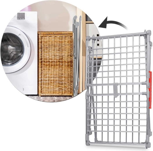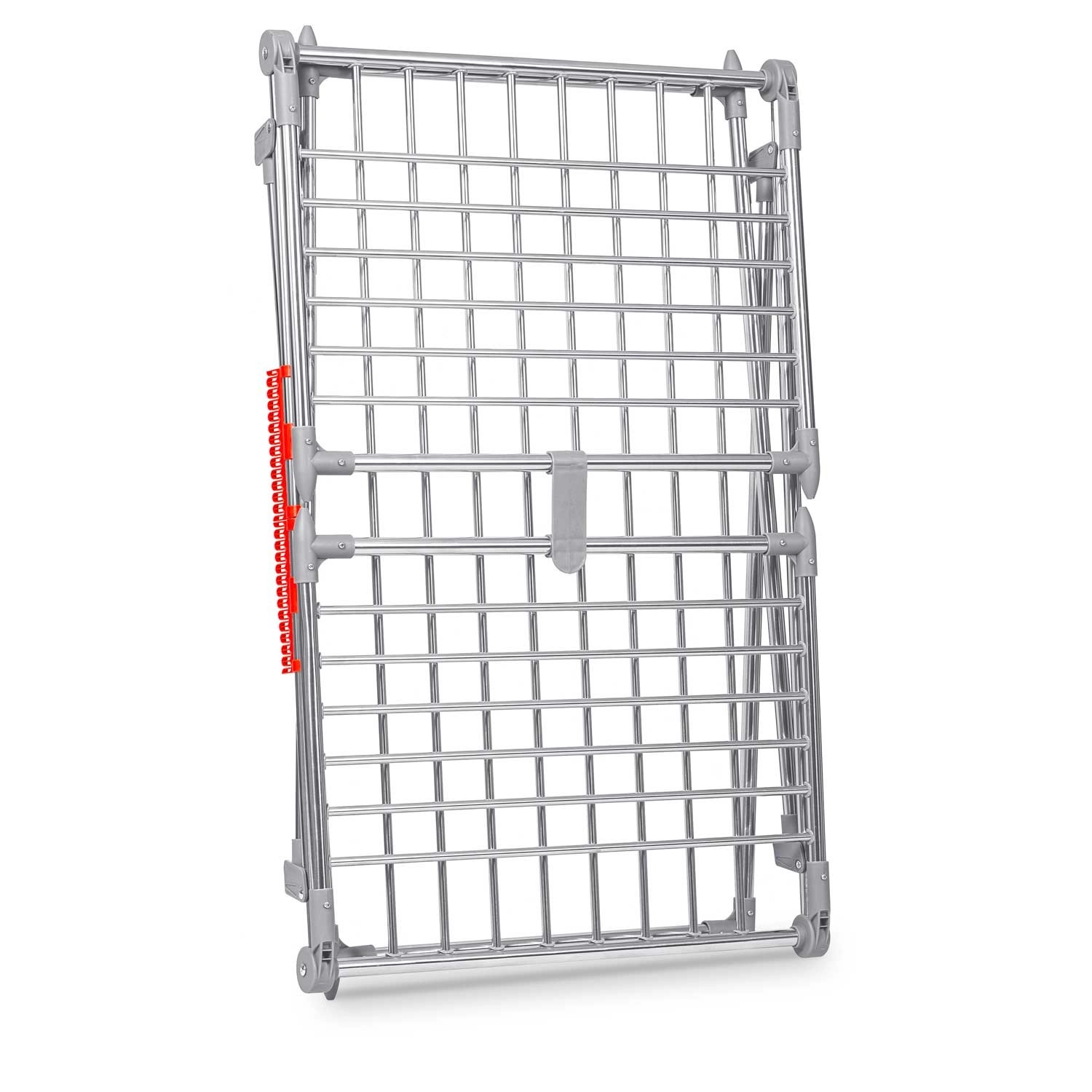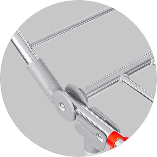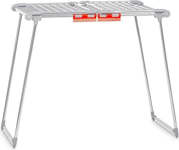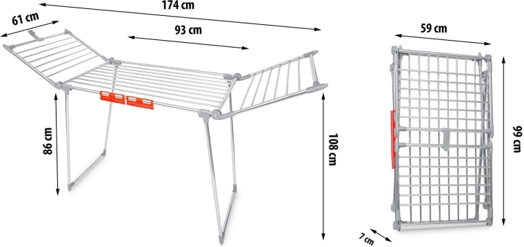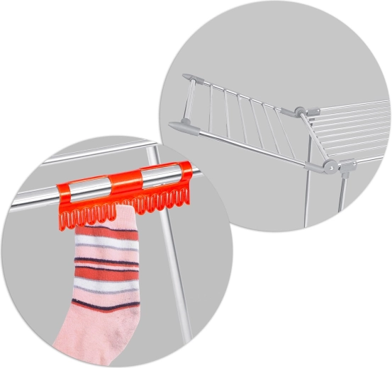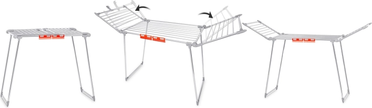 Praktyczny składany suszak na pranie ze stali nierdzewnej o pojemności suszenia 19 m z dwiema rozkładanymi skrzydłami dla dodatkowej przestrzeni. Wyposażony w uchwyty na drobną bieliznę (skarpetki, bielizna), stabilną metalową konstrukcję oraz antypoślizgowe stopki. Dzięki grubszym prętom ogranicza powstawanie niepotrzebnych zagnieceń, a pranie schnie szybciej i równomierniej. Proste i szybkie składanie oraz rozkładanie oszczędza miejsce w każdym domu.