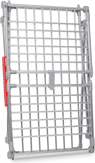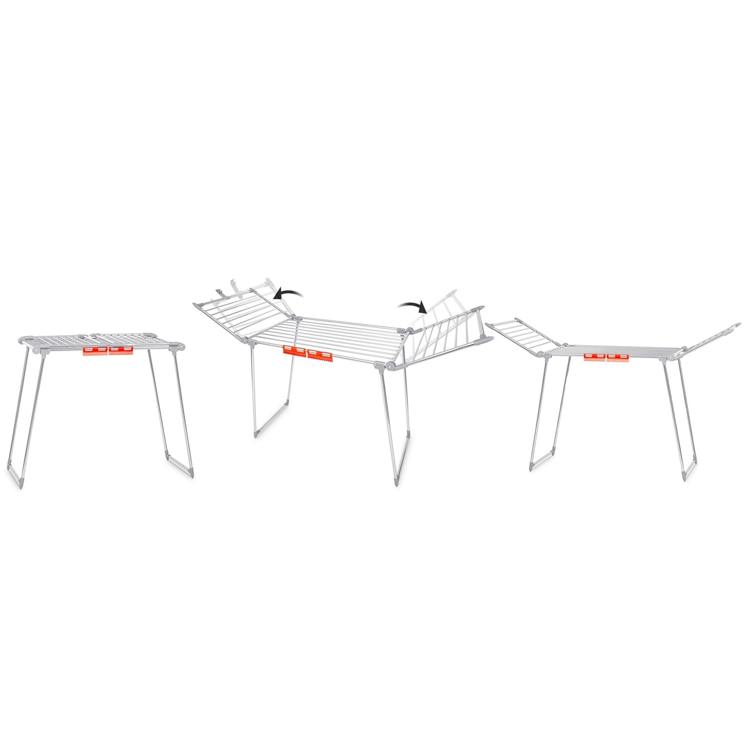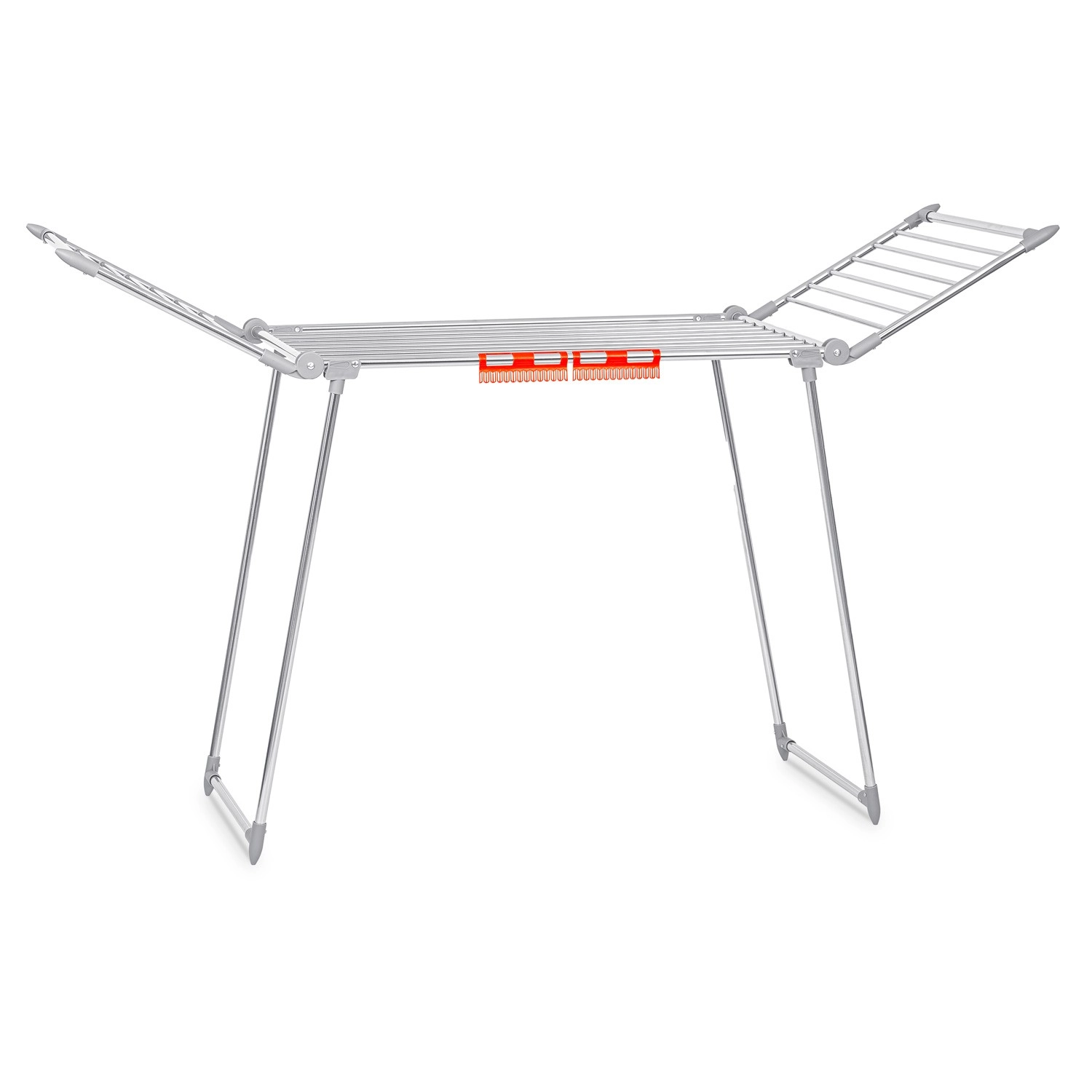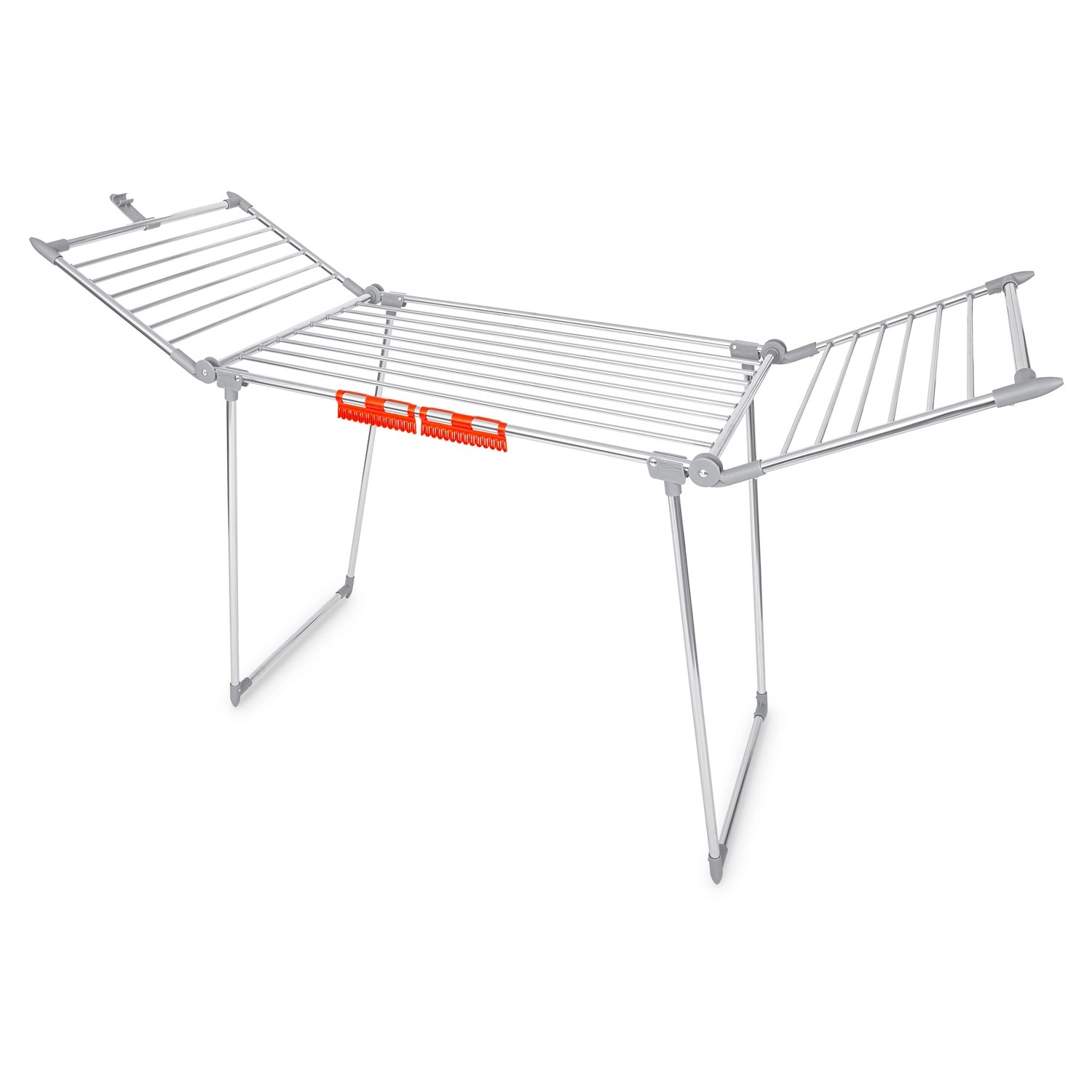 Praktyczny składany suszak na pranie ze stali nierdzewnej o pojemności suszenia 19 m z dwiema rozkładanymi skrzydłami dla dodatkowej przestrzeni. Wyposażony w uchwyty na drobną bieliznę (skarpetki, bielizna), stabilną metalową konstrukcję oraz antypoślizgowe stopki. Dzięki grubszym prętom ogranicza powstawanie niepotrzebnych zagnieceń, a pranie schnie szybciej i równomierniej. Proste i szybkie składanie oraz rozkładanie oszczędza miejsce w każdym domu.