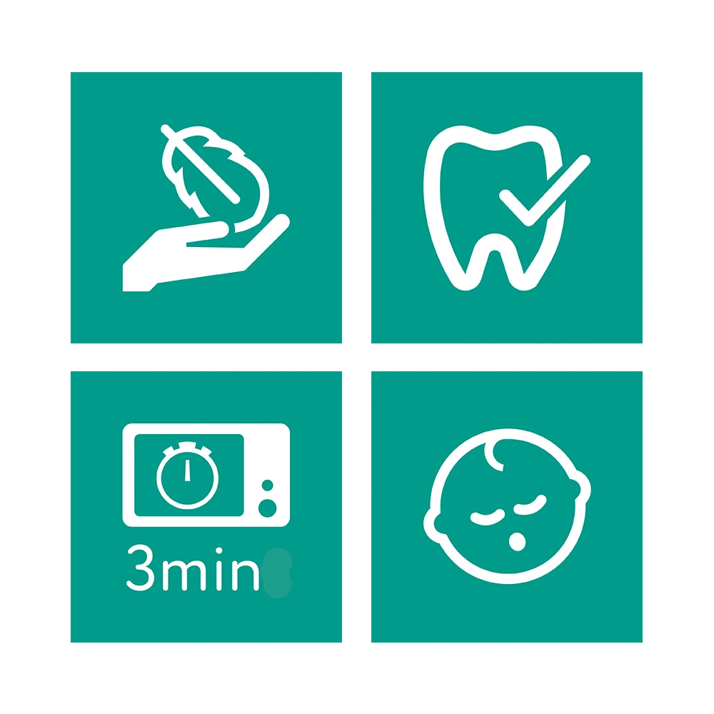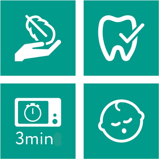 Dla zdrowego rozwoju jamy ustnej końcówka została zaprojektowana tak, aby była optymalna dla dziąseł i pierwszych ząbków. Praktyczne etui transportowo‑sterylizacyjne chroni smoczki przed zabrudzeniami i umożliwia szybką sterylizację w kuchence mikrofalowej.