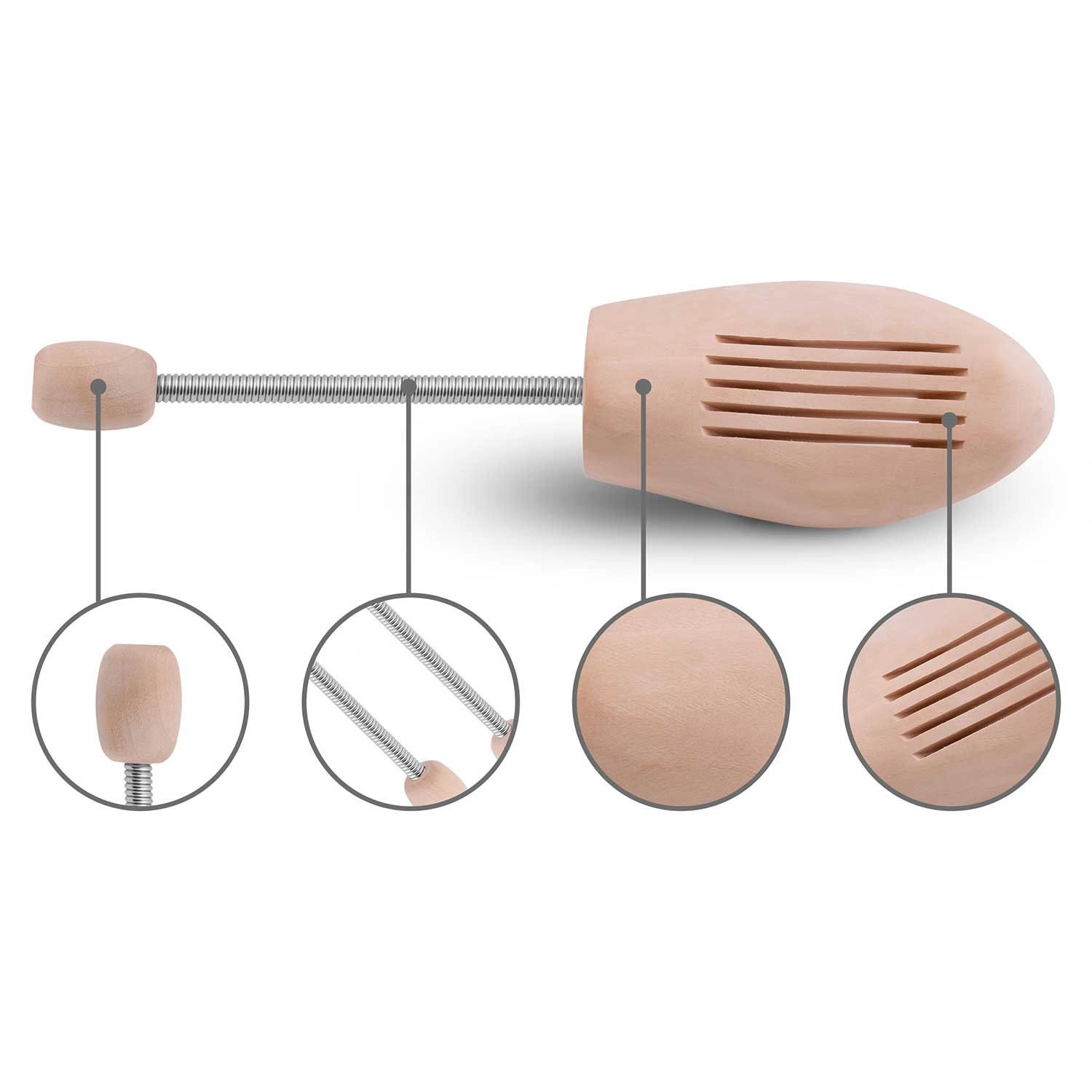 Uniwersalna konstrukcja sprężynowa wytwarza stały, lecz delikatny nacisk, który pomaga zachować oryginalną sylwetkę i zapobiegać pęknięciom w miejscu zgięcia. Każda para jest unikatowa dzięki naturalnemu usłojeniu drewna – drobne różnice wizualne są naturalną cechą materiału.