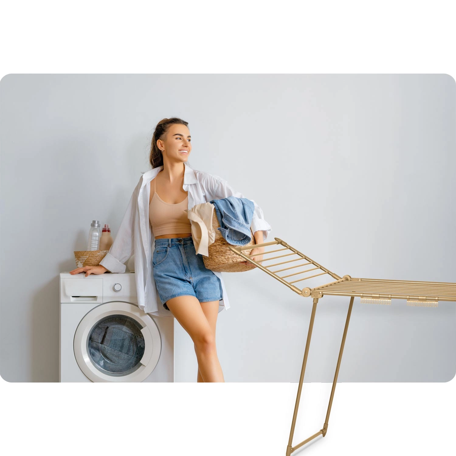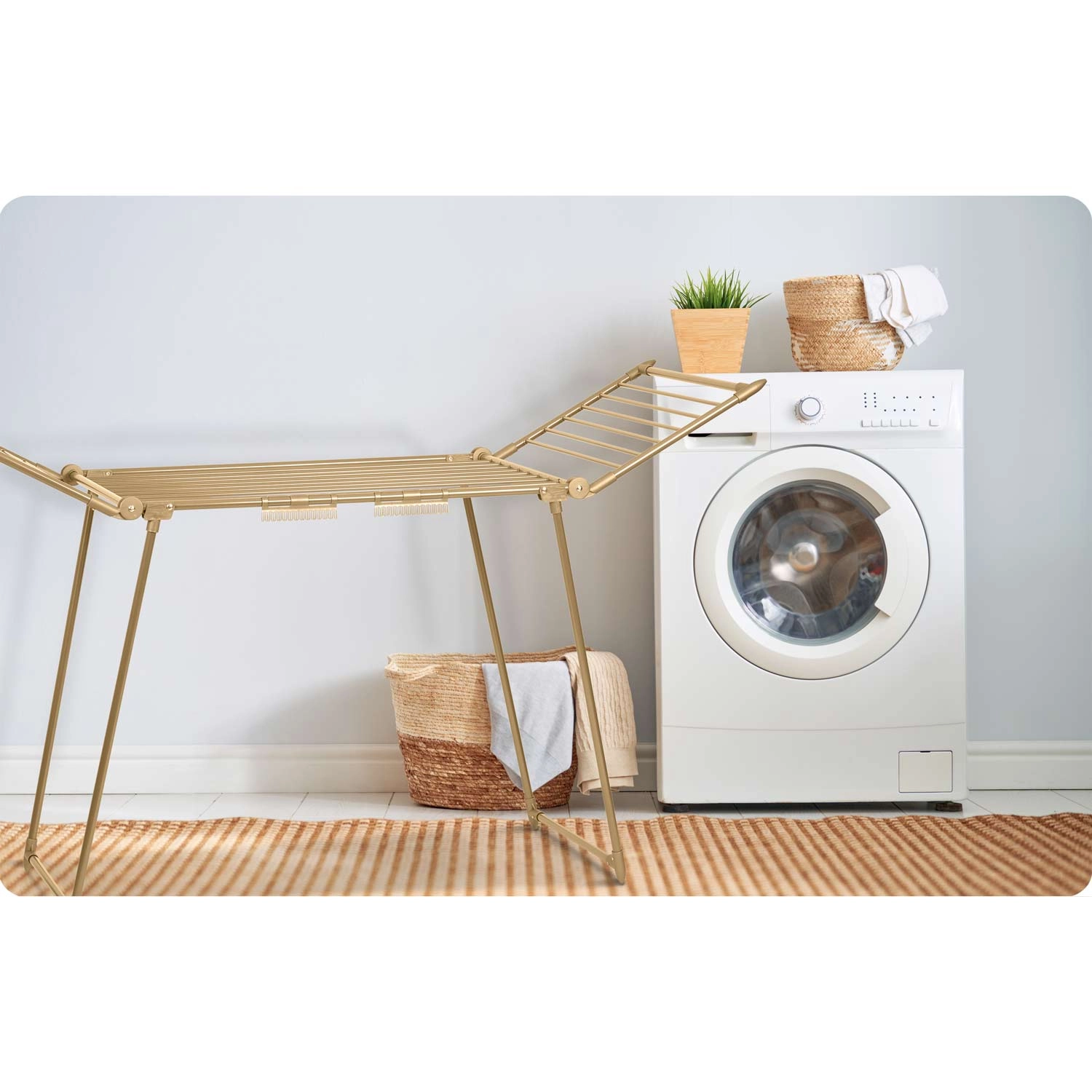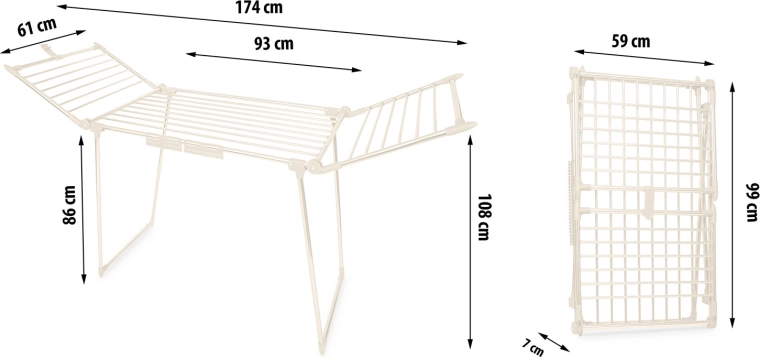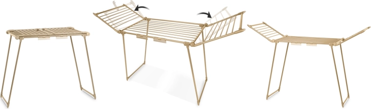 Dzięki dwóm rozkładanym skrzydłom i zintegrowanym uchwytom na skarpetki i bieliznę wykorzystasz każdy centymetr. Po wysuszeniu prania suszarkę łatwo złożyć do kompaktowej formy i odłożyć za szafę lub pralkę.