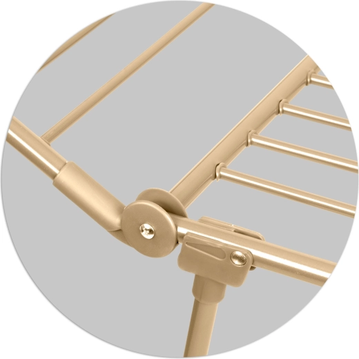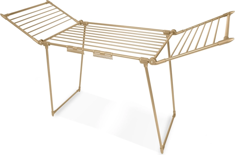 Massido Debora Gold łączy funkcjonalność i elegancję. Metalowa konstrukcja ze złotym metalicznym wykończeniem jest trwała, stabilna i łatwa w utrzymaniu. Szeroko rozstawione grube pręty zmniejszają gniecenie tkanin i wspierają szybszą cyrkulację powietrza dla równomiernego schnięcia bez konieczności prasowania.