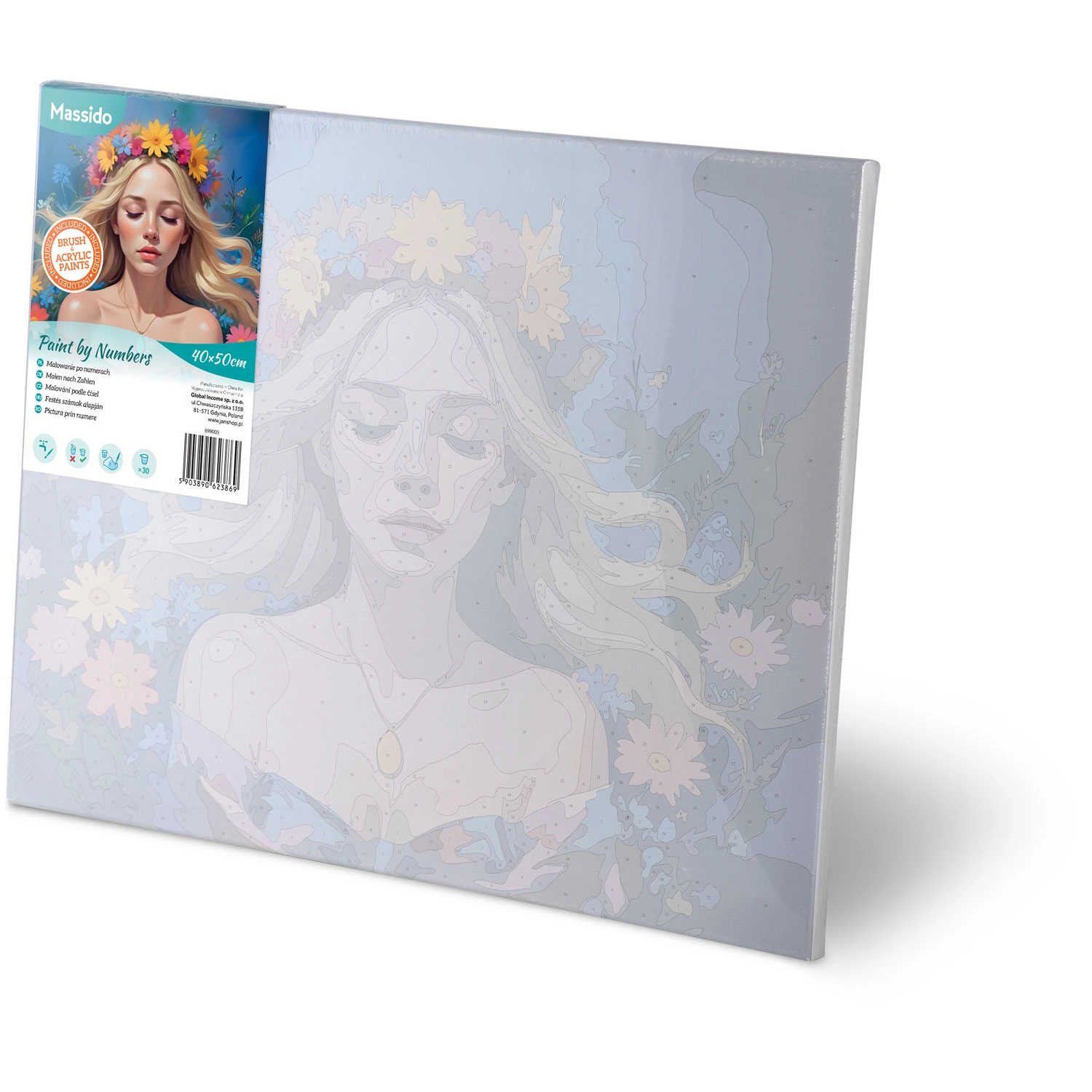 Wstępnie zadrukowane płótno na ramie, 30 farb akrylowych, 3 pędzle i haczyki do zawieszenia. Otwórz opakowanie i zacznij tworzyć bez dodatkowych zakupów.