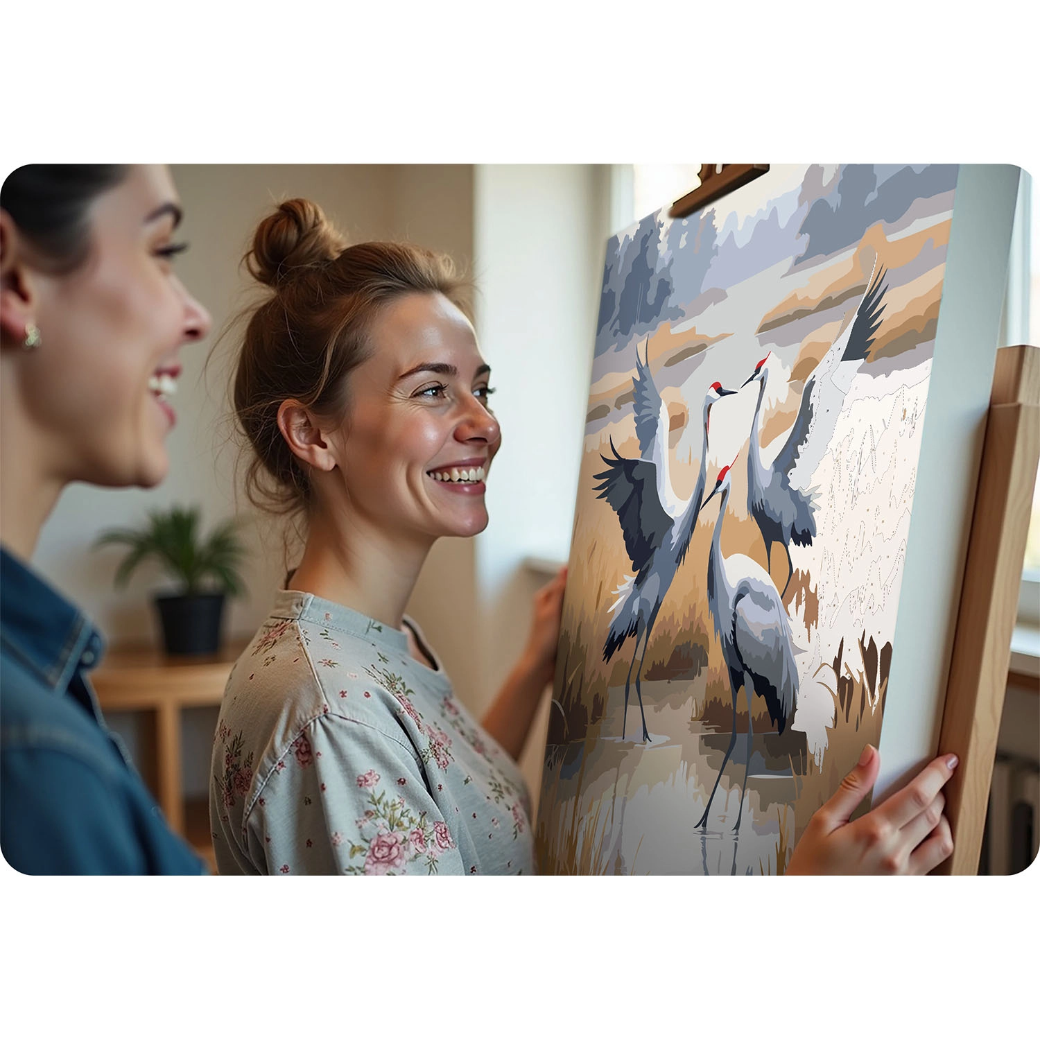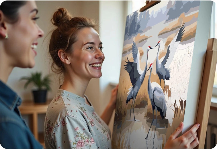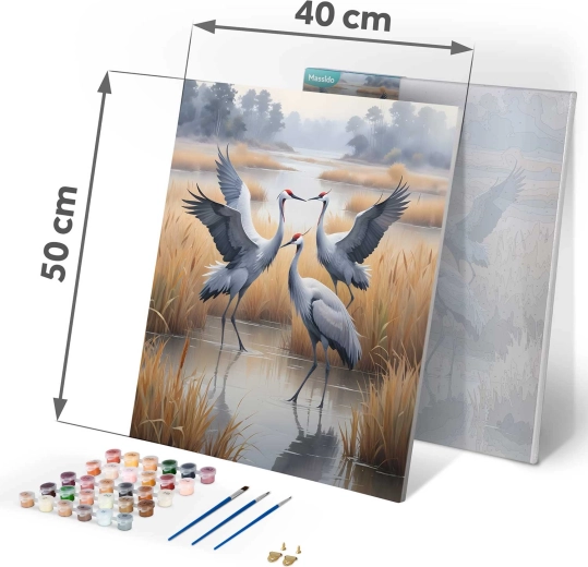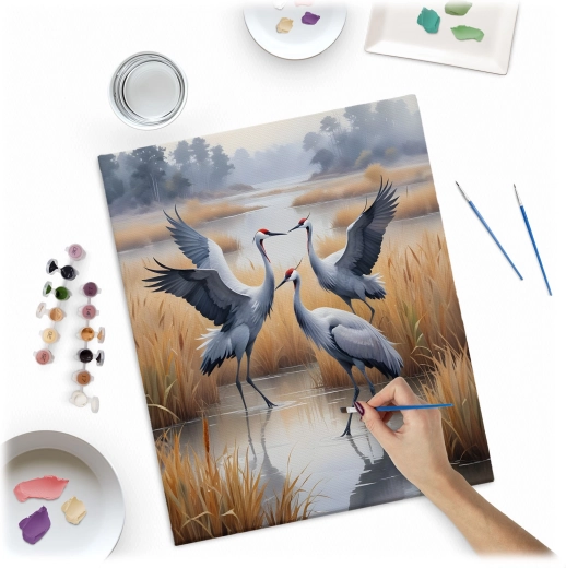 Kreatywny relaks dla każdego. Wstępnie nadrukowane, ponumerowane płótno poprowadzi Cię krok po kroku, a dzięki kolorowemu podkładowi z delikatnym wzorem malowanie będzie płynne nawet dla zupełnych początkujących. Nasycone, kryjące farby akrylowe zapewnią piękny efekt bez prześwitywania, a motyw żurawi doda wnętrzu eleganckiej, naturalnej atmosfery.