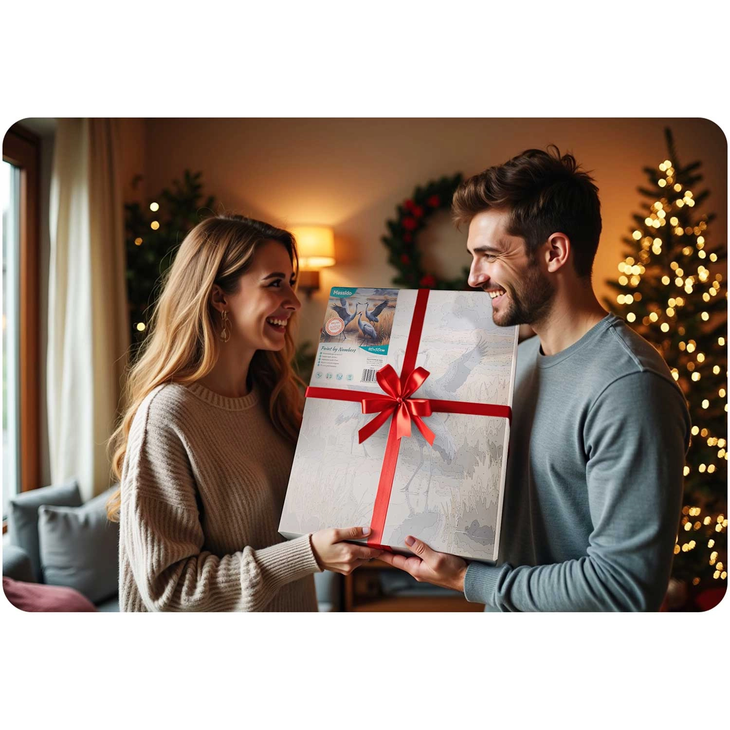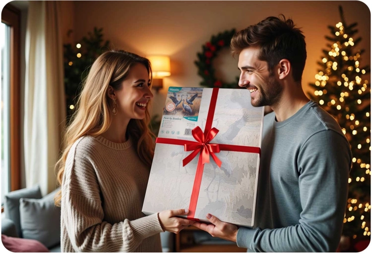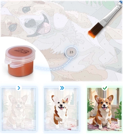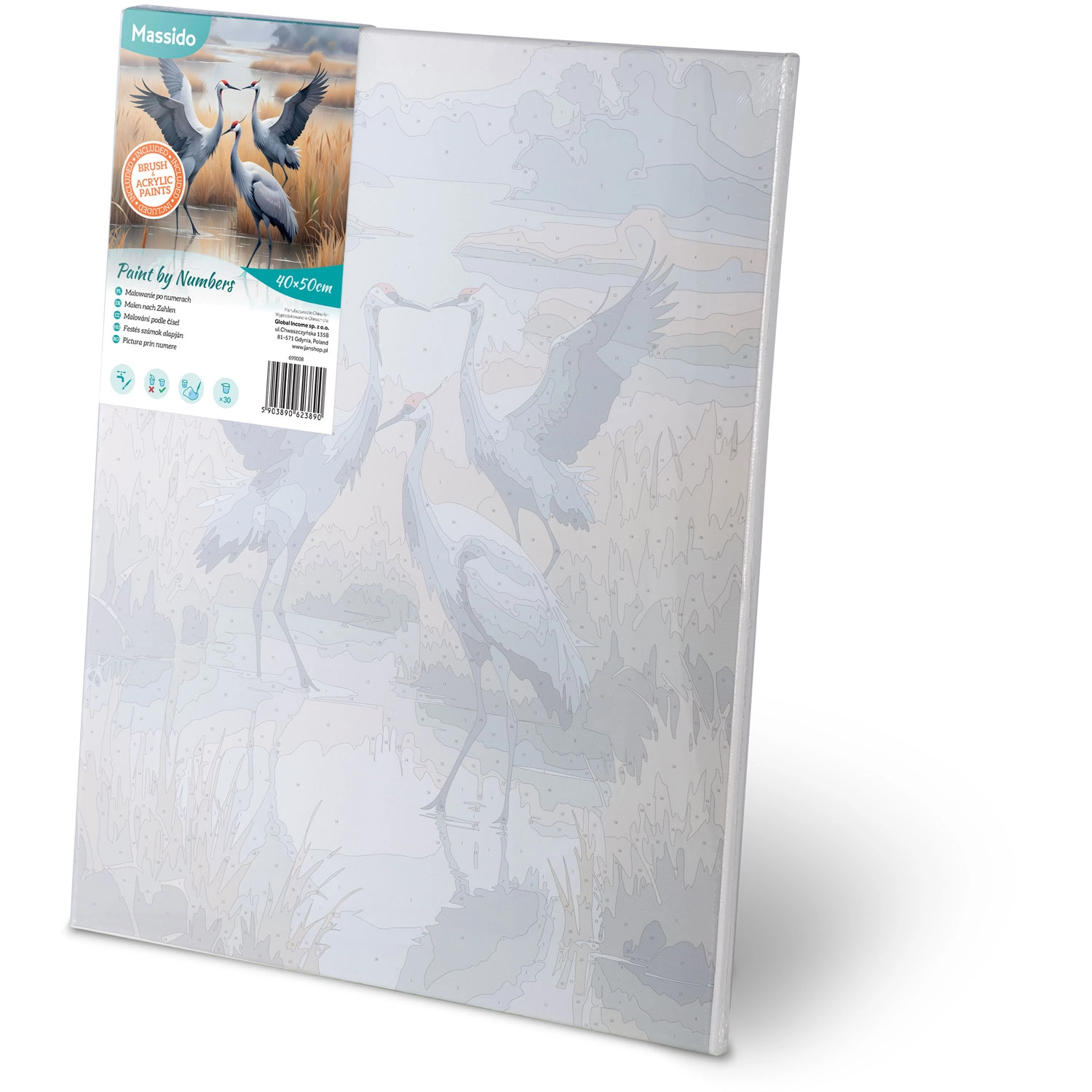 W opakowaniu znajdziesz wszystko, czego potrzebujesz: płótno 40 × 50 cm na drewnianej ramie typu blejtram, 30 ponumerowanych kubeczków z farbami, 3 pędzle w różnych rozmiarach do detali i powierzchni, papierowy wzór A4 oraz haczyki ze śrubkami do łatwego zawieszenia gotowego obrazu.