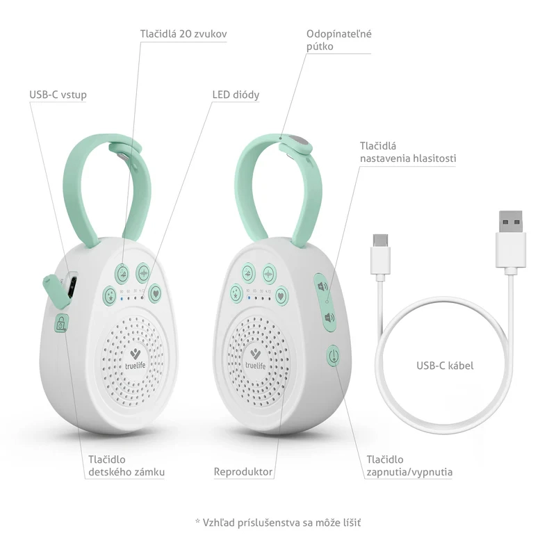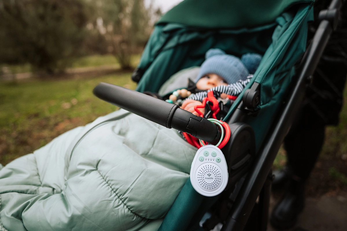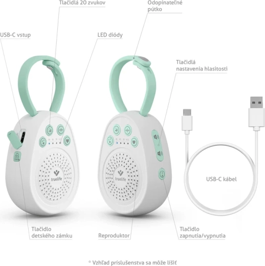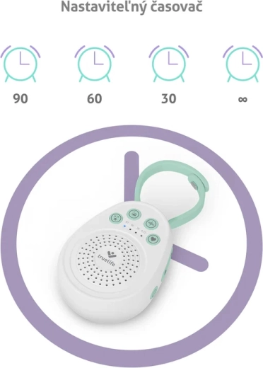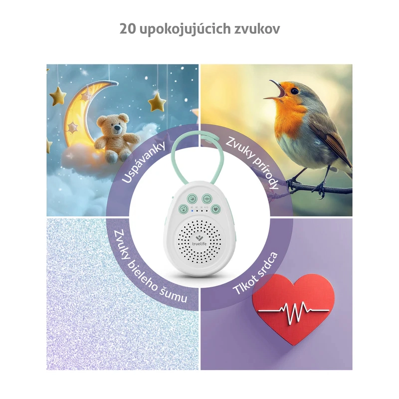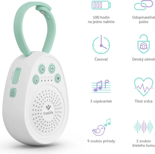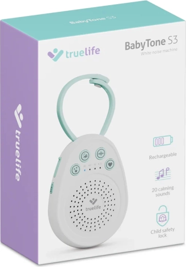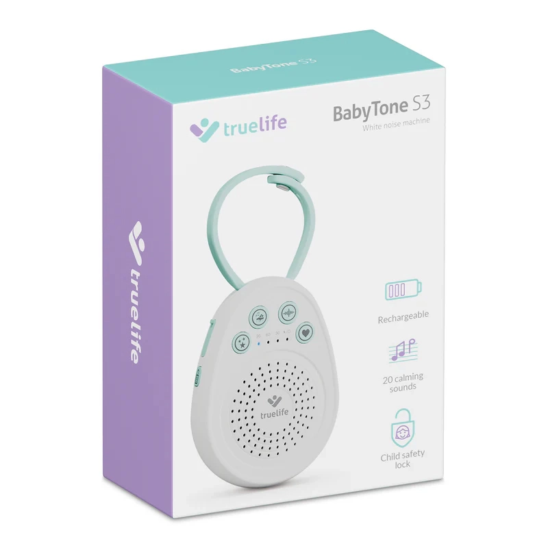 Ukoisz swoje maleństwo do spokojnego snu dzięki przenośnemu usypiaczowi TrueLife BabyTone S3. Oferuje aż 20 kojących dźwięków, w tym melodie, odgłosy natury, biały szum oraz odgłos bicia serca. Dzięki czasowi pracy baterii do 100 godzin, timerowi 30/60/90 min, pamięci ostatniego dźwięku i praktycznej odpinanej pętli jest idealny do łóżeczka, wózka i w podróży. Bezpieczne wykonanie bez BPA oraz blokada rodzicielska zapewniają spokojne i bezpieczne użytkowanie.